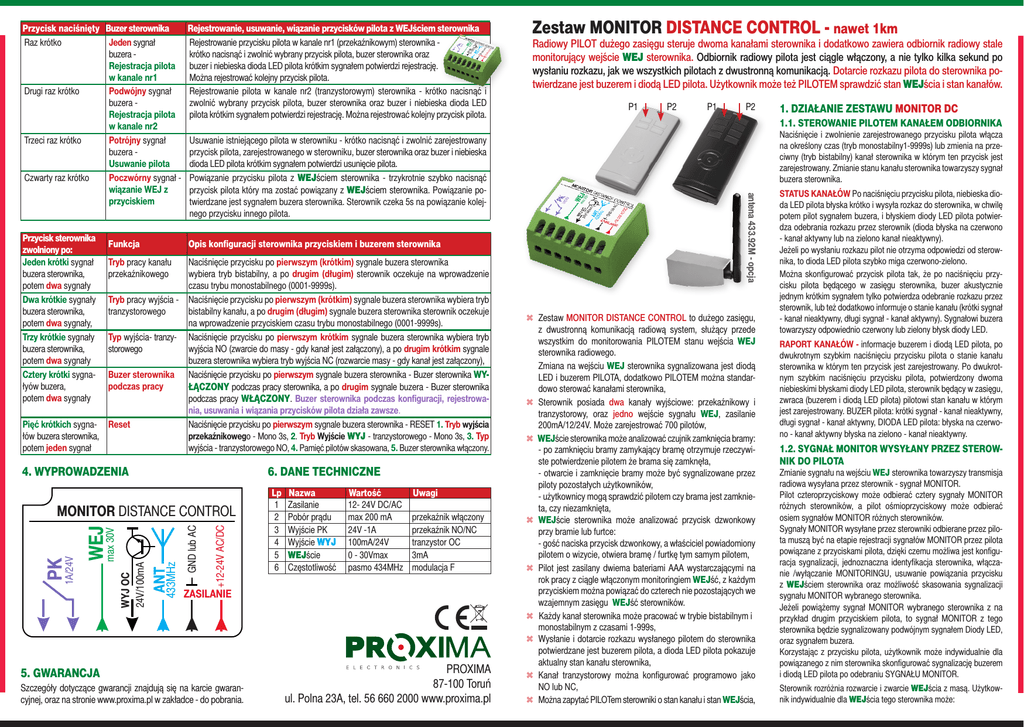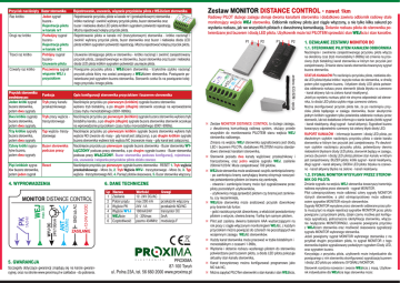 Przycisk sterownika zwolniony po: Jeden krótki sygnał buzera sterownika, potem dwa sygnały Dwa krótkie sygnały buzera sterownika, potem dwa sygnały, Trzy krótkie sygnały buzera sterownika, potem dwa sygnały Cztery krótki sygnałyów buzera, potem dwa sygnały Funkcja Rejestrowanie, usuwanie, wiązanie przycisków pilota z WEJściem sterownika Rejestrowanie przycisku pilota w kanale nr1 (przekaźnikowym) sterownika krótko nacisnąć i zwolnić wybrany przycisk pilota, buzer sterownika oraz buzer i niebieska dioda LED pilota krótkim sygnałem potwierdzi rejestrację. Można rejestrować kolejny przycisk pilota. Rejestrowanie pilota w kanale nr2 (tranzystorowym) sterownika - krótko nacisnąć i zwolnić wybrany przycisk pilota, buzer sterownika oraz buzer i niebieska dioda LED pilota krótkim sygnałem potwierdzi rejestrację. Można rejestrować kolejny przycisk pilota. Usuwanie istniejącego pilota w sterowniku - krótko nacisnąć i zwolnić zarejestrowany przycisk pilota, zarejestrowanego w sterowniku, buzer sterownika oraz buzer i niebieska dioda LED pilota krótkim sygnałem potwierdzi usunięcie pilota. Powiązanie przycisku pilota z WEJściem sterownika - trzykrotnie szybko nacisnąć przycisk pilota który ma zostać powiązany z WEJściem sterownika. Powiązanie potwierdzane jest sygnałem buzera sterownika. Sterownik czeka 5s na powiązanie kolejnego przycisku innego pilota. Opis konfiguracji sterownika przyciskiem i buzerem sterownika Tryb pracy kanału przekaźnikowego Naciśnięcie przycisku po pierwszym (krótkim) sygnale buzera sterownika wybiera tryb bistabilny, a po drugim (długim) sterownik oczekuje na wprowadzenie czasu trybu monostabilnego (0001-9999s). Tryb pracy wyjścia - Naciśnięcie przycisku po pierwszym (krótkim) sygnale buzera sterownika wybiera tryb bistabilny kanału, a po drugim (długim) sygnale buzera sterownika sterownik oczekuje tranzystorowego na wprowadzenie przyciskiem czasu trybu monostabilnego (0001-9999s). Typ wyjścia- tranzy- Naciśnięcie przycisku po pierwszym krótkim sygnale buzera sterownika wybiera tryb storowego wyjścia NO (zwarcie do masy - gdy kanał jest załączony), a po drugim krótkim sygnale buzera sterownika wybiera tryb wyjścia NC (rozwarcie masy - gdy kanał jest załączony), Buzer sterownika Naciśnięcie przycisku po pierwszym sygnale buzera sterownika - Buzer sterownika WYpodczas pracy ŁĄCZONY podczas pracy sterownika, a po drugim sygnale buzera - Buzer sterownika podczas pracy WŁĄCZONY. Buzer sterownika podczas konfiguracji, rejestrowania, usuwania i wiązania przycisków pilota działa zawsze. Pięć krótkich sygna- Reset Naciśnięcie przycisku po pierwszym sygnale buzera sterownika - RESET 1. Tryb wyjścia łów buzera sterownika, przekaźnikowego - Mono 3s, 2. Tryb Wyjście WYJ - tranzystorowego - Mono 3s, 3. Typ potem jeden sygnał wyjścia - tranzystorowego NO, 4. Pamięć pilotów skasowana, 5. Buzer sterownika włączony. 4. WYPROWADZENIA 6. DANE TECHNICZNE +12-24V AC/DC GND lub AC ANT 433MHz WYJ OC 24V/100mA WEJ max 30V PK 1A/24V MONITOR DISTANCE CONTROL Lp 1 2 3 4 5 6 Nazwa Zasilanie Pobór prądu Wyjście PK Wyjście WYJ WEJście Częstotliwość Wartość 12- 24V DC/AC max 200 mA 24V -1A 100mA/24V 0 - 30Vmax pasmo 434MHz Uwagi przekaźnik włączony przekaźnik NO/NC tranzystor OC 3mA modulacja F ZASILANIE 5. GWARANCJA Szczegóły dotyczące gwarancji znajdują się na karcie gwarancyjnej, oraz na stronie www.proxima.pl w zakładce - do pobrania. PROXIMA 87-100 Toruń ul. Polna 23A, tel. 56 660 2000 www.proxima.pl Zestaw MONITOR DISTANCE CONTROL - nawet 1km Radiowy PILOT dużego zasięgu steruje dwoma kanałami sterownika i dodatkowo zawiera odbiornik radiowy stale monitorujący wejście WEJ sterownika. Odbiornik radiowy pilota jest ciągle włączony, a nie tylko kilka sekund po wysłaniu rozkazu, jak we wszystkich pilotach z dwustronną komunikacją. Dotarcie rozkazu pilota do sterownika potwierdzane jest buzerem i diodą LED pilota. Użytkownik może też PILOTEM sprawdzić stan WEJścia i stan kanałów. P1 P2 P1 P2 1. DZIAŁANIE ZESTAWU MONITOR DC 1.1. STEROWANIE PILOTEM KANAŁEM ODBIORNIKA Naciśnięcie i zwolnienie zarejestrowanego przycisku pilota włącza na określony czas (tryb monostabilny1-9999s) lub zmienia na przeciwny (tryb bistabilny) kanał sterownika w którym ten przycisk jest zarejestrowany. Zmianie stanu kanału sterownika towarzyszy sygnał buzera sterownika. antena 433.92M - opcja Przycisk naciśnięty Buzer sterownika Raz krótko Jeden sygnał buzera Rejestracja pilota w kanale nr1 Drugi raz krótko Podwójny sygnał buzera Rejestracja pilota w kanale nr2 Trzeci raz krótko Potrójny sygnał buzera Usuwanie pilota Czwarty raz krótko Poczwórny sygnał wiązanie WEJ z przyciskiem tZestaw MONITOR DISTANCE CONTROL to dużego zasięgu, z dwustronną komunikacją radiową system, służący przede wszystkim do monitorowania PILOTEM stanu wejścia WEJ sterownika radiowego. Zmiana na wejściu WEJ sterownika sygnalizowana jest diodą LED i buzerem PILOTA, dodatkowo PILOTEM można standardowo sterować kanałami sterownika, tSterownik posiada dwa kanały wyjściowe: przekaźnikowy i tranzystorowy, oraz jedno wejście sygnału WEJ, zasilanie 200mA/12/24V. Może zarejestrować 700 pilotów, t WEJście sterownika może analizować czujnik zamknięcia bramy: - po zamknięciu bramy zamykający bramę otrzymuje rzeczywiste potwierdzenie pilotem że brama się zamknęła, - otwarcie i zamknięcie bramy może być sygnalizowane przez piloty pozostałych użytkowników, - użytkownicy mogą sprawdzić pilotem czy brama jest zamknieta, czy niezamknięta, tWEJście sterownika może analizować przycisk dzwonkowy przy bramie lub furtce: - gość naciska przycisk dzwonkowy, a właściciel powiadomiony pilotem o wizycie, otwiera bramę / furtkę tym samym pilotem, t Pilot jest zasilany dwiema bateriami AAA wystarczającymi na rok pracy z ciągle włączonym monitoringiem WEJść, z każd