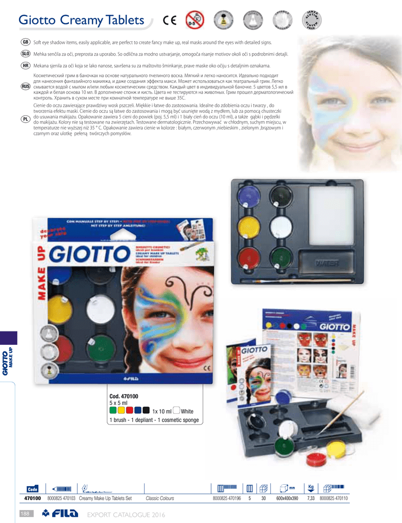 Giotto Creamy Tablets a Soft eye shadow items, easily applicable, are perfect to create fancy make up, real masks around the eyes with detailed signs. k Mehka senčila za oči, preprosta za uporabo. So odlična za modno ustvarjanje, omogoča risanje motivov okoli oči s podrobnimi detajli. t Mekana sjenila za oči koja se lako nanose, savršena su za maštovito šminkanje, prave maske oko očiju s detaljnim oznakama. l MAKE UP d Косметический грим в баночках на основе натурального пчелиного воска. Мягкий и легко наносится. Идеально подходит для нанесения фантазийного макияжа, и даже создания эффекта макси. Может использоваться как театральный грим. Легко смывается водой с мылом и/или любым косметическим средством. Каждый цвет в индивидуальной баночке. 5 цветов 5,5 мл в каждой и белая основа 10 мл. В дополнение спонж и кисть. Цвета не тестируются на животных. Грим прошел дерматологический контроль. Хранить в сухом месте при комнатной температуре не выше 35С. Cienie do oczu zawierające prawdziwy wosk pszczeli. Miękkie i łatwe do zastosowania. Idealne do zdobienia oczu i twarzy , do tworzenia efektu maski. Cienie do oczu są łatwe do zastosowania i mogą być usunięte wodą z mydłem, lub za pomocą chusteczki do usuwania makijażu. Opakowanie zawiera 5 cieni do powiek (poj. 5,5 ml) i 1 biały cień do oczu (10 ml), a także gąbki i pędzelki do makijażu. Kolory nie są testowane na zwierzętach. Testowane dermatologicznie. Przechowywać w chłodnym, suchym miejscu, w temperaturze nie wyższej niż 35 ° C. Opakowanie zawiera cienie w kolorze : białym, czerwonym ,niebieskim , zielonym ,brązowym i czarnym oraz ulotkę pełeną twórczych pomysłów. Cod. 470100 5 x 5 ml 1x 10 ml White 1 brush - 1 depliant - 1 cosmetic sponge 470100 188 8000825 470103 Creamy Make Up Tablets Set Classic Colours EXPORT CATALOGUE 2016 8000825 470196 5 30 600x400x390 7,33 8000825 470110