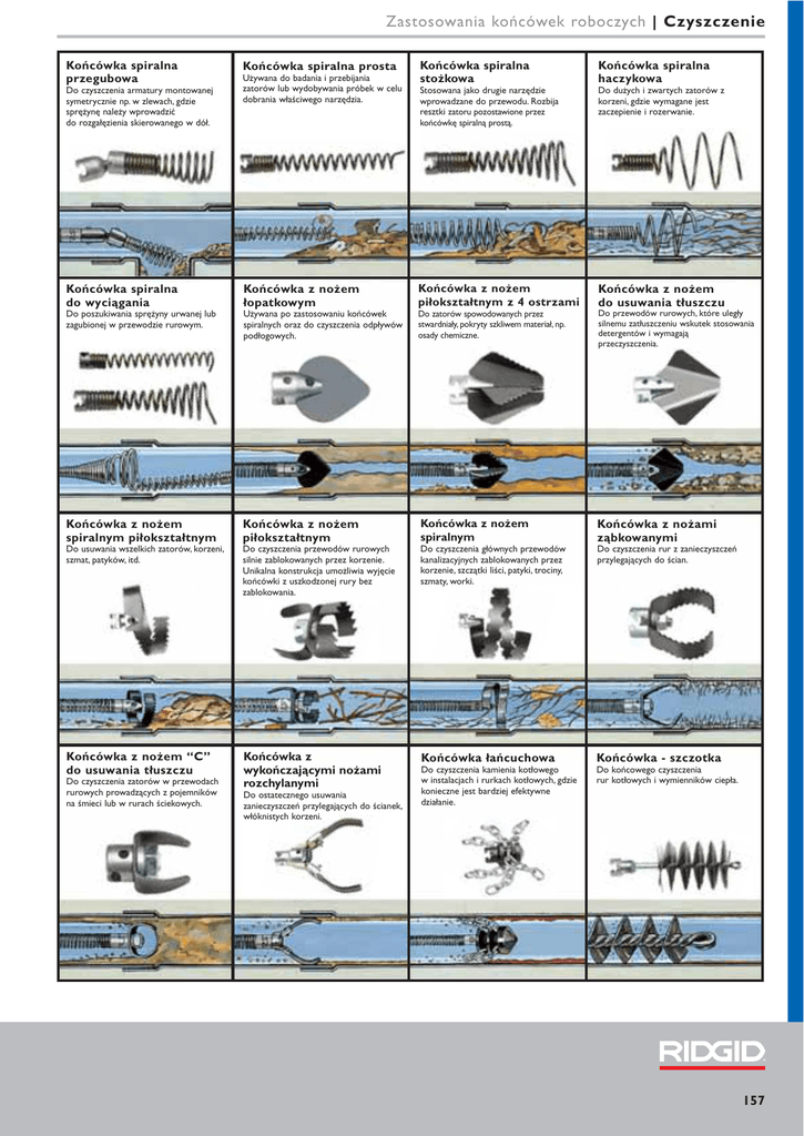 Zastosowania końcówek roboczych | Czyszczenie Końcówka spiralna przegubowa Do czyszczenia armatury montowanej symetrycznie np. w zlewach, gdzie sprężynę należy wprowadzić do rozgałęzienia skierowanego w dół. Końcówka spiralna prosta Używana do badania i przebijania zatorów lub wydobywania próbek w celu dobrania właściwego narzędzia. Końcówka spiralna stożkowa Końcówka spiralna haczykowa Stosowana jako drugie narzędzie wprowadzane do przewodu. Rozbija resztki zatoru pozostawione przez końcówkę spiralną prostą. Do dużych i zwartych zatorów z korzeni, gdzie wymagane jest zaczepienie i rozerwanie. Końcówka spiralna do wyciągania Końcówka z nożem łopatkowym Końcówka z nożem piłokształtnym z 4 ostrzami Końcówka z nożem do usuwania tłuszczu Do poszukiwania sprężyny urwanej lub zagubionej w przewodzie rurowym. Używana po zastosowaniu końcówek spiralnych oraz do czyszczenia odpływów podłogowych. Do zatorów spowodowanych przez stwardniały, pokryty szkliwem materiał, np. osady chemiczne. Do przewodów rurowych, które uległy silnemu zatłuszczeniu wskutek stosowania detergentów i wymagają przeczyszczenia. Końcówka z nożem spiralnym piłokształtnym Końcówka z nożem piłokształtnym Końcówka z nożem spiralnym Końcówka z nożami ząbkowanymi Do usuwania wszelkich zatorów, korzeni, szmat, patyków, itd. Do czyszczenia przewodów rurowych silnie zablokowanych przez korzenie. Unikalna konstrukcja umożliwia wyjęcie końcówki z uszkodzonej rury bez zablokowania. Do czyszczenia głównych przewodów kanalizacyjnych zablokowanych przez korzenie, szczątki liści, patyki, trociny, szmaty, worki. Do czyszczenia rur z zanieczyszczeń przylegających do ścian. Końcówka z nożem “C” do usuwania tłuszczu Końcówka z wykończającymi nożami rozchylanymi Końcówka łańcuchowa Końcówka - szczotka Do czyszczenia kamienia kotłowego w instalacjach i rurkach kotłowych, gdzie konieczne jest bardziej efektywne działanie. Do końcowego czyszczenia rur kotłowych i wymienników ciepła. Do czyszczenia zatorów w przewodach rurowych prowadzących z pojemników na śmieci lub w rurach ściekowych. Do ostatecznego usuwania zanieczyszczeń przylegających do ścianek, włóknistych korzeni. 157