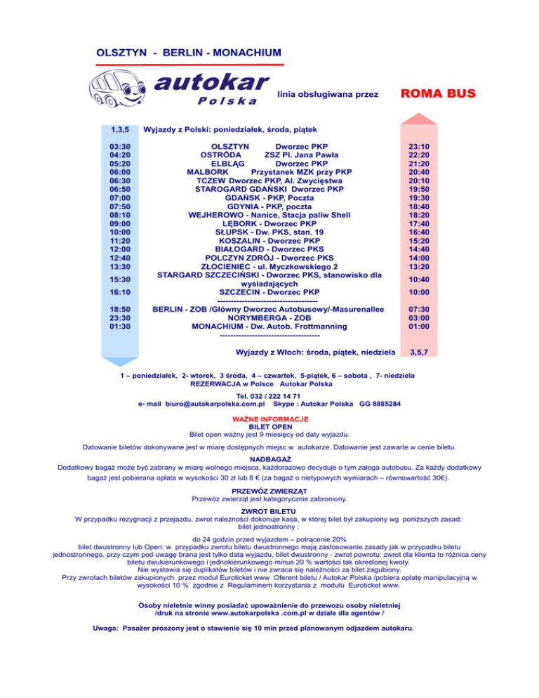 OLSZTYN - BERLIN - MONACHIUM linia obsługiwana przez 1,3,5 03:30 04:20 05:20 06:00 06:30 06:50 07:00 07:50 08:10 09:00 10:00 11:20 12:00 12:40 13:30 15:30 16:10 18:50 23:30 01:30 ROMA BUS Wyjazdy z Polski: poniedziałek, środa, piątek OLSZTYN Dworzec PKP OSTRÓDA ZSZ Pl. Jana Pawła ELBLĄG Dworzec PKP MALBORK Przystanek MZK przy PKP TCZEW Dworzec PKP, Al. Zwycięstwa STAROGARD GDAŃSKI Dworzec PKP GDAŃSK - PKP, Poczta GDYNIA - PKP, poczta WEJHEROWO - Nanice, Stacja paliw Shell LĘBORK - Dworzec PKP SŁUPSK - Dw. PKS, stan. 19 KOSZALIN - Dworzec PKP BIAŁOGARD - Dworzec PKS POLCZYN ZDRÓJ - Dworzec PKS ZŁOCIENIEC - ul. Myczkowskiego 2 STARGARD SZCZECIŃSKI - Dworzec PKS, stanowisko dla wysiadających SZCZECIN - Dworzec PKP ------------------------------------BERLIN - ZOB /Główny Dworzec Autobusowy/-Masurenallee NORYMBERGA - ZOB MONACHIUM - Dw. Autob. Frottmanning ------------------------------------Wyjazdy z Włoch: środa, piątek, niedziela 23:10 22:20 21:20 20:40 20:10 19:50 19:30 18:40 18:20 17:40 16:40 15:20 14:40 14:00 13:20 10:40 10:00 07:30 03:00 01:00 3,5,7 1 – poniedziałek, 2- wtorek, 3 środa, 4 – czwartek, 5-piątek, 6 – sobota , 7- niedziela REZERWACJA w Polsce Autokar Polska Tel. 032 / 222 14 71 e- mail [email protected] Skype : Autokar Polska GG 8885284 WAŻNE INFORMACJE BILET OPEN Bilet open ważny jest 9 miesięcy od daty wyjazdu. Datowanie biletów dokonywane jest w miarę dostępnych miejsc w autokarze. Datowanie jest zawarte w cenie biletu. NADBAGAŻ Dodatkowy bagaż może być zabrany w miarę wolnego miejsca, każdorazowo decyduje o tym załoga autobusu. Za każdy dodatkowy bagaż jest pobierana opłata w wysokości 30 zł lub 8 € (za bagaż o nietypowych wymiarach – równowartość 30€). PRZEWÓZ ZWIERZĄT Przewóz zwierząt jest kategorycznie zabroniony. ZWROT BILETU W przypadku rezygnacji z przejazdu, zwrot należności dokonuje kasa, w której bilet był zakupiony wg poniższych zasad: bilet jednostronny : do 24 godzin przed wyjazdem – potrącenie 20% bilet dwustronny lub Open: w przypadku zwrotu biletu dwustronnego mają zastosowanie zasady jak w przypadku biletu jednostronnego, przy czym pod uwagę brana jest tylko data wyjazdu, bilet dwustronny - zwrot powrotu: zwrot dla klienta to różnica ceny biletu dwukierunkowego i jednokierunkowego minus 20 % wartości tak określonej kwoty. Nie wystawia się duplikatów biletów i nie zwraca się należności za bilet zagubiony. Przy zwrotach biletów zakupionych przez moduł Euroticket www Oferent biletu / Autokar Polska /pobiera opłatę manipulacyjną w wysokości 10 % zgodnie z Regulaminem korzystania z modułu Euroticket www. Osoby nieletnie winny posiadać upoważnienie do przewozu osoby nieletniej /druk na stronie www.autokarpolska .com.pl w dziale dla agentów / Uwaga: Pasażer proszony jest o stawienie się 10 min przed planowanym odjazdem autokaru.