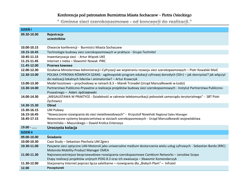 Konferencja pod patronatem Burmistrza Miasta Sochaczew – Piotra Osieckiego DZIEŃ I 09.30-10.00 10.00-10.15 10.15-10.45 10.45-11.15 11.15-11.45 11.45-12.00 12.00-12.30 12.30-13.00 13.00-13.30 13.30-14.00 14.00-14.30 14.30-15.30 15.30-16.15 16.15-16.45 16.45-17.15 19.00 - …… DZIEŃ II 09.00-10.00 10.00-10.30 10.30-11.00 11.00-11.30 11.30-12.00 12.00 Rejestracja uczestników Otwarcie konferencji - Burmistrz Miasta Sochaczew Technologie budowy sieci szerokopasmowych w praktyce - Grupa Technitel Inwentaryzacja sieci - Artur Więcek UKE Internet z nieba – Sławomir Nowak PIRC Przerwa kawowa Działania Ministerstwa Administracji i Cyfryzacji we wspieraniu rozwoju sieci szerokopasmowych – Piotr Kowalski MaiC POLSKA CYFROWA RÓWNYCH SZANS - ogólnopolski program edukacji cyfrowej dorosłych (50+) – jak skorzystad? jak włączyd do realizacji lokalnych liderów i animatorów? – Artur Krawczyk Model kosztowo – przychodowy w ramach 8.3 – Marek Trznadel (Urząd Marszałkowski w Łodzi) Partnerstwo Publiczno-Prywatne a realizacja projektów budowy sieci szerokopasmowych - Instytut Partnerstwa PublicznoPrywatnego – Adam Jędrzejewski „MEGAUSTAWA W PRAKTYCE - Działalnośd w zakresie telekomunikacji jednostek samorządu terytorialnego” - SBT Piotr Zychowicz Obiad UM Puławy "Nowoczesne rozwiązania do sieci światłowodowych" - Krzysztof Nowioski Regional Sales Manager Nowoczesne systemy bezpieczeostwa w sieciach szerokopasmowych - Urząd Marszałkowski województwa Warmiosko – Mazurskiego – Dawid Krolica Enterasys Uroczysta kolacja Śniadanie Case Study – Sebastian Piechota UM Zgierz Pasywne sieci optyczne LAN Motoroli jako uniwersalne medium dostarczenia wielu usług cyfrowych - Sebastian Bardo (RRC) Motorola Mobility Product Manager EMEA Najnowocześniejsze bezprzewodowe rozwiązania szerokopasmowe Cambium Networks – Jarosław Szopa Etapy realizacji projektów unijnych POIG 8.3 oraz ich ewaluacja – Sławomir Komendarczyk Stacjonarny Internet poprzez łącza satelitarne – rozwiązania dla „Białych Plam” – Infratel Poczęstunek