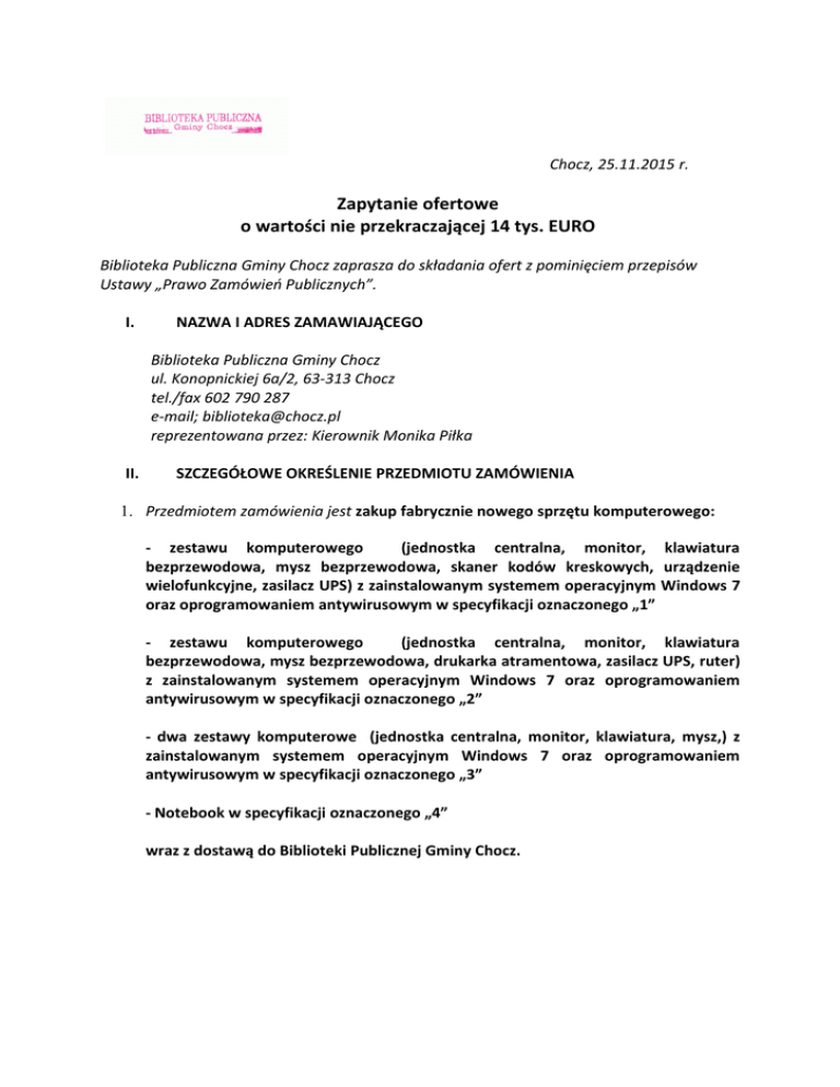 Chocz, 25.11.2015 r. Zapytanie ofertowe o wartości nie przekraczającej 14 tys. EURO Biblioteka Publiczna Gminy Chocz zaprasza do składania ofert z pominięciem przepisów Ustawy „Prawo Zamówień Publicznych”. I. NAZWA I ADRES ZAMAWIAJĄCEGO Biblioteka Publiczna Gminy Chocz ul. Konopnickiej 6a/2, 63-313 Chocz tel./fax 602 790 287 e-mail; [email protected] reprezentowana przez: Kierownik Monika Piłka II. SZCZEGÓŁOWE OKREŚLENIE PRZEDMIOTU ZAMÓWIENIA 1. Przedmiotem zamówienia jest zakup fabrycznie nowego sprzętu komputerowego: - zestawu komputerowego (jednostka centralna, monitor, klawiatura bezprzewodowa, mysz bezprzewodowa, skaner kodów kreskowych, urządzenie wielofunkcyjne, zasilacz UPS) z zainstalowanym systemem operacyjnym Windows 7 oraz oprogramowaniem antywirusowym w specyfikacji oznaczonego „1” - zestawu komputerowego (jednostka centralna, monitor, klawiatura bezprzewodowa, mysz bezprzewodowa, drukarka atramentowa, zasilacz UPS, ruter) z zainstalowanym systemem operacyjnym Windows 7 oraz oprogramowaniem antywirusowym w specyfikacji oznaczonego „2” - dwa zestawy komputerowe (jednostka centralna, monitor, klawiatura, mysz,) z zainstalowanym systemem operacyjnym Windows 7 oraz oprogramowaniem antywirusowym w specyfikacji oznaczonego „3” - Notebook w specyfikacji oznaczonego „4” wraz z dostawą do Biblioteki Publicznej Gminy Chocz. 2. Szczegółowy opis przedmiotu zamówienia: „1” zestaw komputerowy – specyfikacja: Sprzęt komputerowy firm: HP, Fujitsu, Dell Poz. 1. 2. 3. 4. 5. Podzespoły Procesor Płyta główna Pamięć RAM Dysk twardy Karta graficzna 6. Karta dźwiękowa Karta sieciowa Napęd optyczny FDD Klawiatura Myszka Porty Obudowa Oprogramowani e Certyfikaty Kable przyłączające Zasilacz Gwarancja 7. 8. 9. 10. 11. 12. 13. 14. 15. 16. 17. 18. Opis minimalnych wymagań Intel Core i5-4460 (4 rdzenie od 3.20 GHz do 3.40 GHz, 6MB cache ) Intel H81 8GB DDR3-1600 (PC3-12800) 128 GB SSD SATA III Intel HD Graphics 4600 + Nvidia Geforce GTX 745, 3GB własnej pamięci Zintegrowana karta dźwiękowa zgodna z Intel High Definition Audio LAN 10/100/1000 Mbps DVD+/-RW DualLayer Nie występuje USB/PS2 USB/PS2 4 x USB 2.0; 2x USB 3.0; 1x HDMI; 1 x DVI; 1 x VGA midi Tower Windows 7 Professional 64-bitowy + nośnik z systemem CE Kabel zasilający 300 W + kabel zasilający 36 miesiące (autoryzowany serwis producenta u klienta następnego dnia roboczego) Monitor firmy: Samsung, LG, iiyama, Dell Poz. Nazwa Opis minimalnych wymagań 1. Matryca Matowy, LED. IPS 2. Wielkość ekranu 22” 3. Plamka 0.25 mm 4. Jasność 250 cd/m2 5. Rozdzielczość 1920 x 1080 piksele 6. Złącza HDMI 7. Kąt widzenia w poziomie 178 ° 8. Kąt widzenia w pionie 178 ° 9. Czas reakcji plamki 5 ms 10. Liczba kolorów 16.7 mln 11. Gwarancja 36 miesiące 12 Pobór prądu podczas pracy <30W Zasilacz awaryjny UPS: Ever, APC, Eaton Poz. 1. 2. 3. 4. 5. 6. 7. 8. 9. 10. Nazwa Moc Moc Pozorna Kształt napięcia wyjściowego Progi przełączenia Czas podtrzymania Czas przełączenia Średni czas ładowania Zabezpieczenia Złącza Gwarancja Opis minimalnych wymagań 600 W 1000 W Modulowany sinus 200V-249V 4 minuty 6 ms 10 godzin Przeciążeniowe, Przeciwzwarciowe 4 x IEC320 C13; 1x RJ-45; 1 x USB 24 miesiące door-to-door Bezprzewodowy skaner kodów kreskowych: Honeywell; Motorola Poz. Nazwa 1. Zasięg pracy od bazy komunikacyjno ładującej 2. Zasięg odczytu 3. Szybkość odczytu 4. Sygnalizacja odczytu 5. Odporność na upadki 6. Norma szczelności 7. Temperatura otoczenia pracy 8. Waga 9. Rodzaj interfejsu 10. Gwarancja 11 Baza komunikacyjno ładująca w zestawie Opis minimalnych wymagań 10m 30 cm 100 skanów/sek. dźwiękowa i świetlna 1,5 m IP42 Od 5 st. C do 40 st. C <200g Multiinterfejs USB, KBW (PS/2) RS232 36 miesiecy Tak Urządzenie wielofunkcyjne: HP; Canon Poz. Nazwa Opis minimalnych wymagań 1. Technologi druku Laserowa monochromatyczna 2. Maks. Rozmiar nośnika A4 3. Szybkość druku mono 20 str./ min 4. Praca w sieci tak 5. Typ skanera Płaski i autoamtyczny podajnik dokumentów (ADF) 6. Rozdzielczość skanera 1200 x 1200 dpi 7. Pojemność pamięci faksu 500 str. 8. Szybkość trasnmisji faksu 33.6 kbps 9. Interfejs USB 2.0; Wi-Fi; Ethernet 10/100 Mbps 10. Inne cechy Kolorowy ekran dotykowy 11 Normatywne obciążenie 8000 str./ mies. 12 Gwarancja 12 miesięcy w serwisie zewnętrznym producenta „2” zestaw komputerowy – specyfikacja: Sprzęt komputerowy firm: HP, Fujitsu, Dell Poz. 1. 2. 3. 4. 5. Podzespoły Procesor Płyta główna Pamięć RAM Dysk twardy Karta graficzna 6. Karta dźwiękowa Karta sieciowa Napęd optyczny FDD Klawiatura Myszka Porty Obudowa Oprogramowani e Certyfikaty Kable przyłączające Zasilacz Gwarancja 7. 8. 9. 10. 11. 12. 13. 14. 15. 16. 17. 18. Opis minimalnych wymagań Intel Core i5-4460 (4 rdzenie od 3.20 GHz do 3.40 GHz, 6MB cache ) Intel H81 8GB DDR3-1600 (PC3-12800) 128 GB SSD SATA III Intel HD Graphics 4600 + Nvidia Geforce GTX 745, 3GB własnej pamięci Zintegrowana karta dźwiękowa zgodna z Intel High Definition Audio LAN 10/100/1000 Mbps DVD+/-RW DualLayer Nie występuje USB/PS2 USB/PS2 4 x USB 2.0; 2x USB 3.0; 1x HDMI; 1 x DVI; 1 x VGA midi Tower Windows 7 Professional 64-bitowy + nośnik z systemem CE Kabel zasilający 300 W + kabel zasilający 36 miesiące (autoryzowany serwis producenta u klienta następnego dnia roboczego) Monitor firmy: Samsung, LG, iiyama, Dell Poz. 1. 2. 3. 4. 5. 6. 7. 8. 9. 10. 11. 12 Nazwa Matryca Wielkość ekranu Plamka Jasność Rozdzielczość Złącza Kąt widzenia w poziomie Kąt widzenia w pionie Czas reakcji plamki Liczba kolorów Gwarancja Pobór prądu podczas pracy Opis minimalnych wymagań Matowy, LED. IPS 22” 0.25 mm 250 cd/m2 1920 x 1080 piksele HDMI 178 ° 178 ° 5 ms 16.7 mln 36 miesiące <30W Zasilacz awaryjny UPS: Ever, APC, Eaton Poz. 1. 2. 3. 4. 5. 6. 7. 8. 9. 10. Nazwa Moc Moc Pozorna Kształt napięcia wyjściowego Progi przełączenia Czas podtrzymania Czas przełączenia Średni