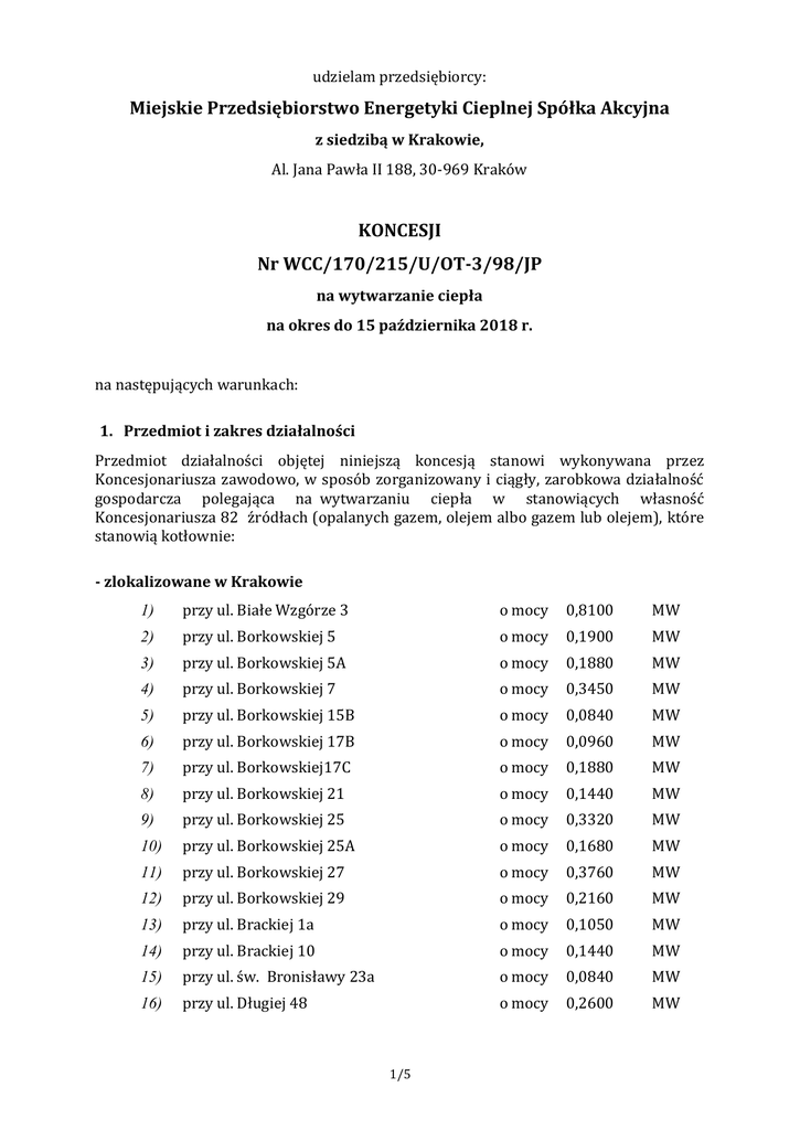 udzielam przedsiębiorcy: Miejskie Przedsiębiorstwo Energetyki Cieplnej Spółka Akcyjna z siedzibą w Krakowie, Al. Jana Pawła II 188, 30-969 Kraków KONCESJI Nr WCC/170/215/U/OT-3/98/JP na wytwarzanie ciepła na okres do 15 października 2018 r. na następujących warunkach: 1. Przedmiot i zakres działalności Przedmiot działalności objętej niniejszą koncesją stanowi wykonywana przez Koncesjonariusza zawodowo, w sposób zorganizowany i ciągły, zarobkowa działalność gospodarcza polegająca na wytwarzaniu ciepła w stanowiących własność Koncesjonariusza 82 źródłach (opalanych gazem, olejem albo gazem lub olejem), które stanowią kotłownie: - zlokalizowane w Krakowie 1) przy ul. Białe Wzgórze 3 o mocy 0,8100 MW 2) przy ul. Borkowskiej 5 o mocy 0,1900 MW 3) przy ul. Borkowskiej 5A o mocy 0,1880 MW 4) przy ul. Borkowskiej 7 o mocy 0,3450 MW 5) przy ul. Borkowskiej 15B o mocy 0,0840 MW 6) przy ul. Borkowskiej 17B o mocy 0,0960 MW 7) przy ul. Borkowskiej17C o mocy 0,1880 MW 8) przy ul. Borkowskiej 21 o mocy 0,1440 MW 9) przy ul. Borkowskiej 25 o mocy 0,3320 MW 10) przy ul. Borkowskiej 25A o mocy 0,1680 MW 11) przy ul. Borkowskiej 27 o mocy 0,3760 MW 12) przy ul. Borkowskiej 29 o mocy 0,2160 MW 13) przy ul. Brackiej 1a o mocy 0,1050 MW 14) przy ul. Brackiej 10 o mocy 0,1440 MW 15) przy ul. św. Bronisławy 23a o mocy 0,0840 MW 16) przy ul. Długiej 48 o mocy 0,2600 MW 1/5 17) przy ul. Doktora Judyma 10 o mocy 0,2600 MW 18) przy ul. Emaus 15 o mocy 0,1790 MW 19) przy ul. Fenna 6 o mocy 0,2150 MW 20) przy ul. św. Filipa 9 o mocy 0,0930 MW 21) przy ul. Floriańskiej 32 o mocy 0,1300 MW 22) przy ul. Grodzkiej 13 o mocy 0,0960 MW 23) przy ul. Grodzkiej 63/65 o mocy 0,5700 MW 24) przy ul. św. Jana 2 o mocy 1,4950 MW 25) przy ul. św. Józefa 12 o mocy 0,0800 MW 26) przy ul. Karmelickiej 16 o mocy 0,2250 MW 27) przy ul. Kluczborskiej 20 o mocy 4,3300 MW 28) przy al. Krasińskiego 18 o mocy 0,1550 MW 29) przy ul. Królowej Jadwigi 37b o mocy 0,1210 MW 30) przy ul. Królowej Jadwigi 77 o mocy 0,1550 MW 31) przy ul. Królowej Jadwigi 81 o mocy 0,2250 MW 32) przy ul. Krupniczej 11 o mocy 0,0730 MW 33) przy ul. św. Krzyża 4 o mocy 1,1000 MW 34) przy ul. Lubomirskiego 7a o mocy 0,0900 MW 35) przy ul. Makuszyńskiego 9 o mocy 0,1300 MW 36) przy ul. Makuszyńskiego 18 o mocy 0,2250 MW 37) przy ul. Makuszyńskiego 19 o mocy 0,6900 MW 38) przy ul. Makuszyńskiego 34 o mocy 1,6250 MW 39) przy ul. Montwiłła-Mireckiego 11 o mocy 0,1700 MW 40) przy ul. Pana Tadeusza 8 o mocy 0,1880 MW 41) przy ul. Pawlikowskiego 14 o mocy 0,1050 MW 42) przy ul. Piastowskiej 8-10 o mocy 0,4500 MW 43) przy ul. Piłsudskiego 29 o mocy 0,0550 MW 44) przy ul. ks. Popiełuszki 36 o mocy 0,0800 MW 45) przy ul. Podłużnej 3 o mocy 0,6900 MW 46) przy ul. Praskiej 25 o mocy 0,4790 MW 47) przy ul. Praskiej 62 o mocy 0,4500 MW 48) przy ul. Rakowickiej 10a o mocy 0,0900 MW 49) przy Rynku Głównym 8 o mocy 0,1050 MW 50) przy ul. Skośnej 20 o mocy 0,3440 MW 51) przy ul. Skotnickiej 86 o mocy 0,1680 MW 52) przy ul. Sławkowskiej 14 o mocy 0,0600 MW 2/5 53) przy pl. Słowiańskim 3 o mocy 0,0700 MW 54) przy ul. Sołtyka 4 o mocy 0,1210 MW 55) przy ul. Starowiślnej 25 o mocy 0,1440 MW 56) przy ul. Starowiślnej 30a o mocy 0,2250 MW 57) przy ul. Starowiślnej 59 o mocy 0,0870 MW 58) przy pl. Szczepańskim 8 o mocy 0,2570 MW 59) przy ul. Szewskiej 24/24a o mocy 0,0960 MW 60) przy ul. św. Tomasza 24/26 o mocy 0,4300 MW 61) przy ul. Warszauera 8 o mocy 0,1210 MW 62) przy ul. św. Wawrzyńca 11 o mocy 0,1050 MW 63) przy ul. Wielickiej 265 KP-5.5 o mocy 2,6200 MW 64) przy ul. Wielickiej 265, KWT o mocy 5,8800 MW 65) przy ul. Wiślnej 7 o mocy 0,2660 MW 66) przy pl. Wszystkich Świętych 11 o mocy 0,1440 MW 67) przy ul. Za Torem 22 o mocy 0,2570 MW 68) przy ul. Zakrzowieckiej 39k o mocy 0,1600 MW 69) przy ul. Zawiłej 57 o mocy 0,6480 MW 70) przy ul. Zygmunta Augusta 1 o mocy 0,2760 MW 71) przy ul. Jana Pawła II-kontenery o mocy 0,8050 MW 72) przy ul. Kobierzyńskiej 60 o mocy 0,512 MW o mocy 0,1680 MW o mocy 0,0480 MW - zlokalizowana w Krzęcinie 1) Krzęcina 301 - zlokalizowane w Polance Hallera 1) w Polance Hallera gmina Skawina - zlokalizowane w Skawinie 1) przy ul. Korabnickiej 19 o mocy 0,2600 MW 2) przy Rynku 17 o mocy 0,0600 MW 3) przy Piłsudskiego 25 o mocy 0,1700 MW 4) przy Piłsudskiego 20 o mocy 0,0600 MW 5) przy Piłsudskiego 41a o mocy 0,4050 MW o mocy 0,2100 MW o mocy 0,1050 MW - zlokalizowana w Woli Radziszowskiej 1) Wola Radziszowska 500 - zlokalizowana w Zelczynie 1) Zelczyn 1 3/5 Łączna moc zainstalowana źródeł ciepła wynosi 34,136 MW. 2. Warunki wykonywania działalności 2.1. Warunki ogólne 2.1.1. Koncesjonariusz jest obowiązany do wykonywania działalności objętej niniejszą koncesją na zasadach określonych w ustawie – Prawo energetyczne oraz wydanych na jej podstawie przepisach wykonawczych, w szczególności do zapewnienia wysokiej jakości świadczonych usług, niezawodności zaopatrzenia w ciepło przy zachowaniu zasady najniższych możliwych kosztów. 2.1.2. Koncesjonariusz jest obowiązany do przestrzegania obowiązujących przepisów, w tym przepisów o ochronie środowiska i bezpieczeństwie ekologicznym a także wydanych na ich podstawie przepisów wykonawczych. 2.1.3. Koncesjonariusz nie może sprzedawać ciepła przedsiębiorcom wykonującym działalność gospodarczą w zakresie przesyłania, dystrybucji lub obrotu ciepłem, jeżeli nie posiadają koncesji, w przypadkach gdy taka koncesja jest wymagana przepisami ustawy – Prawo energetyczne. 2.1.4. Koncesjonariusz jest obowiązany do wykonywania działalności w sposób nie powodujący zagrożenia dla życia lub zdrowia ludzkiego oraz nie narażający na powstanie szkód materialnych. 2.1.5. Koncesjonariusz nie będzie subsydiować działalności nie objętej niniejszą koncesją z przychodu osiąganego z działalności objętej tą koncesją 2.2. Szczególne warunki wykonywania działalności objętej koncesją ze wzg