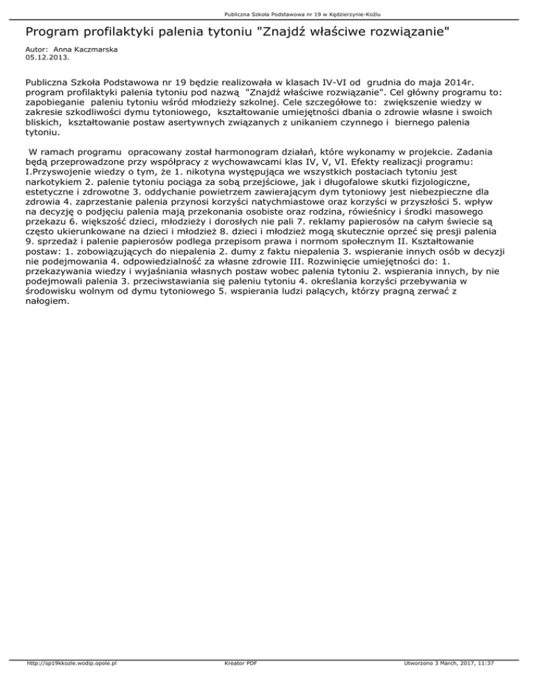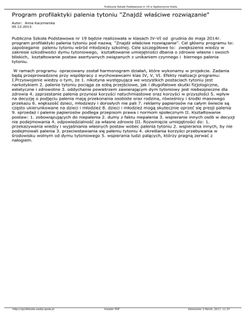 Publiczna Szkoła Podstawowa nr 19 w Kędzierzynie-Koźlu Program profilaktyki palenia tytoniu "Znajdź właściwe rozwiązanie" Autor: Anna Kaczmarska 05.12.2013. Publiczna Szkoła Podstawowa nr 19 będzie realizowała w klasach IV-VI od grudnia do maja 2014r. program profilaktyki palenia tytoniu pod nazwą "Znajdź właściwe rozwiązanie". Cel główny programu to: zapobieganie paleniu tytoniu wśród młodzieży szkolnej. Cele szczegółowe to: zwiększenie wiedzy w zakresie szkodliwości dymu tytoniowego, kształtowanie umiejętności dbania o zdrowie własne i swoich bliskich, kształtowanie postaw asertywnych związanych z unikaniem czynnego i biernego palenia tytoniu. W ramach programu opracowany został harmonogram działań, które wykonamy w projekcie. Zadania będą przeprowadzone przy współpracy z wychowawcami klas IV, V, VI. Efekty realizacji programu: I.Przyswojenie wiedzy o tym, że 1. nikotyna występująca we wszystkich postaciach tytoniu jest narkotykiem 2. palenie tytoniu pociąga za sobą przejściowe, jak i długofalowe skutki fizjologiczne, estetyczne i zdrowotne 3. oddychanie powietrzem zawierającym dym tytoniowy jest niebezpieczne dla zdrowia 4. zaprzestanie palenia przynosi korzyści natychmiastowe oraz korzyści w przyszłości 5. wpływ na decyzję o podjęciu palenia mają przekonania osobiste oraz rodzina, rówieśnicy i środki masowego przekazu 6. większość dzieci, młodzieży i dorosłych nie pali 7. reklamy papierosów na całym świecie są często ukierunkowane na dzieci i młodzież 8. dzieci i młodzież mogą skutecznie oprzeć się presji palenia 9. sprzedaż i palenie papierosów podlega przepisom prawa i normom społecznym II. Kształtowanie postaw: 1. zobowiązujących do niepalenia 2. dumy z faktu niepalenia 3. wspieranie innych osób w decyzji nie podejmowania 4. odpowiedzialność za własne zdrowie III. Rozwinięcie umiejętności do: 1. przekazywania wiedzy i wyjaśniania własnych postaw wobec palenia tytoniu 2. wspierania innych, by nie podejmowali palenia 3. przeciwstawiania się paleniu tytoniu 4. określania korzyści przebywania w środowisku wolnym od dymu tytoniowego 5. wspierania ludzi palących, którzy pragną zerwać z nałogiem. http://sp19kkozle.wodip.opole.pl Kreator PDF Utworzono 3 March, 2017, 11:37