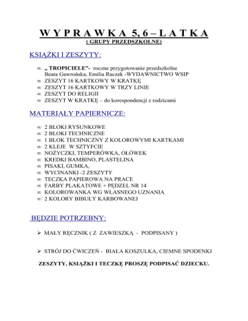 W Y P R A W K A 5, 6 – L A T K A ( GRUPY PRZEDSZKOLNE) KSIĄŻKI I ZESZYTY: • ,, TROPICIELE”- roczne przygotowanie przedszkolne Beata Gawrońska, Emilia Raczek -WYDAWNICTWO WSIP • ZESZYT 16 KARTKOWY W KRATKĘ • ZESZYT 16 KARTKOWY W TRZY LINIE • ZESZYT DO RELIGII • ZESZYT W KRATKĘ – do korespondencji z rodzicami MATERIAŁY PAPIERNICZE: • • • • • • • • • • • • 2 BLOKI RYSUNKOWE 2 BLOKI TECHNICZNE 1 BLOK TECHNICZNY Z KOLOROWYMI KARTKAMI 2 KLEJE W SZTYFCIE NOŻYCZKI, TEMPERÓWKA, OŁÓWEK KREDKI BAMBINO, PLASTELINA PISAKI, GUMKA, WYCINANKI -2 ZESZYTY TECZKA PAPIEROWA NA PRACE FARBY PLAKATOWE + PĘDZEL NR 14 KOLOROWANKA WG WŁASNEGO UZNANIA 2 KOLORY BIBUŁY KARBOWANEJ BĘDZIE POTRZEBNY: MAŁY RĘCZNIK ( Z ZAWIESZKĄ - PODPISANY ) STRÓJ DO ĆWICZEŃ - BIAŁA KOSZULKA, CIEMNE SPODENKI ZESZYTY, KSIĄŻKI I TECZKĘ PROSZĘ PODPISAĆ DZIECKU.
