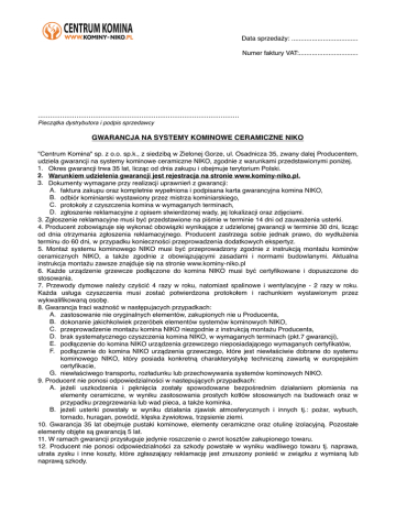 Data sprzedaży: .................................... Numer faktury VAT:................................ ................................................................................................... Pieczątka dystrybutora i podpis sprzedawcy GWARANCJA NA SYSTEMY KOMINOWE CERAMICZNE NIKO "Centrum Komina" sp. z o.o. sp.k., z siedzibą w Zielonej Gorze, ul. Osadnicza 35, zwany dalej Producentem, udziela gwarancji na systemy kominowe ceramiczne NIKO, zgodnie z warunkami przedstawionymi poniżej. 1. Okres gwarancji trwa 35 lat, licząc od dnia zakupu i obejmuje terytorium Polski. 2. Warunkiem udzielenia gwarancji jest rejestracja na stronie www.kominy-niko.pl. 3. Dokumenty wymagane przy realizacji uprawnień z gwarancji: A. faktura zakupu oraz kompletnie wypełniona i podpisana karta gwarancyjna komina NIKO, B. odbiór kominiarski wystawiony przez mistrza kominiarskiego, C. protokoły z czyszczenia komina w wymaganych terminach, D. zgłoszenie reklamacyjne z opisem stwierdzonej wady, jej lokalizacji oraz zdjęciami. 3. Zgłoszenie reklamacyjne musi być przedstawione na piśmie w terminie 14 dni od zauważenia usterki. 4. Producent zobowiązuje się wykonać obowiązki wynikające z udzielonej gwarancji w terminie 30 dni, licząc od dnia otrzymania zgłoszenia reklamacyjnego. Producent zastrzega sobie jednak prawo, do wydłużenia terminu do 60 dni, w przypadku konieczności przeprowadzenia dodatkowych ekspertyz. 5. Montaż systemu kominowego NIKO musi być przeprowadzony zgodnie z instrukcją montażu kominów ceramicznych NIKO, a także zgodnie z obowiązującymi zasadami i normami budowlanymi. Aktualna instrukcja montażu zawsze znajduje się na stronie www.kominy-niko.pl 6. Każde urządzenie grzewcze podłączone do komina NIKO musi być certyfikowane i dopuszczone do stosowania. 7. Przewody dymowe należy czyścić 4 razy w roku, natomiast spalinowe i wentylacyjne - 2 razy w roku. Każda usługa czyszczenia musi zostać potwierdzona protokołem i rachunkiem wystawionym przez wykwalifikowaną osobę. 8. Gwarancja traci ważność w następujacych przypadkach: A. zastosowanie nie oryginalnych elementów, zakupionych nie u Producenta, B. dokonanie jakichkolwiek przeróbek elementów systemów kominowych NIKO, C. przeprowadzenie montażu komina NIKO niezgodnie z instrukcją montażu Producenta, D. brak systematycznego czyszczenia komina NIKO, w wymaganych terminach (pkt.7 gwarancji), E. podłączenie do komina NIKO urządzenia grzewczego nieposiadającego wymaganych certyfikatów, F. podłączenie do komina NIKO urządzenia grzewczego, które jest niewłaściwie dobrane do systemu kominowego NIKO, który posiada konkretną charakterystykę techniczną zawartą w europejskim certyfikacie, G. niewłaściwego transportu, rozładunku lub przechowywania systemów kominowych NIKO. 9. Producent nie ponosi odpowiedzialności w nastepujących przypadkach: A. jeżeli uszkodzenia i pęknięcia zostały spowodowane bezpośrednim działaniem płomienia na elementy ceramiczne, w wyniku zastosowania prostych kotłów stosowanych na budowach oraz w przypadku przegrzewania lub wad pieca, a także kominka. B. jeżeli usterki powstały w wyniku działania zjawisk atmosferycznych i innych tj.: pożar, wybuch, tornado, huragan, powódź, klęska żywiołowa, trzęsienie ziemi. 10. Gwarancja 35 lat obejmuje pustaki kominowe, elementy ceramiczne oraz otulinę izolacyjną. Pozostałe elementy objęte są gwarancją 5 lat. 11. W ramach gwarancji przysługuje jedynie roszczenie o zwrot kosztów zakupionego towaru. 12. Producent nie ponosi odpowiedzialności za szkody powstałe w wyniku wadliwego towaru tj. naprawa, utrata zysku i inne koszty, które zgłaszający reklamację jest zmuszony ponieść w związku z wymianą lub naprawą szkody.