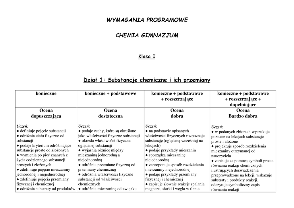WYMAGANIA PROGRAMOWE CHEMIA GIMNAZJUM Dział 1