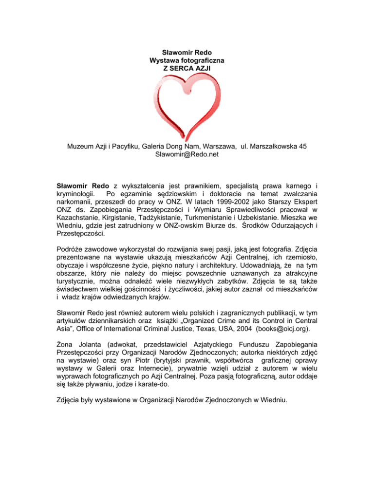 Sławomir Redo Wystawa fotograficzna Z SERCA AZJI Muzeum Azji i Pacyfiku, Galeria Dong Nam, Warszawa, ul. Marszałkowska 45 [email protected] Sławomir Redo z wykształcenia jest prawnikiem, specjalistą prawa karnego i kryminologii. Po egzaminie sędziowskim i doktoracie na temat zwalczania narkomanii, przeszedł do pracy w ONZ. W latach 1999-2002 jako Starszy Ekspert ONZ ds. Zapobiegania Przestępczości i Wymiaru Sprawiedliwości pracował w Kazachstanie, Kirgistanie, Tadżykistanie, Turkmenistanie i Uzbekistanie. Mieszka we Wiedniu, gdzie jest zatrudniony w ONZ-owskim Biurze ds. Środków Odurzających i Przestępczości. Podróże zawodowe wykorzystał do rozwijania swej pasji, jaką jest fotografia. Zdjęcia prezentowane na wystawie ukazują mieszkańców Azji Centralnej, ich rzemiosło, obyczaje i współczesne życie, piękno natury i architektury. Udowadniają, że na tym obszarze, który nie należy do miejsc powszechnie uznawanych za atrakcyjne turystycznie, można odnaleźć wiele niezwykłych zabytków. Zdjęcia te są także świadectwem wielkiej gościnności i życzliwości, jakiej autor zaznał od mieszkańców i władz krajów odwiedzanych krajów. Sławomir Redo jest również autorem wielu polskich i zagranicznych publikacji, w tym artykułów dziennikarskich oraz książki „Organized Crime and its Control in Central Asia”, Office of International Criminal Justice, Texas, USA, 2004 ([email protected]). Żona Jolanta (adwokat, przedstawiciel Azjatyckiego Funduszu Zapobiegania Przestępczości przy Organizacji Narodów Zjednoczonych; autorka niektórych zdjęć na wystawie) oraz syn Piotr (brytyjski prawnik, współtwórca graficznej oprawy wystawy w Galerii oraz Internecie), prywatnie wzięli udział z autorem w wielu wyprawach fotograficznych po Azji Centralnej. Poza pasją fotograficzną, autor oddaje się także pływaniu, jodze i karate-do. Zdjęcia były wystawione w Organizacji Narodów Zjednoczonych w Wiedniu.