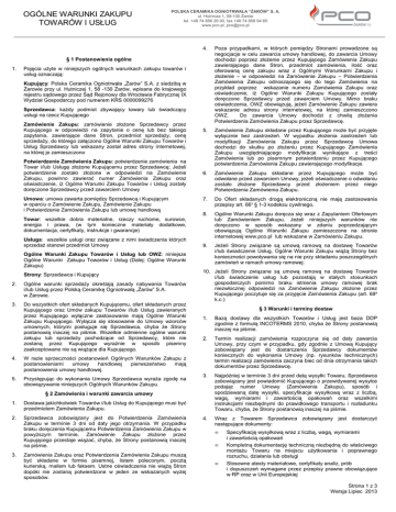 OGÓLNE WARUNKI ZAKUPU TOWARÓW I USŁUG POLSKA CERAMIKA OGNIOTRWAŁA “śARÓW” S. A. ul. Hutnicza 1, 58-130 śarów tel. +48 74 856 26 00, fax +48 74 858 04 65 www.pco.pl, [email protected] 4. Poza przypadkami, w których pomiędzy Stronami prowadzone są negocjacje w celu zawarcia umowy handlowej, do zawarcia Umowy dochodzi poprzez złoŜenie przez Kupującego Zamówienia Zakupu zawierającego dane Stron, przedmiot zamówienia, ilość oraz oferowaną cenę zakupu wraz z Ogólnymi Warunkami Zakupu i złoŜenie – w odpowiedzi na Zamówienie Zakupu – Potwierdzenia Zamówienia Zakupu odnoszącego się do tego Zamówienia na przykład poprzez wskazanie numeru Zamówienia Zakupu oraz oświadczenie, iŜ Ogólne Warunki Zakupu Kupującego zostały doręczone Sprzedawcy przed zawarciem Umowy. Mimo braku oświadczenia, OWZ obowiązują, jeŜeli Zamówienie Zakupu zawiera wskazanie adresu strony internetowej, na której zamieszczono OWZ. Do zawarcia Umowy dochodzi z chwilą złoŜenia Potwierdzenia Zamówienia Zakupu przez Sprzedawcę. 5. Zamówienie Zakupu składane przez Kupującego moŜe być przyjęte wyłącznie bez zastrzeŜeń. W wypadku złoŜenia zastrzeŜeń lub modyfikacji Zamówienia Zakupu przez Sprzedawcę Umowa dochodzi do skutku po złoŜeniu przez Kupującego Zamówienia Zakupu uwzględniającego modyfikacje wynikające z treści Zamówienia lub po pisemnym potwierdzeniu przez Kupującego potwierdzenia Zamówienia Zakupu zawierającego modyfikacje. 6. Zamówienie Zakupu składane przez Kupującego moŜe być odwołane przed zawarciem Umowy, jeŜeli oświadczenie o odwołaniu zostało złoŜone Sprzedawcy przed złoŜeniem przez niego Potwierdzenia Zamówienia Zakupu. 7. Do Ofert składanych drogą elektroniczną nie mają zastosowania przepisy art. 66¹ § 1-3 kodeksu cywilnego, 8. Ogólne Warunki Zakupu doręcza się wraz z Zapytaniem Ofertowym lub Zamówieniem Zakupu. JeŜeli niniejszych warunków nie doręczono w sposób wskazany w zdaniu poprzedzającym obowiązują Ogólne Warunki Zakupu zamieszczone na stronie internetowej www.pco.pl lub wskazane w Zamówieniu Zakupu. 9. JeŜeli Strony związane są umową ramową na dostawę Towarów i/lub świadczenie Usług, Ogólne Warunki Zakupu wiąŜą Strony bez konieczności powoływania się na nie przy składaniu poszczególnych zamówień w ramach umowy ramowej. § 1 Postanowienia ogólne 1. Pojęcia uŜyte w niniejszych ogólnych warunkach zakupu towarów i usług oznaczają: Kupujący: Polska Ceramika Ogniotrwała „śarów” S.A. z siedzibą w śarowie przy ul. Hutniczej 1, 58 -130 śarów, wpisana do krajowego rejestru sądowego przez Sąd Rejonowy dla Wrocławia Fabrycznej IX Wydział Gospodarczy pod numerem KRS 0000099276 Sprzedawca: kaŜdy podmiot zbywający towary lub świadczący usługi na rzecz Kupującego Zamówienie Zakupu: zamówienie złoŜone Sprzedawcy przez Kupującego w odpowiedzi na zapytanie o cenę lub bez takiego zapytania, zawierające dane Stron, przedmiot sprzedaŜy, cenę sprzedaŜy, do którego załączono Ogólne Warunki Zakupu Towarów i Usług Sprzedawcy lub wskazany został adres strony internetowej, na której je zamieszczono Potwierdzenie Zamówienia Zakupu: potwierdzenie zamówienia na Towar i/lub Usługę złoŜone Kupującemu przez Sprzedawcę; JeŜeli potwierdzenie zostało złoŜone w odpowiedzi na Zamówienie Zakupu, powinno zawierać numer Zamówienia Zakupu oraz oświadczenie, iŜ Ogólne Warunki Zakupu Towarów i Usług zostały doręczone Sprzedawcy przed zawarciem Umowy Umowa: umowa zawarta pomiędzy Sprzedawcą i Kupującym w oparciu o Zamówienie Zakupu, Zamówienie Zakupu i Potwierdzenie Zamówienia Zakupu lub umowę handlową Towar: wszelkie dobra materialne, rzeczy ruchome, surowce, energia i prawa, (w tym konieczne materiały dodatkowe, dokumentacja, certyfikaty, instrukcje i gwarancje) Usługa: wszelkie usługi oraz związane z nimi świadczenia których sprzedaŜ stanowi przedmiot Umowy Ogólne Warunki Zakupu Towarów i Usług lub OWZ: niniejsze Ogólne Warunki Zakupu Towarów i Usług (Dalej: Ogólne Warunki Zakupu) Strony: Sprzedawca i Kupujący 2. Ogólne warunki sprzedaŜy określają zasady nabywania Towarów i/lub Usług przez Polską Ceramikę Ogniotrwałą „śarów” S.A. w śarowie. 3. Do wszystkich ofert składanych Kupującemu, ofert składanych przez Kupującego oraz Umów zakupu Towarów i/lub Usług zawieranych przez Kupującego wyłączne zastosowanie mają Ogólne Warunki Zakupu Kupującego. Wyłącza się stosowanie do Umowy wzorców umownych, którymi posługuje się Sprzedawca, chyba Ŝe Strony postanowią inaczej na piśmie. Wszelkie odmienne ogólne warunki zakupu lub sprzedaŜy pochodzące od Sprzedawcy, które nie zostaną przez Kupującego wyraźnie w sposób pisemny zaakceptowane nie są wiąŜące dla Kupującego. 4. W razie sprzeczności postanowień Ogólnych Warunków Zakupu z postanowieniami umowy handlowej pierwszeństwo mają postanowienia umowy handlowej. 5. Przystępując do wykonania Umowy Sprzedawca wyraŜa zgodę na obowiązywanie niniejszych Ogólnych Warunków Zakupu. 10. JeŜeli Strony związane są umową ramową na dostawę Towarów i/lub świadczenie usług lub pozostają w stałych stosunkach gospodarczych pomimo braku istnienia umowy ramowej brak niezwłocznej odpowiedzi na Zamówienie Zakupu złoŜone przez Kupującego poczytuje się za przyjęcie Zamówienia Zakupu (art. 68² k.c.) § 3 Warunki i terminy dostaw 1. Bazą dostawy dla wszystkich Towarów i Usług jest baza DDP zgodnie z formułą INCOTERMS 2010, chyba Ŝe Strony postanowią inaczej na piśmie. 2. Termin realizacji zamówienia rozpoczyna się od daty zawarcia Umowy, przy czym w przypadku, gdy zgodnie z Umową Kupujący zobowiązany jest do dostarczenia Sprzedawcy dokumentów koniecznych do wykonania Umowy (np. rysunków technicznych) termin realizacji zamówienia zaczyna biec od dnia otrzymania takich dokumentów przez Sprzedawcę. 3. Najpóźniej w term