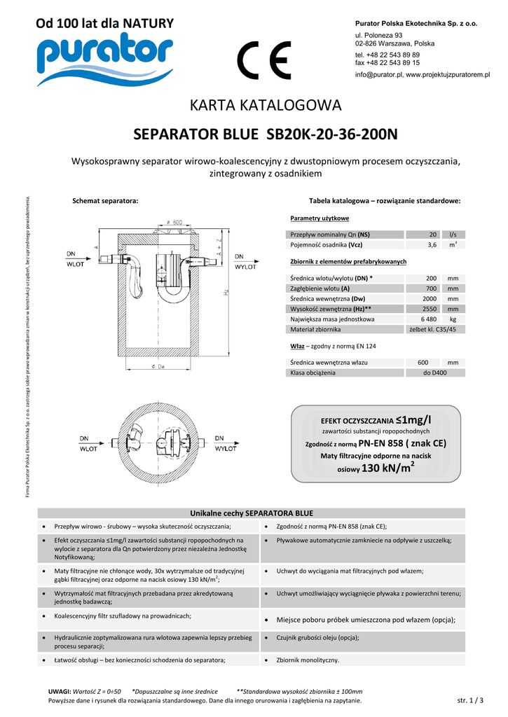 Purator Polska Ekotechnika Sp. z o.o. ul. Poloneza 93 02-826 Warszawa, Polska tel. +48 22 543 89 89 fax +48 22 543 89 15 [email protected], www.projektujzpuratorem.pl KARTA KATALOGOWA SEPARATOR BLUE SB20K-20-36-200N Firma Purator Polska Ekotechnika Sp. z o.o. zastrzega sobie prawo wprowadzania zmian w konstrukcji urządzeń, bez uprzedniego powiadomienia. powiadomienia.uprzedzenia. Wysokosprawny separator wirowo-koalescencyjny z dwustopniowym procesem oczyszczania, zintegrowany z osadnikiem Schemat separatora: Tabela katalogowa – rozwiązanie standardowe: Parametry użytkowe Przepływ nominalny Qn (NS) Pojemność osadnika (Vcz) 20 3,6 l/s m3 Zbiornik z elementów prefabrykowanych Średnica wlotu/wylotu (DN) * Zagłębienie wlotu (A) Średnica wewnętrzna (Dw) Wysokość zewnętrzna (Hz)** Największa masa jednostkowa Materiał zbiornika 200 mm 700 mm 2000 mm 2550 mm 6 480 kg żelbet kl. C35/45 Właz – zgodny z normą EN 124 Średnica wewnętrzna włazu Klasa obciążenia 600 mm do D400 EFEKT OCZYSZCZANIA ≤1mg/l zawartości substancji ropopochodnych Zgodność z normą PN-EN 858 ( znak CE) Maty filtracyjne odporne na nacisk 2 osiowy 130 kN/m Unikalne cechy SEPARATORA BLUE Przepływ wirowo - śrubowy – wysoka skuteczność oczyszczania; Zgodność z normą PN-EN 858 (znak CE); Efekt oczyszczania ≤1mg/l zawartości substancji ropopochodnych na wylocie z separatora dla Qn potwierdzony przez niezależna Jednostkę Notyfikowaną; Pływakowe automatycznie zamkniecie na odpływie z uszczelką; Maty filtracyjne nie chłonące wody, 30x wytrzymalsze od tradycyjnej gąbki filtracyjnej oraz odporne na nacisk osiowy 130 kN/m2; Uchwyt do wyciągania mat filtracyjnych pod włazem; Wytrzymałość mat filtracyjnych przebadana przez akredytowaną jednostkę badawczą; Uchwyt umożliwiający wyciągnięcie pływaka z powierzchni terenu; Koalescencyjny filtr szufladowy na prowadnicach; Miejsce poboru próbek umieszczona pod włazem (opcja); Hydraulicznie zoptymalizowana rura wlotowa zapewnia lepszy przebieg procesu separacji; Czujnik grubości oleju (opcja); Łatwość obsługi – bez konieczności schodzenia do separatora; Zbiornik monolityczny. UWAGI: Wartość Z = 0÷50 *Dopuszczalne są inne średnice **Standardowa wysokość zbiornika ± 100mm Powyższe dane i rysunek dla rozwiązania standardowego. Dane dla innego orurowania i zagłębienia na zapytanie. str. 1 / 3 Purator Polska Ekotechnika Sp. z o.o. ul. Poloneza 93 02-826 Warszawa, Polska tel. +48 22 543 89 89 fax +48 22 543 89 15 [email protected], www.projektujzpuratorem.pl OPIS TECHNICZNY SEPARATORA BLUE SB20K-20-36-200N Firma Purator Polska Ekotechnika Sp. z o.o. zastrzega sobie prawo wprowadzania zmian w konstrukcji urządzeń, bez uprzedniego powiadomienia. powiadomienia.uprzedzenia. Przeznaczenie separatora Wysokosprawny separator wirowo-koalescencyjny typoszeregu SEPARATOR BLUE z dwustopniowym procesem oczyszczania (wirowym oraz koalescencyjnym) zgodny z oznaczeniem S-II-I-P wynikającym z normy PN-EN 858 (posiadający znak CE) przeznaczony jest do oddzielania substancji ropopochodnych zawartych w ściekach deszczowych oraz przemysłowych. SEPARATORY BLUE można stosować także tam gdzie wymagany jest najwyższy stopień separacji np. z terenów rafinerii ropy naftowej, stacji paliw, parkingów, a także w przypadku kierowania odpływu do wód o zaostrzonych wymaganiach (np. rezerwaty przyrody, strefy Natura 2000 itp.). Materiały wykonania Separator zbudowany jest z monolitycznych zbiorników żelbetowych z możliwością nadbudowy. Betonowe prefabrykaty wykonane są zgodnie z projektem technicznym i wymaganiami normy PN-EN 13365 z betonu klasy C35/45, gwarantującego następujące parametry: wytrzymałość na ściskanie ≥ 35 MPa, nasiąkliwość ≤ 5%, wodoszczelność co najmniej W8, mrozoodporność F150, klasy ekspozycji: XC4, XS3, XD3, XF1, XA1 (do XA3 na zapytanie). Zbiornik separatora zabezpieczony jest dodatkowo specjalną farbą zapewniającą pełną szczelność oraz odporność na substancje ropopochodne. Wizualizacja przepływu wewnątrz separatora. Wszystkie elementy wyposażenia wewnętrznego i zewnętrznego separatora, wykonane są z materiałów odpornych na pracę w środowisku agresywnym i nie wymagają dodatkowego izolowania oraz uszczelniania. Budowa wewnętrzna separatora i bezpieczeństwo eksploatacji Na wlocie do separatora znajduje się hydraulicznie zoptymalizowana, wyprofilowana rura wymuszająca przepływ wirowy wewnątrz urządzenia co zwiększa skuteczność oczyszczania. Wewnątrz separatora znajduje się szafa filtracyjna z matami filtracyjnymi o specjalnej strukturze oczkowo-siatkowej zapewniającej wysoką sprawność oczyszczania. Maty filtracyjne wykonane z materiału o dużej twardości, niechłonącego wodę, co ułatwia ich wyjmowania i zwiększa trwałość w stosunku do tradycyjnych gąbek filtracyjnych. Czynności eksploatacyjne oraz serwisowe mogą być w całości prowadzone z powierzchni terenu bez jakiejkolwiek konieczności schodzenie do wnętrza separatora. Filtry wysuwane są do góry po prowadnicach - za specjalne uchwyty umieszczone bezpośrednio pod włazem (nie ma potrzeby demontażu elementów separatora do wyciągnięcia całych filtrów). Po oczyszczeniu filtrów, mogą być one ponownie użyte w tym samym separatorze. Rurka do poboru próbek na odpływie z separatora wyprowadzona jest elastycznym wężem pod właz (opcja), co umożliwia pobór próbek bezpośrednio po otwarciu włazu. Wizualizacja separatora BLUE Kontrolę grubości zgromadzonego oleju oraz warstwy osadu należy wykonać minimum raz na pół roku. Automatyczne zamknięcie na odpływie z gumowa uszczelką zapobiega przedostawaniu się zanieczyszczeń poza separator. Kształt pływaka zapobiega klinowaniu się zamknięcia na odpływie podczas falowania dzięki czemu nie jest wymagane stosowanie prowadnic tego elementu. Pływak posiada specjalny uchwyt do jego wyciągania dzięki czemu jego serwisowani