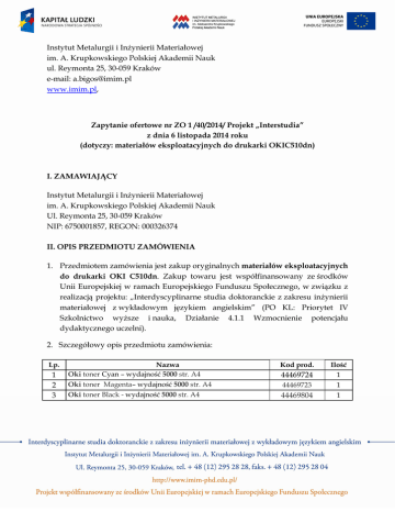 Instytut Metalurgii i Inżynierii Materiałowej im. A. Krupkowskiego Polskiej Akademii Nauk ul. Reymonta 25, 30-059 Kraków e-mail: [email protected] www.imim.pl, Zapytanie ofertowe nr ZO 1 /40/2014/ Projekt „Interstudia” z dnia 6 listopada 2014 roku (dotyczy: materiałów eksploatacyjnych do drukarki OKIC510dn) I. ZAMAWIAJĄCY Instytut Metalurgii i Inżynierii Materiałowej im. A. Krupkowskiego Polskiej Akademii Nauk Ul. Reymonta 25, 30-059 Kraków NIP: 6750001857, REGON: 000326374 II. OPIS PRZEDMIOTU ZAMÓWIENIA 1. Przedmiotem zamówienia jest zakup oryginalnych materiałów eksploatacyjnych do drukarki OKI C510dn. Zakup towaru jest współfinansowany ze środków Unii Europejskiej w ramach Europejskiego Funduszu Społecznego, w związku z realizacją projektu: „Interdyscyplinarne studia doktoranckie z zakresu inżynierii materiałowej z wykładowym językiem angielskim” (PO KL: Priorytet IV Szkolnictwo wyższe i nauka, Działanie 4.1.1 Wzmocnienie potencjału dydaktycznego uczelni). 2. Szczegółowy opis przedmiotu zamówienia: Lp. 1 2 3 Nazwa Oki toner Cyan – wydajność 5000 str. A4 Kod prod. 44469724 Ilość 1 Oki toner Magenta– wydajność 5000 str. A4 44469723 1 Oki toner Black - wydajność 5000 str. A4 44469804 1 III. TERMIN WYKONANIA ZAMÓWIENIA Termin wykonania przedmiotu zamówienia: zamówienia 2 tygodnie od momentu złożenia IV. OPIS SPOSBU PRZYGOTOWANIA OFERTY Oferta powinna: • posiadać datę sporządzenia, • zawierać adres lub siedzibę oferenta, adres e-mail, numer telefonu, numer NIP, • określać całkowitą cenę brutto towaru łącznie z kosztami transportu, ewentualnymi kosztami dodatkowymi, opłatami celnymi i innymi kosztami związanymi bezpośrednio z przedmiotem zapytania ofertowego V. MIEJSCE ORAZ TERMIN SKŁADANIA OFERT 1. Oferta powinna zostać przesłana za pośrednictwem: poczty elektronicznej na adres: [email protected], lub faksem na nr: + 48 12 637 21 92 najpóźniej do dnia 13 listopada 2014 roku (włącznie), do godziny 8. 2. Oferty złożone po terminie nie będą rozpatrywane. 3. Oferent może przed upływem terminu składania ofert zmienić lub wycofać swoją ofertę. 4. W toku badania i oceny ofert Zamawiający może żądać od Oferentów wyjaśnień dotyczących treści złożonych ofert. 5. Ocena ofert zostanie dokonana w dniu 13 listopada 2014 roku, a do Oferenta, który przedstawił najkorzystniejszą ofertę zostanie wysłane zamówienie, zgodnie z przygotowaną ofertą. VI. OCENA OFERT Zamawiający dokona oceny ważnych ofert na podstawie następujących kryteriów: Cena - 100 % VII. DODATKOWE INFORMACJE Dodatkowych informacji udziela pani Agnieszka Bigos pod numerem telefonu: 12 295 2842 oraz pod adresem email: [email protected]