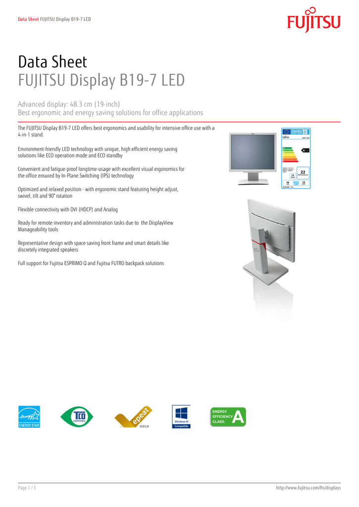 Data Sheet FUJITSU Display B19-7 LED Data Sheet FUJITSU Display B19-7 LED Advanced display: 48.3 cm (19-inch) Best ergonomic and energy saving solutions for office applications The FUJITSU Display B19-7 LED offers best ergonomics and usability for intensive office use with a 4-in-1 stand. Environment-friendly LED technology with unique, high efficient energy saving solutions like ECO operation mode and ECO standby Convenient and fatigue-proof longtime-usage with excellent visual ergonomics for the office ensured by In-Plane Switching (IPS) technology Optimized and relaxed position - with ergonomic stand featuring height adjust, swivel, tilt and 90° rotation Flexible connectivity with DVI (HDCP) and Analog Ready for remote inventory and administration tasks due to the DisplayView Manageability tools Full support for Fujitsu ESPRIMO Q and Fujitsu FUTRO backpack solutions Page 1 / 5 Representative design with space saving front frame and smart details like discretely integrated speakers http://www.fujitsu.com/fts/displays Data Sheet FUJITSU Display B19-7 LED Technical details Special features 4-in-1 Stand, In-Plane Switching (IPS) technology, Eco button for Eco mode and 3-coloured Eco status LED, Pivot, DisplayView™ IT Suite, 24/7 usage, Integrated speakers 4-in-1 Stand 130 mm 45 mm 90° -5° / +35° 340° IPS/LED Anti-glare, 3H hard coating 1000:1 2,000,000:1 5 ms (in video mode) 178°/178° CR10:1 16.7 million colors (Hi-FRC) 250 cd/m2 5:4 48.3 cm (19-inch) 1,280 x 1,024 pixel 1,024 x 768 pixel, 800 x 600 pixel, 720 x 400 pixel, 640 x 480 pixel 375 x 300 mm 0.293 mm Ergonomic stand Stand Height adjust range Picture height over desk (min) Rotation to portrait Tilt angle Swivel angle Picture performance Panel and backlit Screen Surface Treatment Contrast - typical Contrast - advanced Response time gray to gray typical Viewing angle (h/v) - typical Color performance Brightness - typical Size and resolution Aspect ratio Diagonal Size Resolution (native) Resolution (interpolated) Picture size Pixel Pitch Frequencies Horizontal Vertical Frequencies - bandwidth Connectivity DVI VGA/D-SUB Audio signal output Audio signal input Audio sound output Ease-of-use menu Languages 30 - 82 kHz 56 - 76 Hz 165 Mhz 1 x DVI-D (HDCP) 1 x D-SUB 3.5 mm stereo phone jack for head phone 3.5 mm stereo phone jack 2 x 1.5 W Brightness / Contrast Color Image adjust Audio Information Setup Arabic, Czech, Danish, Dutch, English, Finnish, French, German, Italian, Norwegian, Polish, Portuguese, Russian, Spanish, Swedish, Turkish, Japanese, Chinese simply, Chinese traditional Brightness, Contrast, Black level, Auto level sRGB, 6500K, 7500K, Native, Custom Color (R,G,B) Clock, Phase, H-Position, V-Position Mute, Volume Model name, Serial number, Resolution/mode, Signal input Input select, Language, DDC/CI, OSD-Timeout, Factory preset Power consumption (typical) Soft switch off Power save mode Operating with EPA settings Operating maximum brightness Power supply 0.19 W 0.21 W 12.76 W 17 W integrated Page 2 / 5 http://www.fujitsu.com/fts/displays Data Sheet FUJITSU Display B19-7 LED Compliance link Quality and Reliability MTBF (demonstrated) Dimensions / Weight / Environmental Dimension without stand (W x D x H) Dimension with stand (W x D x H) Weight (packed) Weight (unpacked) Weight (Monitor only) Operating ambient temperature Miscellaneous Miscellaneous Color Package content Display delivered accessories 100 V - 240 V 50 Hz - 60 Hz 1 Energy Efficiency Class: A, CE certification according to EC Directive 2004/108/EEC, EN 60950, RoHS, WEEE, IT-EcoDeclaration, EN 60601-1-2 DY19-7 TÜV GS EAC FCC Class B, cUL VCCI KC (planned) TÜV-S S-Mark BSMI (planned) CCC SASO TCO Certified Displays 6.0, ENERGY STAR® 7.0, EPEAT® Gold (dedicated regions), Zero bright and dark pixel faults, Subpixel faults according to ISO9241-307 (Pixel fault class I) http://globalsp.ts.fujitsu.com/sites/certificates 70,000 h 414 x 64 x 349 mm 16.30 x 2.52 x 13.74 inch 414 x 209 x 370 mm 16.30 x 8.23 x 14.57 inch 7.2 kg 15.9 lbs 5.48 kg 12.1 lbs 2.85 kg 6.3 lbs 5 - 35 °C Model Germany Russia USA/Canada Japan South Korea Argentina Singapore Taiwan China Saudi Arabia Global Speakers off Power notes Electrical values Rated voltage range Rated frequency range Protection class Compliance Europe VESA DDC/ CI, Flat Display Mounting Interface VESA MIS-D 100 C, Kensington lock prepared Marble grey Display delivered accessories notes DVI-D Data cable 1.8 m D-SUB Data cable 1.8 m Audio cable 1.8 m Power cable for wall socket (Euro-Schuko-Type CEE7) 1.8 m Quickstart flyer Utility CD Warranty booklet Safety booklet Data cables and audio cable detachable on display Order information Order Code EAN Code S26361-K1471-V140 4051554619824 Page 3 / 5 http://www.fujitsu.com/fts/displays Data Sheet FUJITSU Display B19-7 LED Order information Country specific order code Accessories information 3 years (depending on country) Collect & Return Service (depending on country specific requirements) http://support.ts.fujitsu.com/warranty 5 years after end of product life http://www.fujitsu.com/fts/services/support Warranty Warranty period Warranty type Warranty Terms & Conditions Spare Parts availability Service Weblink BDL:K1471V140-UK - with UK power cable, mandatory for Arabian countries BDL:K1471V140-CHN - with China power cable and CEL, mandatory for China BDL:K1471V140-ID - with Import label, mandatory for Indonesia BDL:K1471V140-INT - W/o power cable, mandatory for countries where import with EU cable is not allowed Further helpful options: Available Privacy Filters: http://globalsp.ts.fujitsu.com/ dmsp/Publications/public/ds-Privacy-Filter.pdf Available Adapters: http://globalsp.ts.fujitsu.com/dmsp/ Publications/public/pos-connectivity.pdf Page 4 / 5 http://www.fujitsu.com/fts/displays Data Sheet FUJITSU Display B19-7 LED More information Fujitsu OPTIMIZATION Services More information Copyrights In addition to FUJITSU Display B19-7 LED, Fujitsu provides a range of platform 