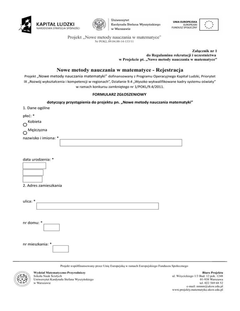 Projekt „Nowe metody nauczania w matematyce” Nr POKL.09.04.00-14-133/11 Załącznik nr 1 do Regulaminu rekrutacji i uczestnictwa w Projekcie pt. „Nowe metody nauczania w matematyce” Nowe metody nauczania w matematyce - Rejestracja Projekt „Nowe metody nauczania matematyki” dofinansowany z Programu Operacyjnego Kapitał Ludzki, Priorytet IX „Rozwój wykształcenia i kompetencji w regionach”, Działanie 9.4 „Wysoko wykwalifikowane kadry systemu oświaty” w ramach konkursu zamkniętego nr 1/POKL/9.4/2011. FORMULARZ ZGŁOSZENIOWY dotyczący przystąpienia do projektu pn. „Nowe metody nauczania matematyki” 1. Dane ogólne płeć: * Kobieta Mężczyzna nazwisko i imiona: * data urodzenia: * 2. Adres zamieszkania ulica: * nr domu: * nr mieszkania: * Projekt współfinansowany przez Unię Europejską w ramach Europejskiego Funduszu Społecznego Wydział Matematyczno-Przyrodniczy Szkoła Nauk Ścisłych Uniwersytet Kardynała Stefana Wyszyńskiego w Warszawie Biuro Projektu ul. Wóycickiego 1/3 Bud. 12 pok. 1248 01-938 Warszawa tel. 022 569 68 52 e-mail: [email protected] www.projekty.matematyka.uksw.edu.pl Projekt „Nowe metody nauczania w matematyce” Nr POKL.09.04.00-14-133/11 miejscowość: * kod: * 3. Dane kontaktowe tel. domowy: * tel. służbowy: * tel. kom.: * e-mail: * 4. Wykształcenie nazwa wyższej uczelni (szkoły): * rok ukończenia: * tytuł: * 5. Obecne miejsce zatrudnienia Projekt współfinansowany przez Unię Europejską w ramach Europejskiego Funduszu Społecznego Wydział Matematyczno-Przyrodniczy Szkoła Nauk Ścisłych Uniwersytet Kardynała Stefana Wyszyńskiego w Warszawie Biuro Projektu ul. Wóycickiego 1/3 Bud. 12 pok. 1248 01-938 Warszawa tel. 022 569 68 52 e-mail: [email protected] www.projekty.matematyka.uksw.edu.pl Projekt „Nowe metody nauczania w matematyce” Nr POKL.09.04.00-14-133/11 6. Niepełnosprawn-y/-a ruchowo Tak Nie 7. Przynależność do delegatury Kuratorium Oświaty Ciechanów Ostrołęka Płock Siedlce Radom Warszawa 8. Edycja Proszę wybrać preferowany termin zajęć: * I edycja II edycja III edycja OŚWIADCZENIA UCZESTNIKA Deklaruję przystąpienie do udziału w projekcie „Nowe metody nauczania matematyki” w ramach Priorytetu IX – Rozwój wykształcenia i kompetencji w regionach Działanie 9.4. Wysoko wykwalifikowane kadry systemu oświaty – Programu Operacyjnego Kapitał Ludzki 2007-2013. Projekt współfinansowany przez Unię Europejską w ramach Europejskiego Funduszu Społecznego Wydział Matematyczno-Przyrodniczy Szkoła Nauk Ścisłych Uniwersytet Kardynała Stefana Wyszyńskiego w Warszawie Biuro Projektu ul. Wóycickiego 1/3 Bud. 12 pok. 1248 01-938 Warszawa tel. 022 569 68 52 e-mail: [email protected] www.projekty.matematyka.uksw.edu.pl Projekt „Nowe metody nauczania w matematyce” Nr POKL.09.04.00-14-133/11 Oświadczam, że jestem świadomy/a, że mój udział w projekcie jest współfinansowany przez Unię Europejską w ramach Europejskiego Funduszu Społecznego. Oświadczam, że informacje zawarte w formularzu zgłoszeniowym do projektu „Nowe metody nauczania matematyki” są zgodne z prawdą. Oświadczam, iż na dzień złożenia formularza zgłoszeniowego do projektu „Nowe metody nauczania matematyki”, spełniam wymagane warunki: 1. jestem osobą wykonującą pracę na podstawie umowy o pracę w placówce oświatowej, 2. z własnej inicjatywy jestem zainteresowany/a nabyciem nowych, uzupełnieniem lub podwyższeniem kwalifikacji i umiejętności. Oświadczam, iż zgodnie z Ustawą z dnia 29 sierpnia 1997 r. o ochronie danych osobowych (jednolity tekst Dz. U. Nr 101 poz. 926 z dnia 2002r.) wyrażam zgodę na gromadzenie, przetwarzanie i przekazywanie moich danych osobowych, w tym danych wrażliwych dla potrzeb rekrutacji, monitorowania i ewaluacji projektu „Nowe metody nauczania matematyki” realizowanego w ramach Działania 9.4. PO KL. Przyjmuję do wiadomości, że złożenie formularza zgłoszeniowego nie jest jednoznaczne z przyjęciem mnie do projektu. Projekt współfinansowany przez Unię Europejską w ramach Europejskiego Funduszu Społecznego Wydział Matematyczno-Przyrodniczy Szkoła Nauk Ścisłych Uniwersytet Kardynała Stefana Wyszyńskiego w Warszawie Biuro Projektu ul. Wóycickiego 1/3 Bud. 12 pok. 1248 01-938 Warszawa tel. 022 569 68 52 e-mail: [email protected] www.projekty.matematyka.uksw.edu.pl