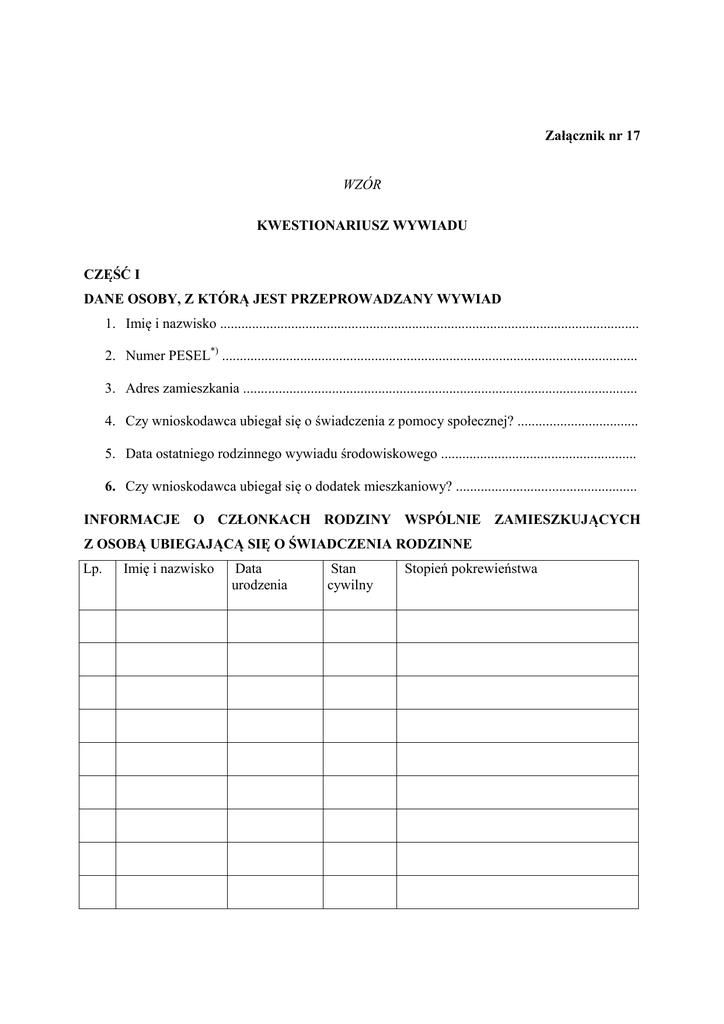 Załącznik nr 17 WZÓR KWESTIONARIUSZ WYWIADU CZĘŚĆ I DANE OSOBY, Z KTÓRĄ JEST PRZEPROWADZANY WYWIAD 1. Imię i nazwisko ...................................................................................................................... 2. Numer PESEL*) ..................................................................................................................... 3. Adres zamieszkania ............................................................................................................... 4. Czy wnioskodawca ubiegał się o świadczenia z pomocy społecznej? .................................. 5. Data ostatniego rodzinnego wywiadu środowiskowego ....................................................... 6. Czy wnioskodawca ubiegał się o dodatek mieszkaniowy? ................................................... INFORMACJE O CZŁONKACH RODZINY WSPÓLNIE ZAMIESZKUJĄCYCH Z OSOBĄ UBIEGAJĄCĄ SIĘ O ŚWIADCZENIA RODZINNE Lp. Imię i nazwisko Data urodzenia Stan cywilny Stopień pokrewieństwa _______________________________ *) W przypadku gdy nie nadano numeru PESEL, należy podać serię i numer dokumentu potwierdzającego tożsamość. CZĘŚĆ II WYWIAD Z OSOBĄ, KTÓRA UBIEGA SIĘ O ŚWIADCZENIA RODZINNE 1. Czy z Panią/Panem i z dziećmi w jednym mieszkaniu zamieszkuje ojciec/matka dzieci (powody wspólnego zamieszkiwania)? ............................................................................................................................................................ 2. Czy Pani/Pan prowadzi wspólne gospodarstwo domowe z matką/ojcem dziecka? ............................................................................................................................................................ 3. Czy drugi z rodziców łoży na utrzymanie dzieci? Proszę podać w jakim zakresie. ............................................................................................................................................................ 4. Czy Pani/Pan wystąpiła/wystąpił o zasądzenie alimentów (czy są płacone, jeżeli nie, czy wystąpiła/wystąpił Pani/Pan z wnioskiem o ich egzekucję i ściganie osoby uchylającej się od płacenia)? ............................................................................................................................................................ 5. Proszę określić formy uczestnictwa ojca/matki dziecka w procesie jego edukacji, opieki codziennej, organizacji wspólnych wyjazdów wakacyjnych, wspólnego spędzania świąt. ............................................................................................................................................................ ............................................................................................................................................................ ……..………………………………………………… (podpis osoby ubiegającej się o świadczenia rodzinne) CZĘŚĆ III WYWIAD Z NAJBLIŻSZYMI SĄSIADAMI, WYCHOWAWCAMI, OPIEKUNAMI LUB NAUCZYCIELAMI DZIECKA ORAZ INNYMI OSOBAMI, KTÓRE MOGĄ POSIADAĆ NIEZBĘDNE INFORMACJE O RODZINIE ............................................................................................................................................................ ............................................................................................................................................................ ............................................................................................................................................................ ............................................................................................................................................................ ............................................................................................................................................................ ............................................................................................................................................................ ............................................................................................................................................................ ............................................................................................................................................................ ............................................................................................................................................................ ............................................................................................................................................................ ............................................................................................................................................................ ............................................................................................................................................................ ................................................................................... (podpis osoby, z którą przeprowadzono wywiad) CZĘŚĆ IV OCENA SYTUACJI RODZINY − UWAGI I WNIOSKI OSOBY PRZEPROWADZAJĄCEJ WYWIAD ............................................................................................................................................................ ............................................................................................................................................................ ............................................................................................................................................................ ............................................................................................................................................................ ......................................................................................................