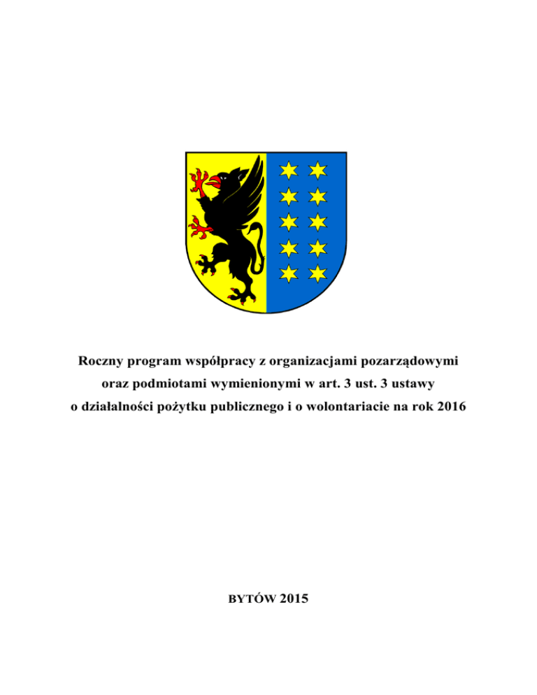 Roczny program współpracy z organizacjami pozarządowymi oraz podmiotami wymienionymi w art. 3 ust. 3 ustawy o działalności pożytku publicznego i o wolontariacie na rok 2016 BYTÓW 2015 WSTĘP Powiat Bytowski dążąc do stworzenia demokratycznego ładu społecznego, jako istotny czynnik uznaje budowę społeczeństwa obywatelskiego, którego bazą jest ścisłe partnerstwo między administracją samorządową a organizacjami pozarządowymi. Organizacje pozarządowe, obok sektora publicznego i prywatnego są trzecim sektorem działającym na rzecz dobra publicznego. Stanowią one bazę dla rozwoju lokalnych społeczności, zrzeszają bowiem najaktywniejszych i najbardziej wrażliwych na sprawy społeczne obywateli danego środowiska. Podejmują cenne działania dla dobra mieszkańców oraz integrują i aktywizują społeczność lokalną. Z tego względu stanowią znakomite uzupełnienie działań podejmowanych przez lokalne samorządy. Współpraca jednostek samorządowych z organizacjami pozarządowymi stwarza szansę na lepsze zorganizowanie wspólnego celu, jakim jest poprawa jakości życia mieszkańców powiatu bytowskiego. Niezmiernie ważne jest więc budowanie i utrwalanie podstaw trwałej i systematycznej współpracy administracji samorządowej z organizacjami pozarządowymi. MIEJSCE REALIZACJI: - Powiat Bytowski ADRESACI PROGRAMU: - organizacje pozarządowe, - podmioty, o których mowa w art. 3 ust. 3 ustawy z dnia 24 kwietnia 2003 r. o działalności pożytku publicznego i o wolontariacie. KOORDYNATOR PROGRAMU: - Zarząd Powiatu Bytowskiego POSTANOWIENIA OGÓLNE I. 1. 2. 3. II. Program określa cele, formy, zasady, zakres przedmiotowy oraz priorytetowe zadania publiczne realizowane w ramach współpracy z organizacjami, prowadzącymi działalność pożytku publicznego, w zakresie prowadzenia działalności w sferze zadań publicznych powiatu. Ilekroć w Programie jest mowa o: a) ustawie – należy przez to rozumieć ustawę z dnia 24 kwietnia 2003 r. o działalności pożytku publicznego i o wolontariacie (Dz. U. z 2014 r., poz. 1118 j.t.), b) organizacjach pozarządowych – należy przez to rozumieć organizacje pozarządowe oraz podmioty, o których mowa w art. 3 ust. 3 ww. ustawy, c) programie – należy przez to rozumieć Roczny program współpracy z organizacjami pozarządowymi oraz podmiotami, o których mowa w art. 3 ust. 3 ustawy o działalności pożytku publicznego i o wolontariacie na rok 2016, d) Radzie – należy przez to rozumieć Radę Powiatu Bytowskiego, e) Zarządzie – należy przez to rozumieć Zarząd Powiatu Bytowskiego, f) Staroście – należy przez to rozumieć Starostę Bytowskiego, g) Starostwie – należy przez to rozumieć Starostwo Powiatowe w Bytowie, h) powiecie – należy przez to rozumieć powiat bytowski, i) konkursie – należy przez to rozumieć otwarty konkurs ofert na realizację zadań publicznych, o których mowa w art. 4, ust. 1 ustawy. Współpraca powiatu i organizacji obejmuje zadania publiczne, o których mowa w art. 4 ust. 1 ustawy. CELE PROGRAMU: 1. Cel główny Celem głównym jest kreowanie społeczeństwa obywatelskiego poprzez wzmocnienie aktywności organizacji pozarządowych, jako czynnika będącego potencjałem powiatu. 2. Cele szczegółowe: a) wspieranie działań na rzecz wzmacniania istniejących i pobudzania nowych inicjatyw związanych z powstawaniem nowych organizacji pozarządowych w powiecie działających dla dobra lokalnej społeczności, b) umacnianie w społecznej świadomości poczucia odpowiedzialności za rozwój lokalnego środowiska, c) integracja i wspólne działanie organizacji pozarządowych i Starostwa dążące do realizacji sfery zadań publicznych wymienionych w art. 4 ust. 1 ustawy, d) promocja działalności organizacji pozarządowych, e) pobudzenie innowacyjności i konkurencyjności poprzez umożliwienie organizacjom pozarządowym indywidualnego wystąpienia z ofertą realizacji konkretnych zadań publicznych, f) poprawa jakości życia współmieszkańców poprzez pełniejsze zaspokajanie potrzeb społecznych, g) aktywizowanie organizacji pozarządowych do pozyskiwania środków finansowych ze źródeł pozabudżetowych na realizację zadań służących mieszkańcom powiatu, h) budowanie partnerstwa w zakresie pozyskiwania środków finansowych i realizacji programów finansowanych ze środków pozabudżetowych, III. ZASADY WSPÓŁPRACY: 1. IV. Współpraca z organizacjami pozarządowymi w powiecie opiera się na następujących zasadach: a) pomocniczości – realizacja szerokiego zakresu zadań publicznych w sposób ekonomiczny, rzetelny i terminowy poprzez struktury usytuowane najbliżej obywateli, w szczególności przez organizacje pozarządowe, oparta na obopólnej chęci wzajemnych działań; b) partnerstwa – współpraca równorzędnych dla siebie podmiotów w rozwiązywaniu wspólnie zidentyfikowanych i zdefiniowanych problemów społecznych, wypracowywaniu sposobów ich rozwiązywania, osiąganiu razem wytyczonych celów i wykonywaniu zadań publicznych; c) suwerenności – szanując swoją autonomię powiat i organizacje pozarządowe nie narzucają sobie wzajemnie zadań, posiadają zdolność do bycia podmiotem prawa, oraz mają prawo do samodzielnego definiowania i poszukiwania sposobów rozwiązywania problemów i zadań; d) efektywności – wspólne dążenie do osiągnięcia możliwie najlepszych efektów realizacji zadań publicznych uwzględniając kryterium racjonalności i optymalizacji kosztów; e) uczciwej konkurencji – równe traktowanie wszystkich podmiotów w zakresie wykonywanych zadań publicznych, poprzez działania oparte na obiektywnych i równych dla wszystkich stron kryteriach oraz zasadach; f) jawności – zachowanie przejrzystości podejmowanych działań oraz informowanie o swojej działalności, realizowanych projektach, pozyskanych i planowanych środkach finansowych na realizację zadań publicznych. ZAKRES PRZEDMIOTOWY WSPÓŁP