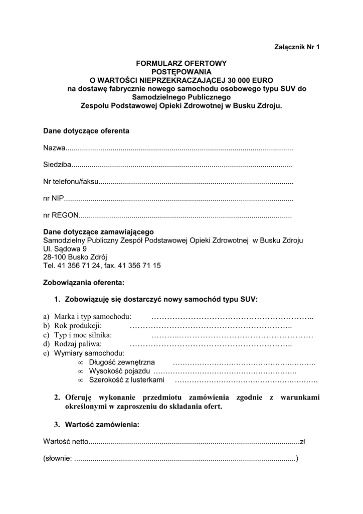 Załącznik Nr 1 FORMULARZ OFERTOWY POSTĘPOWANIA O WARTOŚCI NIEPRZEKRACZAJĄCEJ 30 000 EURO na dostawę fabrycznie nowego samochodu osobowego typu SUV do Samodzielnego Publicznego Zespołu Podstawowej Opieki Zdrowotnej w Busku Zdroju. Dane dotyczące oferenta Nazwa................................................................................................................ Siedziba............................................................................................................. Nr telefonu/faksu................................................................................................ nr NIP................................................................................................................. nr REGON......................................................................................................... Dane dotyczące zamawiającego Samodzielny Publiczny Zespół Podstawowej Opieki Zdrowotnej w Busku Zdroju Ul. Sądowa 9 28-100 Busko Zdrój Tel. 41 356 71 24, fax. 41 356 71 15 Zobowiązania oferenta: 1. Zobowiązuję się dostarczyć nowy samochód typu SUV: a) b) c) d) e) Marka i typ samochodu: …………………………………………………….. Rok produkcji: …………………………………………………….. Typ i moc silnika: ………..…………………………………………… Rodzaj paliwa: …………………………………………………….. Wymiary samochodu: • Długość zewnętrzna ………………………………………….………. • Wysokość pojazdu ………………………………………………….. • Szerokość z lusterkami ………………………………………….………. 2. Oferuję wykonanie przedmiotu zamówienia zgodnie z warunkami określonymi w zaproszeniu do składania ofert. 3. Wartość zamówienia: Wartość netto........................................................................................................zł (słownie: .............................................................................................................) podatek VAT …..%..............................................................................................zł Wartość brutto..................................................................................................... .zł (słownie: .............................................................................................................) 4. Okres gwarancji wynosi: • Na usterki mechaniczne bez limitu kilometrów……………………. • Na powłokę lakierniczą……………………………………………… • Na perforację nadwozia……………………………………………… 5. Zobowiązuję się wykonać przedmiot zamówienia w terminie ………..dni od podpisania umowy, tj. do dnia…………………………………………….. Oświadczenia: Oświadczam, że samochód spełnia wszystkie parametry określone w pkt. 2 zaproszenia i jego wyposażenie jest zgodne ze szczegółowym opisem przedmiotu zamówienia. .................................................... miejscowość i data ................................................................. / podpis i pieczęć imienna osoby/osób uprawnionych do reprezentowania Wykonawcy/