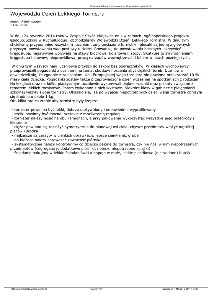 Publiczna Szkoła Podstawowa nr 19 w Kędzierzynie-Koźlu Wojewódzki Dzień Lekkiego Tornistra Autor: Administrator 13.02.2014. W dniu 24 stycznia 2014 roku w Zespole Szkół Miejskich nr 1 w ramach ogólnopolskiego projektu „Szkoła w Ruchu” obchodziliśmy Wojewódzki Dzień Lekkiego Tornistra. W dniu tym chcieliśmy przypomnieć wszystkim uczniom, że przeciążone tornistry i plecaki są jedną z głównych przyczyn powstawania wad postawy u dzieci. Prowadzą do powstawania bocznych skrzywień kręgosłupa, negatywnie wpływają na stawy biodrowe, kolanowe i stopy. Skutkuje to zwyrodnieniami kręgosłupa i stawów, nieprawidłową pracą narządów wewnętrznych i bólem w latach późniejszych. W dniu tym wszyscy nasi uczniowie przyszli do szkoły bez podręczników. W klasach wychowawcy przeprowadzili pogadanki z uczniami na temat skutków noszenia zbyt ciężkich toreb. Uczniowie dowiedzieli się, że zgodnie z zaleceniami Unii Europejskiej waga tornistra nie powinna przekraczać 10 % masy ciała dziecka. Pogadanki zostały także przeprowadzone dzień wcześniej na spotkaniach z rodzicami. Na lekcjach oraz na kółku plastycznym uczniowie wykonywali piękne rysunki oraz plakaty związane z tematem lekkich tornistrów. Potem wykonano z nich wystawę. Niektóre klasy w gabinecie pielęgniarki szkolnej ważyły swoje tornistry. Okazało się, że po wyjęciu niepotrzebnych dzieci waga tornistra obniżyła się średnio o około 1 kg. Oto kilka rad co zrobić aby tornistry były lżejsze: - tornister powinien być lekki, dobrze usztywniony i odpowiednio wyprofilowany - szelki powinny być mocne, szerokie z możliwością regulacji - tornister należy nosić na obu ramionach, a przy pakowaniu wykorzystać wszystkie jego przegrody i kieszenie - ciężar powinno się rozłożyć symetrycznie do pionowej osi ciała, cięższe przedmioty włożyć najbliżej pleców i środka - najlżejsze są zeszyty w cienkich oprawkach, lepsze cienkie niż grube - na bieżąco należy sprawdzać zawartość piórnika - systematycznie należy kontrolujmy co dziecko pakuje do tornistra, czy nie nosi w nim niepotrzebnych przedmiotów (segregatory, dodatkowe piórniki, notesy, niepotrzebne książki) - śniadanie pakujmy w lekkie śniadaniówki a napoje w małe, lekkie plastikowe (nie szklane) butelki. http://sp19kkozle.wodip.opole.pl Kreator PDF Utworzono 3 March, 2017, 11:38