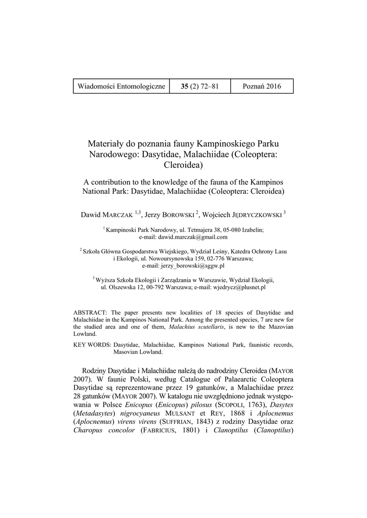 Wiadomości Entomologiczne 35 (2) 72–81 Poznań 2016 Materiały do poznania fauny Kampinoskiego Parku Narodowego: Dasytidae, Malachiidae (Coleoptera: Cleroidea) A contribution to the knowledge of the fauna of the Kampinos National Park: Dasytidae, Malachiidae (Coleoptera: Cleroidea) Dawid MARCZAK 1,3, Jerzy BOROWSKI 2, Wojciech JĘDRYCZKOWSKI 3 1 2 Kampinoski Park Narodowy, ul. Tetmajera 38, 05-080 Izabelin; e-mail: [email protected] Szkoła Główna Gospodarstwa Wiejskiego, Wydział Leśny, Katedra Ochrony Lasu i Ekologii, ul. Nowoursynowska 159, 02-776 Warszawa; e-mail: [email protected] 3 Wyższa Szkoła Ekologii i Zarządzania w Warszawie, Wydział Ekologii, ul. Olszewska 12, 00-792 Warszawa; e-mail: [email protected] ABSTRACT: The paper presents new localities of 18 species of Dasytidae and Malachiidae in the Kampinos National Park. Among the presented species, 7 are new for the studied area and one of them, Malachius scutellaris, is new to the Mazovian Lowland. KEY WORDS: Dasytidae, Malachiidae, Kampinos National Park, faunistic records, Masovian Lowland. Rodziny Dasytidae i Malachiidae należą do nadrodziny Cleroidea (MAYOR 2007). W faunie Polski, według Catalogue of Palaearctic Coleoptera Dasytidae są reprezentowane przez 19 gatunków, a Malachiidae przez 28 gatunków (MAYOR 2007). W katalogu nie uwzględniono jednak występowania w Polsce Enicopus (Enicopus) pilosus (SCOPOLI, 1763), Dasytes (Metadasytes) nigrocyaneus MULSANT et REY, 1868 i Aplocnemus (Aplocnemus) virens virens (SUFFRIAN, 1843) z rodziny Dasytidae oraz Charopus concolor (FABRICIUS, 1801) i Clanoptilus (Clanoptilus) MATERIAŁY DO POZNANIA FAUNY KAMPINOSKIEGO PARKU NARODOWEGO […] 73 strangulatus (ABEILLE de PERRIN, 1885) z rodziny Malachiidae (BURAKOWSKI i in. 1986, 2000). W związku z tym, można przyjąć, że liczba przedstawicieli Dasytidae w Polsce wynosi 22 gatunki, a Malachiidae 30 gatunków. Z obszaru Niziny Mazowieckiej, w obrębie której znajduje się Kampinoski Park Narodowy znanych jest 15 gatunków Dasytidae i 14 gatunków Malachiidae (BURAKOWSKI i in. 1986, KUBISZ i in. 2000, GUTOWSKI i in. 2006, RUTA i in. 2011). Należy jednak zaznaczyć, że dane o niektórych gatunkach: Aplocnemus (Aplocnemus) tarsalis (C.R. SAHLBERG, 1822), Aplocnemus (Aplocnemus) virens virens (SUFFRIAN, 1843), Danacea (Danacea) pallipes (PANZER, 1793) odnoszą się do XIX i początku XX wieku (BURAKOWSKI i in. 1986). Celem poniższego opracowania jest uzupełnienie informacji dotyczących występowania przedstawicieli omawianych rodzin na obszarze Kampinoskiego Parku Narodowego. Informacje pochodzą z badań autorów oraz obserwacji terenowych, które w ostatnich latach zostały zintensyfikowane. Okazy dowodowe znajdują się w kolekcjach autorów i zbiorach przyrodniczych Kampinoskiego Parku Narodowego. W pracy zastosowano następujące skróty: OOŚ – Obszar Ochrony Ścisłej, KPN – Kampinoski Park Narodowy, IBL-2 – pułapka ekranowa, IBL-5 – pułapka przegrodowa. Przy każdym stanowisku podano kod odpowiedniego kwadratu siatki UTM. Gatunki nowe dla Niziny Mazowieckiej oznaczono gwiazdką [*]. Nazewnictwo taksonów przyjęto za MAYOR (2007). Badania zostały przeprowadzone przy wsparciu Funduszu Leśnego Państwowego Gospodarstwa Leśnego Lasy Państwowe w roku 2014 w ramach tematu „Chrząszcze saproksyliczne jako wskaźnik naturalności ekosystemów leśnych borów sosnowych Kampinoskiego Parku Narodowego” i 2015 w ramach tematu „Ocena stopnia naturalności siedlisk grądowych Kampinoskiego Parku Narodowego w oparciu o faunę chrząszczy saproksylicznych”. Dasytidae CASTELNAU, 1840 Aplocnemus (Aplocnemus) impressus (MARSHAM, 1802) – DC79 OOŚ Debły, 1-30 IV 2011, 2 exx., w pułapkę IBL-5 na grabie; idem, 1-30 IV 2015, 1 ex., w pułapkę IBL-5 na dębie; 74 D. MARCZAK, J. BOROWSKI, W. JĘDRYCZKOWSKI – DC89 OOŚ Sieraków, oddz. 77, 1-31 VII 2014, 1 ex., w pułapkę IBL-5 na sośnie; oddz. 100: 1-30 IV 2014 (1 ex.), 1-31 V 2014 (1 ex.), w pułapkę IBL-5 na sośnie. W Polsce rzadko i sporadycznie spotykany, notowany z nielicznych rozproszonych stanowisk w różnych częściach kraju, do połowy lat 80. XX wieku notowany z 16 krain (BURAKOWSKI i in. 1986). Ostano wykazany z Pojezierza Mazurskiego (GUTOWSKI i in. 2006). Na Nizinie Mazowieckiej znany z szeregu stanowisk, w tym podany z 5 lokalizacji w KPN (BURAKOWSKI i in. 1986, KUBISZ i in. 2000). Aplocnemus (Aplocnemus) nigricornis nigricornis (FABRICIUS, 1792) – DC 89 OOŚ Sieraków, oddz. 100, 1-31 VII 2014, 1 ex., w pułapkę IBL-5 na sośnie. Znany z prawie wszystkich krain, poza Górami Świętokrzyskimi, Wyżyną Lubelską, Niziną Sandomierską, Kotliną Nowotarską, Bieszczadami i Tatrami, jednak jest dość rzadko znajdowanym chrząszczem (BURAKOWSKI i in. 1986). Z Niziny Mazowieckiej znany z szeregu stanowisk, w tym z Łomianek w sąsiedztwie KPN (BURAKOWSKI i in. 1986). Dasytes (Metadasytes) fusculus (ILLIGER, 1801) – DC69 Granica, 6 VI 2009, 1 ex., na upatrzonego. W Polsce dość rzadko spotykany, notowany z nielicznych stanowisk w 14 krainach (BURAKOWSKI i in. 1996). Na Nizinie Mazowieckiej znany z kilku lokalizacji (BURAKOWSKI i in. 1986), wykazany także z KPN (KUBISZ i in. 2000). Dasytes (Dasytes) niger (LINNAEUS, 1761) – DC59 Famułki Królewskie, 28 VI 2010, 2 exx., na upatrzonego; – DC79 OOŚ Debły, 1-31 V 2015, 1 ex., w pułapkę IBL-5 na wiązie szypułkowym; idem, 1-31 VII 2015, 1 ex., w pułapkę IBL-5 na jesionie; – DC89 OOŚ Sieraków, oddz. 100, 1-30 VI 2014, 2 exx., w pułapkę IBL-5 na sośnie; – DC89 OOŚ Zaborów Leśny, 1-31 V 2011, 1 ex., w pułapkę IBL-5 na dębie; idem, 1-31 VII 2011, 1 ex., w pułapkę IBL-2 w siedlisku TilioCarpinetum; idem, 16-31 V 2015, 1 ex., w pułapkę Moerick;a wiszącą w koronach dębów; idem, 1-31 VII 2015, 2 exx., w pułapkę IBL-5 na grabie; MATERIAŁY DO POZNANIA FAUNY KAMPINOSKIEGO PARKU NARODOWEGO […] 75 – DC89 Pociecha, 18 VI 2010, 6 exx., na kwiatach Aegopodium 