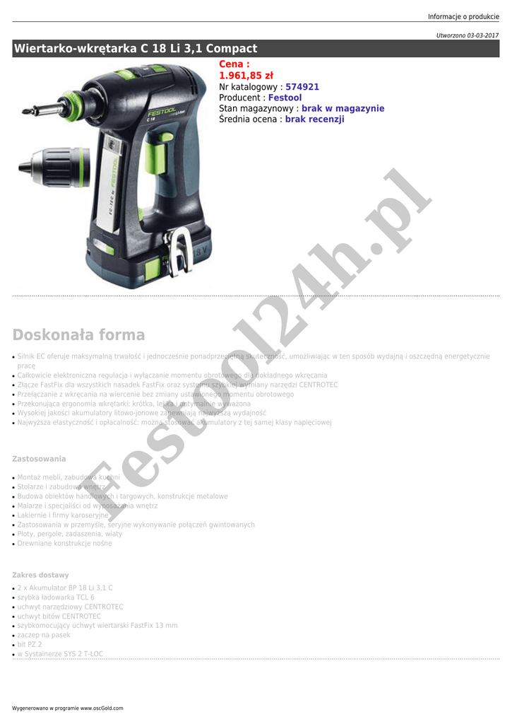 Informacje o produkcie Utworzono 03-03-2017 Wiertarko-wkrętarka C 18 Li 3,1 Compact Cena : 1.961,85 zł l2 4h . pl Nr katalogowy : 574921 Producent : Festool Stan magazynowy : brak w magazynie Średnia ocena : brak recenzji Doskonała forma ● ● ● ● ● oo ● Silnik EC oferuje maksymalną trwałość i jednocześnie ponadprzeciętną skuteczność, umożliwiając w ten sposób wydajną i oszczędną energetycznie pracę Całkowicie elektroniczna regulacja i wyłączanie momentu obrotowego dla dokładnego wkręcania Złącze FastFix dla wszystkich nasadek FastFix oraz systemu szybkiej wymiany narzędzi CENTROTEC Przełączanie z wkręcania na wiercenie bez zmiany ustawionego momentu obrotowego Przekonująca ergonomia wkrętarki: krótka, lekka i optymalnie wyważona Wysokiej jakości akumulatory litowo-jonowe zapewniają najwyższą wydajność Najwyższa elastyczność i opłacalność: można stosować akumulatory z tej samej klasy napięciowej ● ● ● ● ● ● ● ● Fe Zastosowania st ● Montaż mebli, zabudowa kuchni Stolarze i zabudowa wnętrz Budowa obiektów handlowych i targowych, konstrukcje metalowe Malarze i specjaliści od wyposażania wnętrz Lakiernie i firmy karoseryjne Zastosowania w przemyśle, seryjne wykonywanie połączeń gwintowanych Płoty, pergole, zadaszenia, wiaty Drewniane konstrukcje nośne Zakres dostawy ● ● ● ● ● ● ● ● 2 x Akumulator BP 18 Li 3,1 C szybka ładowarka TCL 6 uchwyt narzędziowy CENTROTEC uchwyt bitów CENTROTEC szybkomocujący uchwyt wiertarski FastFix 13 mm zaczep na pasek bit PZ 2 w Systainerze SYS 2 T-LOC Wygenerowano w programie www.oscGold.com