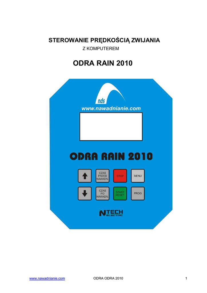 STEROWANIE PRĘDKOŚCIĄ ZWIJANIA Z KOMPUTEREM ODRA RAIN 2010 www.nawadnianie.com ODRA ODRA 2010 1 Spistreści 1 OPIS ..................................................................................................................... 3 2 CHARAKTERYSTYKA - ODRA RAIN 2010 3 WYŚWIETLANE INFORMACJE (OKNA) ............................................................. 4 ...................................................... 4 1-szze okno ....................................................................................................................................................... 4 2-gie okno.. ...................................................................................................................................................... 5 3-cie okno ...................................................................................................................................................... 7 4-te okno …………………………………………………………………………………………………………..7 4 DESZCZOWNIA PRACA Z KOMPUTEREM ODRA RAIN 2010 ....................... 7 INSTRUKCJA OBSŁUGI dla ODRA RAIN 2010 .................................................................................... 8 USTAWIENIE PRĘDKOŚCI ..................................................................................................................... 8 4.2 PREZED i POIRYGACYJNA FAZA .......................................................................................... 9 4.3 START ........................................................................................................................................ 10 4.4 CZAS STARTU ........................................................................................................................... 10 4.4.1 Wprowadzenie czasu startu .................................................................................................... 11 4.5 PROCEDURA DLA USTAWIANIA 4 RÓŻNYCH PRĘDKOŚCI ............................................ 11 4.6 MONITORING .......................................................................................................................... 13 4.7 STOP .......................................................................................................................................... 13 4.8 RADIO MONITORING .............................................................................................................. 14 4.9 CZUJNIK CIŚNIENIA (WYPOSAŻENIE W OPCJI) ................................................................ 15 5 OPIS USTEREK –ODRA RAIN 2010 .................................................................. 15 6 PROCEDURA PROGRAMOWANIA ................................................................... 16 6.1 AKUMULAOR ........................................................................................................................... 18 6.2 PANEL SŁONECZNY ................................................................................................................ 19 6.3 POŁĄCZENIE KABLI - SCHEMAT PODŁĄCZENIA ............................................................. 19 6.3.1 SPRAWDZENIE POŁĄCZEN .................................................. Error! Bookmark not defined. 6.3.2 SPRAWDZENIE CZUJNIKA DŁUGOŚCI ............................................................................. 20 www.nawadnianie.com ODRA ODRA 2010 2 1 OPIS ODRA RAIN 2010 pozwala na łatwe sterowanie deszczownią za pomocą przycisków. Podświetlany, czterowierszowy wyświetlacz zapewnia wszechstronną sygnalizację aktualnego stanu funkcjonalnego maszyny. Poprzez ciągłe porównywanie wartości ustawionej i wartości rzeczywistej prędkości nawijania przewodu PE można uzyskać zakładaną dawkę polewową. ODRA RAIN 2010 składa się ze skrzynki z układami elektronicznymi, okablowania z podłączonymi czujnikami długości rury polietylenowej (PE), prędkości zwijania i odcięcia, jak również podłączenia do akumulatora, ogniwa słonecznego oraz silnika regulującego pracę turbiny. Przygotowane jest również podłączenie służące do instalacji zaworu odcinającego (wyposażenie opcjonalne). Układy elektroniczne ODRA RAIN 2010 są bardzo wytrzymałej konstrukcji i zostały przetestowane w różnorodnych warunkach klimatycznych. Jeżeli mimo to występują problemy, zaleca się wymianę kompletnej skrzynki z układami elektronicznymi. Jeżeli uszkodzony jest czujnik, możliwa jest również wymiana wyłącznie tego czujnika. ODRA RAIN 2010 4200 posiada wyjście dla transmitera SMS 4210 pozwalającego na sterowanie deszczownią za pomocą telefonu komórkowego. UWAGA ! Płyta czołowa musi być otwierana bardzo ostrożnie! W celu zagwarantowania ,że uszczelka pokrywy będzie zapewniać odpowiednie zabezpieczenie przez wilgocią, pokrywa musi być zamykana również bardzo ostrożnie! UWAGA ! Zawsze należy odłączyć akumulator zanim przystąpi się do prac spawalniczych i remontowych w urządzeniu DESZCZOWNIA! Ze względu na standardowe ogniwo słoneczne, w sezonie irygacyjnym doładowywanie akumulatora nie jest konieczne. Jeżeli jednak doładowanie okaże się konieczne, maksymalny prąd ładowania nie powinien przekroczyć 2 A. ODRA RAIN 2010 utrzymuje wcześniej ustawioną prędkość wybierania na stałym poziomie w trakcie całego cyklu wybierania rury. Ze względu na proste przypisanie funkcji do przycisków, wymagania stawiane operatorowi obsługującemu urządzenie są bardzo niskie. Normalnie, ODRA RAIN 2010 pracuje w trybie oszczędzania energii bez wyświetlania informacji. W celu uaktywnienia układów elektronicznych i włączenia podświetlenia standardowego wyświetlacza, wystarczy po prostu nacisną przycisk „Włączenie zasilania” (POWER ON) lub przycisk „Wybieranie rury PE” (PE-pipe retraction). www.nawadnianie.com ODRA ODRA 2010 3 2 Charakterystyka ODRA RAIN 2010 > > > > > > Regulacja prędkości zwijania ru