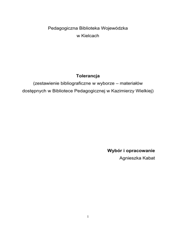 Pedagogiczna Biblioteka Wojewódzka w Kielcach Tolerancja (zestawienie bibliograficzne w wyborze – materiałów dostępnych w Bibliotece Pedagogicznej w Kazimierzy Wielkiej) Wybór i opracowanie Agnieszka Kabat 1 I. Druki zwarte: 1. Hamer, Hanna : Psychologia społeczna : teoria i praktyka / Hanna Hamer. – Warszawa : Wydawnictwo Difin, 2005. – S. 140-161 : Uprzedzenia i tolerancja Sygn. 29559 Wypożyczalnia 2. Nelson, Todd D : Psychologia uprzedzeń / Todd D. Nelson. – Gdańsk : Gdańskie Wydawnictwo Psychologiczne, 2003 Sygn. 29698 Wypożyczalnia 3. Rosół, Adam : Tolerancja w edukacji wielokulturowej // W: Edukacja wobec ładu globalnego / pod red. Tadeusza Lewowickiego. – Warszawa : Wydawnictwo Akademickie „Żak”, 2002. – S. 153-165 Sygn. 29272 Wypożyczalnia 4. Saniewska, Danuta : Zastępstwo bez problemów / Danuta Saniewska, Krystyna Stelmaszczyk-Wijaczka. – Kielce : Zakład Wydawniczy SFS, 2001. – S. 133-138 : Tolerancja i nietolerancja (lekcja I, II) Sygn. 29114 Wypożyczalnia 5. Siegień-Matyjewicz, Alicja Joanna : Tolerancja // W : Encyklopedia Pedagogiczna XXI wieku. T. 6 / pod red. Tadeusza Pilcha . – Warszawa : Wydawnictwo Akademickie „Żak”, 2007. – S. 696-699 Sygn. 30222 Czytelnia 6. Tolerancja i nietolerancja : wybrane zagadnienia / pod red. Roberta Borkowskiego. – Kraków : Oficyna Wydawnicza ABRYS, 2002 Sygn. 29319 Wypożyczalnia 7. Wolność, równość, odmienność : nowe ruchy społeczne w Polsce początku XXI wieku / pod red. Ireneusza Krzemińskiego. – Warszawa : Wydawnictwo Akademickie i Profesjonalne, 2006 Sygn. 29718 Wypożyczalnia 2 Artykuły z prasy: 1. Bogdanowicz, Małgorzata : Lekcje moralnego wsparcia / Małgorzata Bogdanowicz // „Edukacja i Dialog”. – 2003, nr 9, s. 28-30 2. Chojnowska, Mariola : Trudności w osiąganiu tożsamości płciowej / Mariola Chojnowska // „Edukacja i Dialog”. – 2007, nr 5, s. 40-44 3. Chwist, Anna : Przeciw godności człowieka / Anna Chwist // „Edukacja i Dialog”. – 2002, nr 3, s. 11-16 4. Czarnecka, Danuta „Zero tolerancji”… – od idei do realizacji / Danuta Czarnecka // „Remedium”. – 2007, nr 9, s. 4-5 5. Dzierzgowska, Irena : Demokratyczna szkoła? / Irena Dzierzgowska // „Dyrektor Szkoły”. – 2008, nr 4, s. 8-11 6. Dzyga, Krystyna : Uczę się ciebie, człowieku. Rzecz o tolerancji (z wywiadem w tle) / Krystyna Dzyga // „Warsztaty Polonistyczne”. – 2000, nr 4, s. 23-29 7. Głowiński, Marek : Powinności wychowawcy / Marek Głowiński // „Remedium”. – 2001, nr 10, s. 8-9 8. Górniewicz, Józef : Tolerancja religijna i etniczna w świadomości młodzieży szkolnej / Józef Górniewicz // „Nowa Szkoła”. – 1992, nr 7, s. 405-408 9. Harasimik, Agnieszka : Komputer na lekcjach… o tolerancji / Agnieszka Harasimik // „Język Polski w Szkole IV-VI”.– 2006/2007, nr 4, s. 84-92 10. Hołówka, Jacek : Granice tolerancji / Jacek Hołówka // „Problemy Opiekuńczo-Wychowawcze”. – 1995, nr 4, s. 2-9 (wkładka) 11. Janos, Danuta : Tolerancja-tak czy nie? / Danuta Janos // „Poradnik Bibliotekarza". – 2001, nr 7 – 8, s. 10-14 12. Kamińska, Dorota : O przyjaźni z dzieckiem / Dorota Kamińska // „Problemy Opiekuńczo-Wychowawcze”. – 2002, nr 7, s. 30-33 13. Karwowski, Krzysztof : Jedność w różnorodności / Krzysztof Karwowski // „Edukacja i Dialog”. – 2006, nr 4, s. 38-43 14. Komosińska, Krystyna : Znaczenie tolerancji dla nietolerancji / Krystyna Komosińska // „Lider”. – 1993, nr 7-8, s.18-19 15. Krasiejko, Izabela : Tolerancja wobec niepełnosprawnych / Izabela Krasiejko // „Edukacja i Dialog”. – 2000, nr 8, s. 31-34 16. Kubiciel, Elżbieta : Rozwijanie postawy tolerancji / Elżbieta Kubiciel // „Życie Szkoły”. – 1993, nr 10, s. 590-593 17. Marzec, Danuta Krystyna : Tolerancja wobec chorych na AIDS / Danuta Krysyna Marzec // „Problemy Opiekuńczo-Wychowawcze”. – 1995, nr 6, s. 1315 (wkładka) 18. Mączyńska, Jolanta : Tolerancja. Lekcja biblioteczna, lekcja religii w klasie 1-3 gimnazjum / Jolanta Mączyńska, Wanda Śliwowska // „Biblioteka w Szkole”. – 3 2003, nr 2, s. 12 19. Młynarczuk, Anna : Ze sobą, a nie obok siebie(edukacja równoległa w procesie kształtowania postaw tolerancji / Anna Młynarczuk // „Nowa Szkoła”.- 2008, nr 5, s. 11-14 20. Nikitorowicz, Jerzy : Tolerancja. Idea i cel edukacji międzykulturowej / Jerzy Nikitorowicz // „Problemy Opiekuńczo-Wychowawcze”. – 1995, nr 6, s. 27(wkładka) 21. Ogonowski, Zbigniew : O tolerancji / Zbigniew Ogonowski // „Społeczeństwo Otwarte”. – 1995, nr 4, s. 26-32 22. Pasamotnik, Barbara : Kłopoty z tolerancją / Barbara Pasamotnik // „Edukacja”. – 2003, nr 3, s. 98-98 23. Pasamotnik, Barbara : O tolerancji dla nietolerancji / Barbara Pasamotnik // „Edukacja i Dialog”. – 2003, nr 5, s. 18-24 24. Piekarski, Grzegorz : Śmiać się ze zboczeńców? / Grzegorz Piekarski // „Edukacja i Dialog”. – 2007, nr 5, s. 45-49 25. Prajsner, Mira : Czy polska młodzież jest tolerancyjna? / Mira Prajsner // „Remedium”. – 2007, nr 5, s. 14-15 (wkładka Pomarańczowe Forum) 26. Prajsner, Mira : Wokół pojęcia tolerancji / Mira Prajsner // „Remedium”. – 2005, nr 7-8, s. IV-V 27. Raczkowska, Jadwiga : Uczenie tolerancji pilnym zadaniem wychowawczym / Jadwiga Raczkowska // „Problemy Opiekuńczo-Wychowawcze”. – 2000, nr 5, s. 25-30 28. Rakowska, Bożena : Z tolerancją na ty / Bożena Rakowska // „Życie Szkoły”. – 2007, nr 1, s. 29-33 29. Romaniuk, Ryszard : Bez ślubu i błogosławieństwa / Ryszard Romaniuk // „Niebieska Linia”. – 2003, nr 6, s. 12-14 30. Sadłowska, Małgorzata : Ulepszyć siebie / Małgorzata Sadłowska, Jerzy Nachiło // „Problemy Opiekuńczo-Wychowawcze”.– 1995, nr 5, s. 14-16 (wkładka) 31. Słowikowska, Teresa : Ważne słowo-Tolerancja (scenariusz zajęć wychowawczych dla gimnazjum) / Teresa Słowikowska // „Nowa Szkoła”. – 2005, nr 10