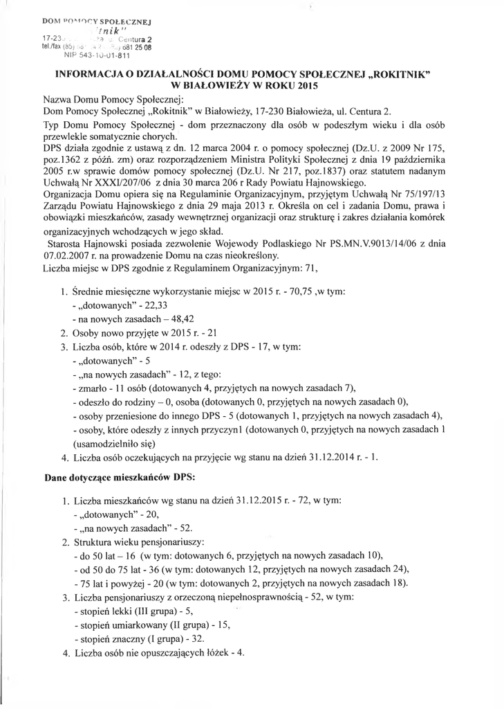 DOM POMOCY SPOŁECZNEJ -Unik” 17-23;.'‘.i ;: *iża, ui Centura 2 tel./fax (85) ó8‘ O 24 681 25 08 NIP 543-10-01-811 INFORMACJA O DZIAŁALNOŚCI DOMU POMOCY SPOŁECZNEJ „ROKITNIK” W BIAŁOWIEŻY W ROKU 2015 Nazwa Domu Pomocy Społecznej: Dom Pomocy Społecznej „Rokitnik” w Białowieży, 17-230 Białowieża, ul. Centura 2. Typ Domu Pomocy Społecznej - dom przeznaczony dla osób w podeszłym wieku i dla osób przewlekle somatycznie chorych. DPS działa zgodnie z ustawą z dn. 12 marca 2004 r. o pomocy społecznej (Dz.U. z 2009 Nr 175, poz.1362 z późń. zm) oraz rozporządzeniem Ministra Polityki Społecznej z dnia 19 października 2005 r.w sprawie domów pomocy społecznej (Dz.U. Nr 217, poz.1837) oraz statutem nadanym Uchwałą Nr XXXI/207/06 z dnia 30 marca 206 r Rady Powiatu Hajnowskiego. Organizacja Domu opiera się na Regulaminie Organizacyjnym, przyjętym Uchwałą Nr 75/197/13 Zarządu Powiatu Hajnowskiego z dnia 29 maja 2013 r. Określa on cel i zadania Domu, prawa i obowiązki mieszkańców, zasady wewnętrznej organizacji oraz strukturę i zakres działania komórek organizacyjnych wchodzących w jego skład. Starosta Hajnowski posiada zezwolenie Wojewody Podlaskiego Nr PS.MN.V.9013/14/06 z dnia 07.02.2007 r. na prowadzenie Domu na czas nieokreślony. Liczba miejsc w DPS zgodnie z Regulaminem Organizacyjnym: 71, 1. Średnie miesięczne wykorzystanie miejsc w 2015 r. - 70,75 ,w tym: - „dotowanych” - 22,33 - na nowych zasadach - 48,42 2. Osoby nowo przyjęte w 2015 r. - 21 3. Liczba osób, które w 2014 r. odeszły z DPS - 17, w tym: - „dotowanych” - 5 - „na nowych zasadach” - 12, z tego: - zmarło - 11 osób (dotowanych 4, przyjętych na nowych zasadach 7), - odeszło do rodziny - 0, osoba (dotowanych 0, przyjętych na nowych zasadach 0), - osoby przeniesione do innego DPS - 5 (dotowanych 1, przyjętych na nowych zasadach 4), - osoby, które odeszły z innych przyczyni (dotowanych 0, przyjętych na nowych zasadach 1 (usamodzielniło się) 4. Liczba osób oczekujących na przyjęcie wg stanu na dzień 31.12.2014 r. - 1. Dane dotyczące mieszkańców DPS: 1. Liczba mieszkańców wg stanu na dzień 31.12.2015 r. - 72, w tym: - „dotowanych” - 20, - „na nowych zasadach” - 52. 2. Struktura wieku pensjonariuszy: - do 50 lat - 16 (w tym: dotowanych 6, przyjętych na nowych zasadach 10), - od 50 do 75 lat - 36 (w tym: dotowanych 12, przyjętych na nowych zasadach 24), - 75 lat i powyżej - 20 (w tym: dotowanych 2, przyjętych na nowych zasadach 18). 3. Liczba pensjonariuszy z orzeczoną niepełnosprawnością - 52, w tym: - stopień lekki (III grupa) - 5, - stopień umiarkowany (II grupa) - 15, - stopień znaczny (I grupa) - 32. 4. Liczba osób nie opuszczających łóżek - 4. 5. Liczba osób mających problemy z poruszaniem się - 28, w tym: - poruszających się na wózkach inwalidzkich - 12 Miesięczny koszt utrzymania mieszkańca w 2015 roku (zgodnie z zarządzeniem Starosty Powiatu Białostockiego) - 2.995,00 zł. Średnia miesięczna odpłatność mieszkańca w 2015 r. na starych zasadach - 742,11 zł. Dotacja wojewody - śr. 2.105,00 zł na osobę Średnia miesięczna odpłatność mieszkańca w 2015 r. na nowych zasadach - 700,55 zł (bez uwzględnienia odpłatności gminy). Miesięczny koszt utrzymania jednego mieszkańca ustalony na 2016 r. - 2.966,00 zł. Struktura zatrudnienia w DPS wg stanu na 31.12.2015 r.: - Liczba zatrudnionych osób ogółem 47 (liczba etatów 44,05). - Liczba osób zatrudnionych w dziale terapeutyczno-opiekuńczym - 33 osób, (liczba etatów 31,25): • Wskaźnik zatrudnienia w dziale terapeutyczno-opiekuńczym dla osób w podeszłym wieku 0,41, • Wskaźnik zatrudnienia w dziale terapeutyczno-opiekuńczym dla osób przewlekle somatycznie chorych 0,6. - Inne osoby , których prace Dom uwzględnia przy obliczaniu wskaźnika zatrudnienia w dziale terapeutyczno-opiekuńczym - wolontariusze z Zespołu Szkół z Dodatkową Nauką Języka Białoruskiego w Hajnówce oraz wolontariusze z Zespołu Szkolno-przedszkolnego w Białowieży. Informacje dotyczące świadczonych usług przez DPS (formy i liczba osób korzystających): - terapia zajęciowa W zależności od oczekiwań, uzdolnień oraz sprawności mieszkańców mogą oni realizować się w następujących formach terapii zajęciowej: 1) Ergoterapia - towarzyszy, wspiera, usprawnia i usamodzielnia osoby mające trudności w wykonywaniu podstawowych czynności dnia codziennego, którzy ze względu na różnego rodzaju dysfunkcje zmuszeni są do korzystania z pomocy innych osób. W ramach ergoterapii w naszym Domu prowadzi się: • zajęcia dziewiarskie - robótki na drutach, ozdoby pomponikowe, szydełkowanie ( serwetki, kwiaty, ozdoby świąteczne, okolicznościowe, sezonowe ), • zajęcia krawieckie - szycie obrazków, zabawek, kwiatów, ozdób świątecznych, tworzenie biżuterii z materiałów pasmanteryjnych, przeróbki i naprawa garderoby, • zajęcia hafciarskie - haft krzyżykowy, gwiazdkowy, wstążeczko wy, matematyczny, ściegi ozdobne, • zajęcia tkackie - tkanie w ramkach, wyplatanie makram ( gobelinki, kwietnki, biżuteria), • plecionkarstwo - wyroby ze słomy, brzozy, wikliny, sznurka sizalowego, papierowa wiklina, • bibułkarstwo, kompozycje florystyczne - zdobnictwo i dekoratorstwo, kompozycje kwiatowe, • bukieciarstwo - kompozycje kwiatowe z zasuszonych kwiatów, traw, zbóż i innych darów natury ( szyszek, kory, mchu, kamyków ), • zajęcia ogrodnicze - pielęgnacja kwiatów i krzewów ozdobnych. W zajęciach ergoterapii bierze udział od 8 do 11 osób. 2) Arteterapia - jest sposobem wykorzystania sztuki do celów terapeutycznych. W ramach arteterapii w naszym Domu prowadzone są zajęcia w postaci: • rysunku i malarstwa ( rysowanie kredkami ołówkowymi, świecowymi i pastelami oraz malowanie farbami olejnymi, plakatowymi i akwarelą), • modelowanie w masach plastycznych (plastelina, modelina, masa papierowa, masa solna), • bibuł