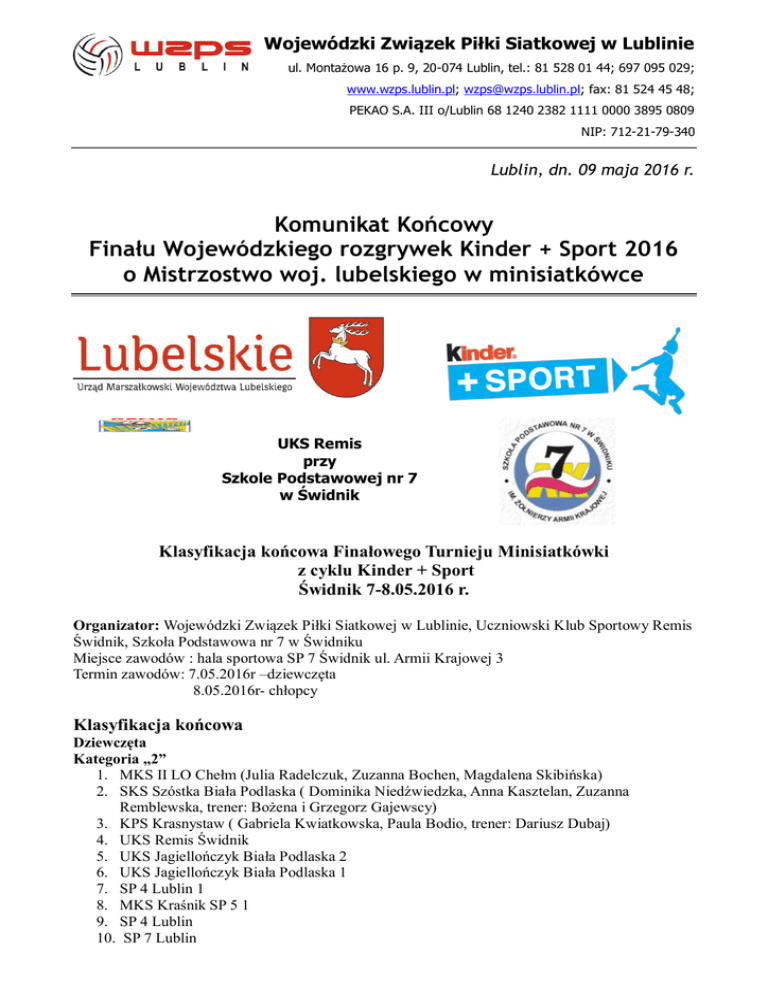 Wojewódzki Związek Piłki Siatkowej w Lublinie ul. Montażowa 16 p. 9, 20-074 Lublin, tel.: 81 528 01 44; 697 095 029; www.wzps.lublin.pl; [email protected]; fax: 81 524 45 48; PEKAO S.A. III o/Lublin 68 1240 2382 1111 0000 3895 0809 NIP: 712-21-79-340 Lublin, dn. 09 maja 2016 r. Komunikat Końcowy Finału Wojewódzkiego rozgrywek Kinder + Sport 2016 o Mistrzostwo woj. lubelskiego w minisiatkówce UKS Remis przy Szkole Podstawowej nr 7 w Świdnik Klasyfikacja końcowa Finałowego Turnieju Minisiatkówki z cyklu Kinder + Sport Świdnik 7-8.05.2016 r. Organizator: Wojewódzki Związek Piłki Siatkowej w Lublinie, Uczniowski Klub Sportowy Remis Świdnik, Szkoła Podstawowa nr 7 w Świdniku Miejsce zawodów : hala sportowa SP 7 Świdnik ul. Armii Krajowej 3 Termin zawodów: 7.05.2016r –dziewczęta 8.05.2016r- chłopcy Klasyfikacja końcowa Dziewczęta Kategoria „2” 1. MKS II LO Chełm (Julia Radelczuk, Zuzanna Bochen, Magdalena Skibińska) 2. SKS Szóstka Biała Podlaska ( Dominika Niedźwiedzka, Anna Kasztelan, Zuzanna Remblewska, trener: Bożena i Grzegorz Gajewscy) 3. KPS Krasnystaw ( Gabriela Kwiatkowska, Paula Bodio, trener: Dariusz Dubaj) 4. UKS Remis Świdnik 5. UKS Jagiellończyk Biała Podlaska 2 6. UKS Jagiellończyk Biała Podlaska 1 7. SP 4 Lublin 1 8. MKS Kraśnik SP 5 1 9. SP 4 Lublin 10. SP 7 Lublin Wojewódzki Związek Piłki Siatkowej w Lublinie ul. Montażowa 16 p. 9, 20-074 Lublin, tel.: 81 528 01 44; 697 095 029; www.wzps.lublin.pl; [email protected]; fax: 81 524 45 48; PEKAO S.A. III o/Lublin 68 1240 2382 1111 0000 3895 0809 NIP: 712-21-79-340 11. UKS Sokół Tomaszów Lubelski 3 12. UKS Sokół Tomaszów Lubelski 1 13. SP 44 Lublin 14. MKS SP 5 Kraśnik 2 15. UKS Sokół Tomaszów Lubelski 2 16. UKS Olimp Opole Lubelski Kategoria „3” 1. SP 43 Lublin ( Joanna Pawlik, Dominika Siczek, Julia Owczaruk, Karolina Ciesielka) 2. SKS Szóstka Biała Podlaska (Izabela Sochacka, Paulina Iwaniuk, Iga Pykacz, Oliwia Lempaszek, trener: Bożena i Grzegorz Gajewscy) 3. UKS Remis Świdnik ( Natalia Szkoła, Elżbieta Bochniak, Aleksandra Kudeń, Zuzanna Osek, Karolina Bronisz, trener: Renata Łapa) 4. UKS Sokół Tomaszów Lubelski 5. UKS Jagiellończyk Biała Podlaska 6. UKS Remis Świdnik 2 7. UKS Międzyrzecka Trójka Międzyrzec Podlaski 8. SP 24 Lublin 9. SP 7 Lublin 10. UKS Olimpijczyk Lubycza Królewska 11. UKS Remis Świdnik 3 12. UKS Sokół Tomaszów Lubelski 13. SP 44 Lublin 14. UKS Olimp Opole Lubelskie 15. MKS SP 5 Kraśnik 1 16. MKS SP 5 Kraśnik 2 Kategoria „4” 1. SKS Szóstka Biała Podlaska ( Martyna Najdyhor, Natalia Arseniuk, Anastazja Mościcka, Paulina Martyniuk, Gabriela Jarząbkowska, trener: Bożena i Grzegorz Gajewscy) 2. MKS SP 5 Kraśnik 1 ( Monika Dudek, Weronika Ciepła, Wiktoria Ciepła, Emila Albin, Katarzyna Gil, Karina Gil, trener: Andrzej Zdenicki) 3. SP 5 Chełm (Kinga Sienkiewicz, Martyna Pastuszak, Karina Abraszek, Angelika Kołodziej, Dominika Toborek, trener: Jarosław Rafalski) 4. TPS Lublin 5. UKS Remis Świdnik 6. UKS Sokół Tomaszów Lubelski 7. UKS Jagiellończyk Biała Podlaska 8. UKS Olimpijczyk Lubycza Królewska 9. SP Aleksandrów 10. MKS SP 5 Kraśnik 2 11. UKS „9” Puławy/ Dragon 1 Wojewódzki Związek Piłki Siatkowej w Lublinie ul. Montażowa 16 p. 9, 20-074 Lublin, tel.: 81 528 01 44; 697 095 029; www.wzps.lublin.pl; [email protected]; fax: 81 524 45 48; PEKAO S.A. III o/Lublin 68 1240 2382 1111 0000 3895 0809 NIP: 712-21-79-340 Chłopcy Kategoria „2” 1. KPS Krasnystaw ( Tomasz Zieliński, Szymon Dubaj, trener: Dariusz Dubaj) 2. UKS Remis Świdnik 1 ( Paweł Szydło, Rafał Szczuchniak, Szymon Łukasiewicz, trener: Dariusz Kuźma) 3. MKS Skałka Annopol 1 (Wiktor Mysłowski, Kacper Michalski, Dawid Paćkowski, trener: Zbigniew Siewierski) 4. UKS Serbinów Biała Podlaska 1 5. UKS Serbinów Biała Podlaska 3 6. SP 24 Lublin 7. SP 5 Chełm 8. UKS Serbinów Biała Podlaska 2 9. UKS Olimp Opole Lubelskie 10. SP 7 Kamień 11. UKS Międzyrzecka Trójka 12. UKS Serbinów Biała Podlaska 5 13. SP 21 Lublin 2 14. UKS Remis Świdnik 2 15. SP 21 Lublin 1 16. MKS Skałka Annopol Kategoria „3” 1. SP Nałęczów 1 ( Tymoteusz Ambrozik, Maks Pordyka, Igor Dziura, Jan Kęsik, trener :Czesław Mitura) 2. UKS Tempo Chełm ( Piotr Wróblewski, Piotr Grządkowski, Eryk Emerla, Dominik Myszura, trener: Wojciech Miszczuk) 3. UKS Serbinów Biała Podlaska 1 ( Dominik Słowik, Sebastian Jasiński, Szymon Grytczuk, trener: Paweł Wasiak, Joanna Biała-Sobieraj) 4. UKS Remis Świdnik 1 5. KPS Krasnystaw 6. MKS SP 6 Kraśnik 7. UKS Międzyrzecka Trójka 1 8. UKS Międzyrzecka Trójka 2 9. SP 21 Lublin 10. UKS Remis Świdnik 2 11. SP Nałęczów 12. UKS Serbinów Biała Podlaska 2 Kategoria „4” 1. UKS Międzyrzecka Trójka ( Piotr Małachwiejczyk, Michał Kalinowski, Szymon Żuk, Jan Lecyk, Bartłomiej Węgrzyniak, Jakub Wieczorek, Trener: Sylwester Oksiejuk) 2. SP Nałęczów ( Karol Wojczuk, Szymon Kowalczyk, Piotr Rodzik, Patryk Kęsik, ,Mateusz Wijaszka, Kamil Siwek, Trener: Adam Musiał) 3. SP 5 Łuków (Filip Adamowicz, Daniel Machniak, Krzysztof Osiak, Jakub Chromiński, Kamil Juszczyński, Mateusz Bancerz, Trener: Artur Głębicki) 4. TPS Lublin 1 ( Wojciech Bukowski, Wojciech Knieć, Wiktor Dymowicz, Jakub MendezChmielewski, Jakub Gołyski, Trener: Maciej Kołodziejczyk) Wojewódzki Związek Piłki Siatkowej w Lublinie ul. Montażowa 16 p. 9, 20-074 Lublin, tel.: 81 528 01 44; 697 095 029; www.wzps.lublin.pl; [email protected]; fax: 81 524 45 48; PEKAO S.A. III o/Lublin 68 1240 2382 1111 0000 3895 0809 NIP: 712-21-79-340 5. MKS SP 6 Kraśnik 1 6. UKS Serbinów Biała Podlaska 1 7. MKS SP 6 Kraśnik 2 8. UKS Serbinów Biała Podlaska 2 9. TPS Lublin 2 10. SP 5 Chełm 1 11. TPS Lublin 3 12. SP 5 Chełm 2 Wydział Minisiatkówki