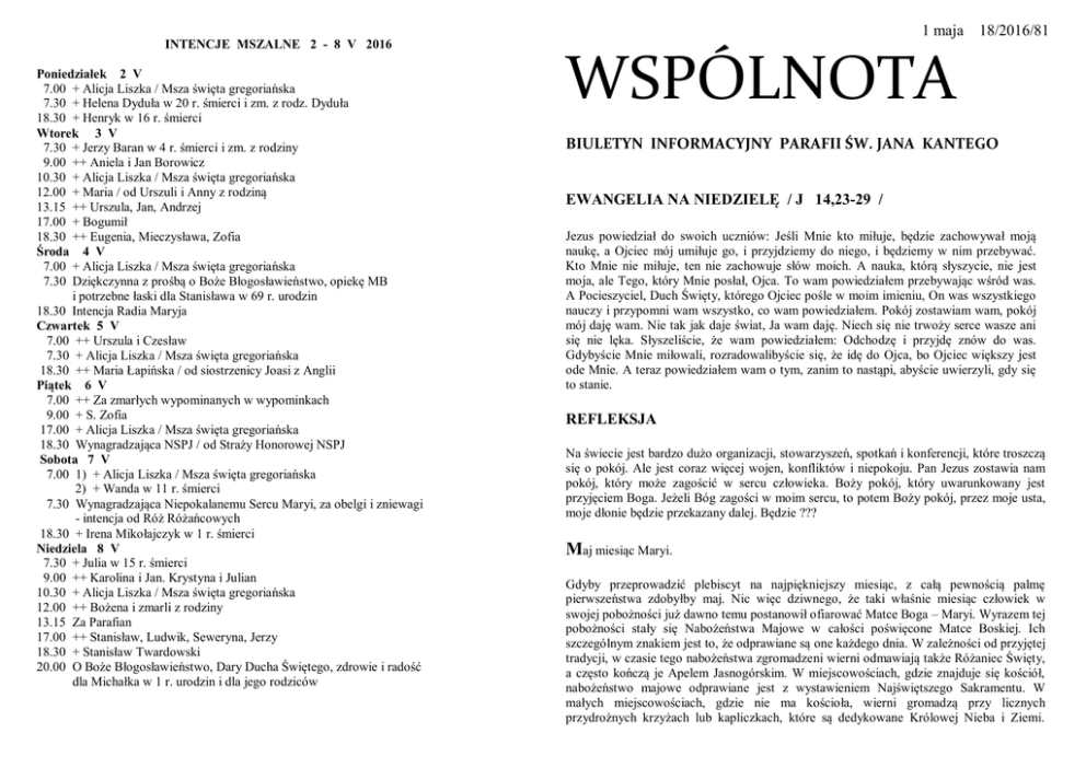 1 maja 18/2016/81 INTENCJE MSZALNE 2 - 8 V 2016 Poniedziałek 2 V 7.00 + Alicja Liszka / Msza święta gregoriańska 7.30 + Helena Dyduła w 20 r. śmierci i zm. z rodz. Dyduła 18.30 + Henryk w 16 r. śmierci Wtorek 3 V 7.30 + Jerzy Baran w 4 r. śmierci i zm. z rodziny 9.00 ++ Aniela i Jan Borowicz 10.30 + Alicja Liszka / Msza święta gregoriańska 12.00 + Maria / od Urszuli i Anny z rodziną 13.15 ++ Urszula, Jan, Andrzej 17.00 + Bogumił 18.30 ++ Eugenia, Mieczysława, Zofia Środa 4 V 7.00 + Alicja Liszka / Msza święta gregoriańska 7.30 Dziękczynna z prośbą o Boże Błogosławieństwo, opiekę MB i potrzebne łaski dla Stanisława w 69 r. urodzin 18.30 Intencja Radia Maryja Czwartek 5 V 7.00 ++ Urszula i Czesław 7.30 + Alicja Liszka / Msza święta gregoriańska 18.30 ++ Maria Łapińska / od siostrzenicy Joasi z Anglii Piątek 6 V 7.00 ++ Za zmarłych wypominanych w wypominkach 9.00 + S. Zofia 17.00 + Alicja Liszka / Msza święta gregoriańska 18.30 Wynagradzająca NSPJ / od Straży Honorowej NSPJ Sobota 7 V 7.00 1) + Alicja Liszka / Msza święta gregoriańska 2) + Wanda w 11 r. śmierci 7.30 Wynagradzająca Niepokalanemu Sercu Maryi, za obelgi i zniewagi - intencja od Róż Różańcowych 18.30 + Irena Mikołajczyk w 1 r. śmierci Niedziela 8 V 7.30 + Julia w 15 r. śmierci 9.00 ++ Karolina i Jan. Krystyna i Julian 10.30 + Alicja Liszka / Msza święta gregoriańska 12.00 ++ Bożena i zmarli z rodziny 13.15 Za Parafian 17.00 ++ Stanisław, Ludwik, Seweryna, Jerzy 18.30 + Stanisław Twardowski 20.00 O Boże Błogosławieństwo, Dary Ducha Świętego, zdrowie i radość dla Michałka w 1 r. urodzin i dla jego rodziców WSPÓLNOTA BIULETYN INFORMACYJNY PARAFII ŚW. JANA KANTEGO EWANGELIA NA NIEDZIELĘ / J 14,23-29 / Jezus powiedział do swoich uczniów: Jeśli Mnie kto miłuje, będzie zachowywał moją naukę, a Ojciec mój umiłuje go, i przyjdziemy do niego, i będziemy w nim przebywać. Kto Mnie nie miłuje, ten nie zachowuje słów moich. A nauka, którą słyszycie, nie jest moja, ale Tego, który Mnie posłał, Ojca. To wam powiedziałem przebywając wśród was. A Pocieszyciel, Duch Święty, którego Ojciec pośle w moim imieniu, On was wszystkiego nauczy i przypomni wam wszystko, co wam powiedziałem. Pokój zostawiam wam, pokój mój daję wam. Nie tak jak daje świat, Ja wam daję. Niech się nie trwoży serce wasze ani się nie lęka. Słyszeliście, że wam powiedziałem: Odchodzę i przyjdę znów do was. Gdybyście Mnie miłowali, rozradowalibyście się, że idę do Ojca, bo Ojciec większy jest ode Mnie. A teraz powiedziałem wam o tym, zanim to nastąpi, abyście uwierzyli, gdy się to stanie. REFLEKSJA Na świecie jest bardzo dużo organizacji, stowarzyszeń, spotkań i konferencji, które troszczą się o pokój. Ale jest coraz więcej wojen, konfliktów i niepokoju. Pan Jezus zostawia nam pokój, który może zagościć w sercu człowieka. Boży pokój, który uwarunkowany jest przyjęciem Boga. Jeżeli Bóg zagości w moim sercu, to potem Boży pokój, przez moje usta, moje dłonie będzie przekazany dalej. Będzie ??? Maj miesiąc Maryi. Gdyby przeprowadzić plebiscyt na najpiękniejszy miesiąc, z całą pewnością palmę pierwszeństwa zdobyłby maj. Nic więc dziwnego, że taki właśnie miesiąc człowiek w swojej pobożności już dawno temu postanowił ofiarować Matce Boga – Maryi. Wyrazem tej pobożności stały się Nabożeństwa Majowe w całości poświęcone Matce Boskiej. Ich szczególnym znakiem jest to, że odprawiane są one każdego dnia. W zależności od przyjętej tradycji, w czasie tego nabożeństwa zgromadzeni wierni odmawiają także Różaniec Święty, a często kończą je Apelem Jasnogórskim. W miejscowościach, gdzie znajduje się kościół, nabożeństwo majowe odprawiane jest z wystawieniem Najświętszego Sakramentu. W małych miejscowościach, gdzie nie ma kościoła, wierni gromadzą przy licznych przydrożnych krzyżach lub kapliczkach, które są dedykowane Królowej Nieba i Ziemi. Matka Boska od dawien dawna postrzegana jest jako Pośredniczka pomiędzy człowiekiem a Jej Synem – Jezusem Chrystusem. Zapowiedź Jej pośrednictwa ukazuje nam wesele w Kanie Galilejskiej, gdzie widząc smutek i bezradność gospodarza wesela, wstawiła się za nim u Jezusa, a On nie odmówił swojej Matce, chociaż nie nadeszła jeszcze Jego godzina. Ukrzyżowany Chrystus swoim testamentem przekazanym z wysokości krzyża uczynił swoją Matkę, Matką każdego człowieka - słowami: Oto Matka twoja. Od tego czasu Maryja jako najlepsza Matka stała się Orędowniczką i Pośredniczką swoich ziemskich dzieci. O tym, że Maryja ma serce otwarte dla każdego swojego dziecka i wielką wrażliwość na wszelką niedolę, pisali i mówili Ojcowie Kościoła. Św. Efrem nazywał Matkę Bożą pośredniczką wobec Boga we wszelkiej sprawie. Wielki czciciel Maryi św. Bernard z Clairvaux mówił: Z woli Boga nic nie posiadamy, co by nie przeszło przez ręce Maryi. Św. Ludwik Grignon de napisał: Syn Boży chce przez Nią rozdać swoje cnoty i łaski. Matka Boska nie pozostaje nigdy głucha na wołanie i płacz swoich dzieci. Zawsze cierpliwie wysłuchuje ich, by przez swoje wstawiennictwo i orędowanie wyjednać u Chrystusa łaskę zmiłowania i odwrócenia niedoli; Szczęśliwy, kto się do Matki uciecze. Nabożeństwo Majowe to spotkanie z Matką Boga i z Nim samym. To możliwość zawierzenia Jej całej swojej życiowej codzienności, skomplikowanych problemów i poplątanych dróg. Trzeba tylko pójść do Niej, opowiedzieć Jej o tym, zaufać Jej w każdej sprawie. Na pewno zawsze przytuli do swojego Serca, pośpieszy z pomocą, wyprowadzi na właściwą drogę. Loreto Domek Matki Bożej. Sanktuarium w Loreto zostało zbudowane w 1294 r. z kamieni pochodzących z Nazaretu. Do groty, w której znajduje się bazylika Zwiastowania, według współczesnych badań, było domurowane pomieszczenie stanowiące z grotą jedną całość.