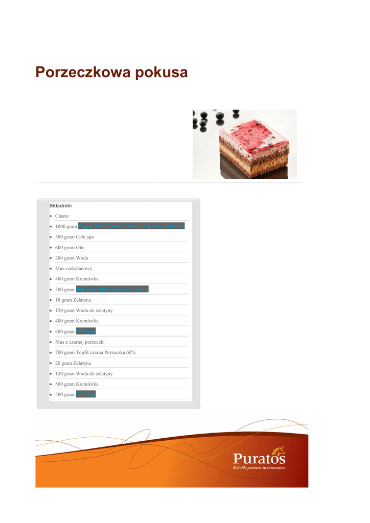 Porzeczkowa pokusa Składniki Ciasto: 1000 gram Tegral Satin Cream Cake z belgijską czekoladą 500 gram Całe jaja 600 gram Olej 200 gram Woda Mus czekoladowy 400 gram Kremówka 300 gram Belcolade Noir Selection C501/J 18 gram Żelatyna 120 gram Woda do żelatyny 400 gram Kremówka 400 gram Whippak Mus z czarnej porzeczki 700 gram Topfil czarna Porzeczka 60% 20 gram Żelatyna 120 gram Woda do żelatyny 500 gram Kremówka 500 gram Whippak Metody: Ciasto: Wymieszać wszystkie składniki płaskim mieszadłem przez 4 min. na średnich obrotach, a następnie rozsmarować na 2 blachy o wymiarze 60 x 40 cm i piec w temperaturze 230°C około 12 min. Mus czekoladowy: Pierwszą część kremówki zagotować. Następnie dodać czekoladę Belcolade Noir Selection i wymieszać do uzyskania jednolitej konsystencji. Schłodzić. Dodać namoczoną w wodzie i rozpuszczoną żelatynę. Na końcu połączyć z ubitą śmietana Whipak i kremówką. Mus rozsmarować na pierwszym spodzie czekoladowym. Mus z czarnej porzeczki: Do nadzienia Topfil Czarna Porzeczka 60% dodać namoczoną w wodzie i rozpuszczona żelatynę. Wystudzić masę i i połączyć z ubitą śmietaną Whipak i kremówką. Masę rozsmarować na blacie czekoladowym s schłodzić. Wykończenie: Dekorować glazurą Magnifier neutra z nadzieniem Topfil Czarna Porzeczka 60%.