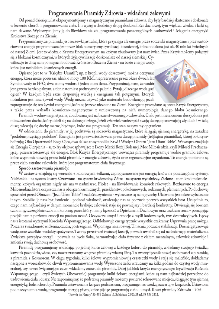 Programowanie Piramidy Zdrowia - wkładami żelowymi Od ponad dziesięciu lat eksperymentujemy z magnetycznymi piramidami zdrowia, aby były bardziej skuteczne i doskonałe w leczeniu chorób i programowaniu ciała. Im wyżej wchodzimy drogą doskonałości duchowej, tym większa wiedza i łaski są nam dawane. Wykorzystujemy ją do likwidowania zła, programowania poszczególnych osobowości i ściągania energetyki Królestwa Bożego na Ziemię. Przypominamy, że piramida jest soczewką astralną, która przyciąga złe energie przez soczewki magnetyczne i przewartościowana energia programowana jest przez blok numeryczny cywilizacji kosmicznej, która oddalona jest ok. 40 mln lat świetlnych od naszej Ziemi. Jest to wiedza o Krzyżu Energetycznym, na którym zbudowany jest nasz świat. Przez Krzyż możemy połączyć się z blokami kosmicznymi, w których żyją cywilizacje doskonalsze od naszej ziemskiej. Cywilizacje te chcą nam pomagać i budować Królestwo Boże na Ziemi - na bazie energii wody, która jest nośnikiem kosmicznych energii. Opisane jest to w "Księdze Urantii"; np. z kropli wody deszczowej można otrzymać energię, która może poruszać silnik o mocy 100 KM, nieprzerwanie przez okres dwóch lat. Symbol wody to H2 O; dwa atomy wodoru i jeden atom tlenu. Przypominają nam, że wodór jest gazem bardzo palnym, a tlen natomiast podtrzymuje palenie. Pytają; dlaczego woda gasi ogień? W każdym bądź razie dysponują wiedzą i energiami tak potężnymi, których nośnikiem jest nasz żywioł wody. Wodę można używać jako materiału budowlanego, jeżeli zaprogramuje się ten żywioł energiami, które są jeszcze nieznane na Ziemi. Energie te przesyłane są przez Krzyż Energetyczny, a także przez wahadła kosmiczno-magnetyczne z umieszczoną na nich numerologią danego bloku kosmicznego. Piramida wodno-magnetyczna, zbudowana jest na bazie stworzonego człowieka. Ciało jest mieszkaniem duszy, dusza jest mieszkaniem ducha, który dzieli się na dobrego i złego. Jeżeli człowiek zanieczyści swoją duszę; opanowuje ją zły duch i w taką duszę wlewają się duchy marne, błądzące, które nas programują. Ten stan nazywamy opętaniem. W odniesieniu do piramidy; w jej podstawie są soczewki magnetyczne, które ściągają ujemną energetykę, na zasadzie "podobne przyciąga podobne". Energia ta jest przewartościowana przez duszę piramidy (trójkątna piramidka), której boki symbolizują; Oko Opatrzności Boga Ojca, dwa dalsze to symbolika Krwi i Wody z Obrazu "Jezu Ufam Tobie". Wewnątrz znajduje się Energia Cierpienia - są to łzy olejowe spływające z Ikony Matki Bożej Bolesnej. Moc Miłosierdzia, czyli Miłości Przebaczającej, przewartościowuje złe energie. Blok Krzyża Energetycznego wewnątrz piramidy programuje wodne granulki żelowe, które wypromieniowują przez boki piramidy - energie zdrowia, życia oraz regeneracyjne organizmu. Te energie pobierane są przez ciało astralne człowieka, które jest programatorem ciała fizycznego. Sposób zastosowania piramidy: W zestawie znajdują się woreczki z kolorowymi żelkami, zaprogramowane już energią leków na poszczególne systemy. Niebieskie - na system kostny. Czerwone - na system krwionośny. Żółte - na system wydalniczy. Zielone - to mikro i makroelementy, których organizm nigdy nie ma w nadmiarze. Fiolet - na likwidowanie komórek rakowych. Bezbarwne to energia Miłosierdzia, która oczyszcza nas z obciążeń karmicznych, przekleństw: pokoleniowych, rodzinnych, plemiennych. Po duchowej spowiedzi przed Obrazem "Jezu Ufam Tobie" i zadośćuczynieniu - wybaczane są nam grzechy. Ułatwione jest także wybaczanie innym. Stabilizuje nasz byt, istnienie - podnosi witalność, otwierając nas na poczucie potrzeb wszystkich istot. Uzupełnia to, czego nam najbardziej w danym momencie brakuje; człowiek staje się pewniejszy i bardziej konkretny. Otwierają się bowiem czakramy, szczególnie czakram koronny, przez który mamy łączność z Opiekunem Duchowym oraz czakram serca - pomagając przejść nam z poziomu emocji na poziom uczuć. Oczyszcza umysł i emocje z myśli kodowanych, tzw. destrukcyjnych. Łączy nas z istotami wyższymi Kościoła Wspomagającego. Odblokowuje energetycznie wszystkie czakramy. Usprawnia pracę mózgu. Poszerza świadomość widzenia, czucia, postrzegania. Wspomaga nasz rozwój. Umacnia poczucie stabilizacji. Doenergetyzowuje wodę, oraz wszelkie produkty spożywcze.Tworzy przestrzeń twórczej kreacji, pozwala uwolnić się od nadmiernego materializmu. Zwiększa przepływ energii - pozwala na bycie Sobą, harmonizując ciało fizyczne z ciałem mentalnym, człowiek zdrowieje i zmienia swoją duchową osobowość. Piramidę programujemy wkładając po jednej kulce żelowej z każdego koloru do piramidy, wkładamy swojego świadka; kawałek paznokcia, włosa, czy nawet zraszamy wnętrze piramidy własną śliną.To tworzy łącznik naszej osobowości z piramidą, a piramida z Kosmosem. W ciągu tygodnia, kulki żelowe wypromieniowują cząsteczki wody i stają się maleńkie, dokładamy następne z woreczków, do chwili wypromieniowania wody. Wysuszone żelki wrzucamy na kilka godzin do czystej wody mineralnej, czy nawet święconej, po czym wkładamy znowu do piramidy. Dalej już blok krzyża energetycznego (cywilizacja Kościoła Wspomagającego - czyli Świętych Obcowanie) programuje kulki żelowe energiami, które są nam najbardziej potrzebne do uzdrowienia ciała i duszy. Nie zapominajmy, że podstawą piramidy możemy pocierać schorowane miejsca, ściągając tym ujemną energetykę, bóle i choroby. Piramida ustawiona na książce podczas snu, programuje nas wiedzą zawartą w książkach. Ustawiona pod naczyniem z wodą, programuje energią płyny, które pijając programują ciało i umysł. Koszt piramidy Zdrowia - 90zł “Powrót do Natury” 80-354 Gdańsk ul. Subisława 23/G/35 tel. 58 556 3332. Wielką popularnością w całej Europie cies