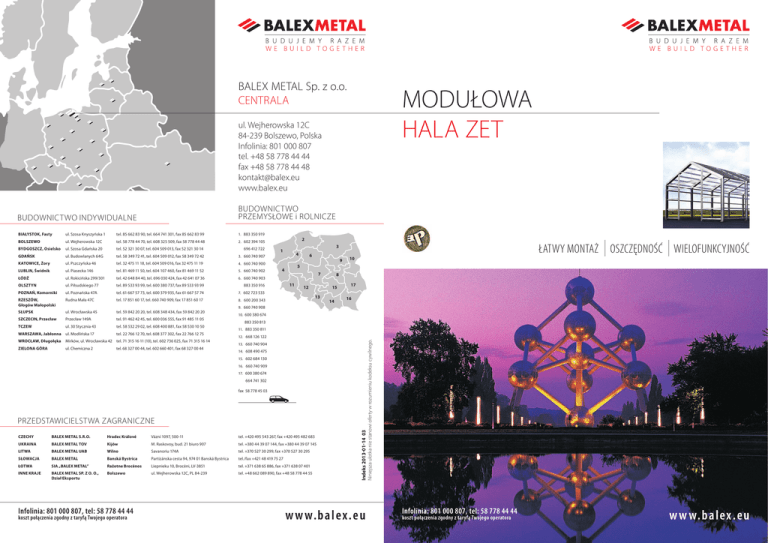BALEX METAL Sp. z o.o. CENTRALA MODUŁOWA HALA ZET ul. Wejherowska 12C 84-239 Bolszewo, Polska Infolinia: 801 000 807 tel. +48 58 778 44 44 fax +48 58 778 44 48 [email protected] www.balex.eu BUDOWNICTWO INDYWIDUALNE BUDOWNICTWO PRZEMYSŁOWE i ROLNICZE BIAŁYSTOK, Fasty ul. Szosa Knyszyńska 1 tel. 85 662 83 90, tel. 664 741 301, fax 85 662 83 99 1. 883 350 919 BOLSZEWO ul. Wejherowska 12C tel. 58 778 44 70, tel. 608 325 509, fax 58 778 44 48 2. 602 394 105 BYDGOSZCZ, Osielsko ul. Szosa Gdańska 20 tel. 52 321 30 07, tel. 604 509 013, fax 52 321 30 14 696 412 722 GDAŃSK ul. Budowlanych 64G tel. 58 349 72 41, tel. 604 509 012, fax 58 349 72 42 3. 660 740 907 KATOWICE, Żory ul. Pszczyńska 46 tel. 32 475 11 18, tel. 604 509 016, fax 32 475 11 19 4. 660 740 900 LUBLIN, Świdnik ul. Piasecka 146 tel. 81 469 11 50, tel. 604 107 460, fax 81 469 11 52 5. 660 740 902 ŁÓDŹ ul. Rokicińska 299/301 tel. 42 648 84 40, tel. 696 030 424, fax 42 641 07 36 6. 660 740 903 OLSZTYN ul. Piłsudskiego 77 tel. 89 533 93 99, tel. 600 380 737, fax 89 533 93 99 883 350 916 POZNAŃ, Komorniki ul. Poznańska 47A tel. 61 667 57 73, tel. 600 379 935, fax 61 667 57 74 7. 602 723 533 RZESZÓW, Głogów Małopolski Rudna Mała 47C tel. 17 851 60 17, tel. 660 740 909, fax 17 851 60 17 8. 600 200 343 SŁUPSK ul. Wrocławska 45 tel. 59 842 20 20, tel. 608 348 434, fax 59 842 20 20 SZCZECIN, Przecław Przecław 149A tel. 91 462 42 45, tel. 600 036 555, fax 91 485 11 05 TCZEW ul. 30 Stycznia 43 tel. 58 532 29 02, tel. 608 400 881, fax 58 530 10 50 WARSZAWA, Jabłonna ul. Modlińska 17 tel. 22 766 12 70, tel. 608 377 302, fax 22 766 12 75 WROCŁAW, Długołęka Mirków, ul. Wrocławska 42 tel. 71 315 16 11 (10), tel. 602 736 025, fax 71 315 16 14 ZIELONA GÓRA ul. Chemiczna 2 tel. 68 327 00 44, tel. 602 660 401, fax 68 327 00 44 2 ŁATWY MONTAŻ OSZCZĘDNOŚĆ WIELOFUNKCYJNOŚĆ 3 1 4 6 9 10 5 4 7 11 12 8 15 13 14 17 16 9. 660 740 908 10. 600 380 674 883 350 813 11. 883 350 811 13. 660 740 904 14. 608 490 475 15. 602 684 130 16. 660 740 909 17. 600 380 674 664 741 302 fax 58 778 45 03 PRZEDSTAWICIELSTWA ZAGRANICZNE CZECHY BALEX METAL S.R.O. Hradec Králové Vázní 1097, 500-11 tel. +420 495 543 267, fax +420 495 482 683 UKRAINA BALEX METAL TOV Kijów M. Raskovoy, bud. 21 biuro 907 tel. +380 44 39 07 144, fax +380 44 39 07 145 LITWA BALEX METAL UAB Wilno Savanoriu 174A tel. +370 527 30 299, fax +370 527 30 295 SŁOWACJA BALEX METAL Banská Bystrica Partizánska cesta 94, 974 01 Banská Bystrica tel./fax +421 48 419 75 27 ŁOTWA SIA „BALEX METAL” Ražotne Brocēnos Liepnieku 10, Brocēni, LV-3851 tel. +371 638 65 886, fax +371 638 07 401 INNE KRAJE BALEX METAL SP. Z O. O., Dział Eksportu Bolszewo ul. Wejherowska 12C, PL 84-239 tel. +48 662 089 890, fax +48 58 778 44 55 Infolinia: 801 000 807, tel: 58 778 44 44 koszt połączenia zgodny z taryfą Twojego operatora Indeks 2013-01-14 03 Niniejsza ulotka nie stanowi oferty w rozumieniu kodeksu cywilnego. 12. 668 126 122 w w w.b a lex.e u Infolinia: 801 000 807, tel: 58 778 44 44 koszt połączenia zgodny z taryfą Twojego operatora w w w. ba l ex . e u MODUŁOWA HALA ZET Hale Zet zostały opracowane przez firmę Balex Metal z myślą o wymagających klientach, którzy oczekują szybkich, trwałych i ekonomicznych rozwiązań budowlanych. Hale Zet montuje się bez trudu w ciągu kilku dni z prefabrykowanych elementów. Dostępne są w szerokościach od 6 do 18 m. Długość jest dowolna i wynika z ilości zestawionych modułów. Konstrukcja wykonana jest z profili stalowych zabezpieczonych powłoką cynkową. Dopełnieniem oferty Hal Zet są ściany i dach z płyt warstwowych (ocieplane) lub z blach trapezowych, a także doświetla dachowe, rynny, bramy, drzwi i inne akcesoria. SZYBKI I ŁATWY MONTAŻ Elementy hali łączone są za pomocą śrub, nie wymaga to specjalnych narzędzi, a do podniesienia ram wystarczy dźwig samochodowy. Strefa śniegowa Szerokość hali 1 2 3 4 6m I, II I, II I, II I 8m I, II I, II I, II I 10 m I, II I, II I, II I 12 m I, II I, II I, II I 15 m I, II I, II I, II I, II 18 m I, II I, II - - H - wysokość ściany bocznej TRWAŁOŚĆ I BEZPIECZEŃSTWO Konstrukcja pozwala na dowolną aranżację i podział wnętrza hali np. wydzielenie pomieszczeń ogrzewanych, a także usytuowanie bram, drzwi i okien na ścianach szczytowych lub bocznych. DOSTĘPNOŚĆ HAL ZET - STREFY OBCIĄŻENIA ŚNIEGIEM I WIATREM WARIANTY WYMIAROWE HAL ZET Rozwiązanie wszechstronnie ekonomiczne: lekka i niedroga konstrukcja, oszczędna w eksploatacji. Krótki czas montażu oznacza niskie koszty robocizny oraz szybkie rozpoczęcie użytkowania budynku. SWOBODA ARANŻACJI szerokość hali [m]: 6; 8; 10; 12; 15; 18 długość modułu [m]: 4,50 długość hali: wielokrotność długości modułu wysokość ściany bocznej [m]: od 3,10 do 4,60 wysokość w kalenicy [m]: od 4,10 do 7,88 spadek dachu: 20º I, II, IIa, IIb, III - strefy obciążenia wiatrem, 1, 2, 3, 4, 5 - strefy obciążenia śniegiem OSZCZĘDNOŚCI INWESTYCYJNE Zastosowanie stali ocynkowanej ogniowo stanowi solidne zabezpieczenie konstrukcji przed działaniem niekorzystnych czynników atmosferycznych. Orientacyjna mapa stref obciążenia śniegiem i wiatrem PARAMETRY TECHNICZNE − − − − − − LICZBY MÓWIĄ… 1 miesiąc to czas produkcji konstrukcji, wtedy też uzyskujesz pozwolenie na budowę 2 dni zajmie montaż konstrukcji najmniejszej Hali Zet bez robót ziemnych B - szerokość hali TYP 8m 10 m 12 m 15 m 18 m 4,60 m 45 6m + + + + + 4,10 m 40 + + + + + 3,60 m 35 + + + + 3,10 m 30 + H1 - przewyższenie kalenicy ponad wysokość ściany bocznej +1,09 m +1,46 m +1,82 m +2,18 m +2,73 m +3,28 m Δh - zmniejszenie wysokości użytkowej 9,80 cm 9,80 cm 9,80 cm 11,80 cm 11,80 cm 11,80 cm 3 osoby wystarczą do wykonania powyższego montażu 5 minut potrwa kalkulacja Hali Zet ŚCIANY I DACH 115 kg to waga najcięższego elementu największej Hali Zet 190 elementów wymaga skręcenia w najmniejszej Hali Zet