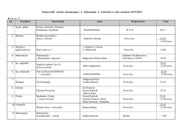 Podręczniki szkolne obowiązujące w Gimnazjum w Lubochni w roku szkolnym 2015/2016 Klasa I Lp. Tytuł książki Przedmiot 1. Język polski 2. Historia 3. Wiedza o społeczeństwie 4. Matematyka 5. Jęz. angielski 6. Jęz. niemiecki 7. Biologia 11. Informatyka Cena Witold Bobiński WSiP Śladami przeszłości + Zeszyt ćwiczeń Stanisław Roszak Nowa Era 23,10 12,30 ćwicz. Dziś i jutro cz. 1 J. Janicka, A. Kucia, T. Maćkowski Nowa Era 15,00 Matematyka 1 ( Matematyka z plusem) Małgorzata Dobrowolska Gdańskie Wydawnictwo Oświatowe ( GWO) 24,70 English Explorer New 2 + Zeszyt ćwiczeń Helen Stephenson Nowa Era 23,10 12,30 ćwicz. Das ist Deutsch KOMPAKT + ćwiczenie Jolanta Kamińska Nowa Era 23,10 12,30 ćwicz. Świat biologii Małgorzata Kłyś Joanna Stawarz Nowa Era 23,10 Nowa Era 23,10 Nowa Era 23,10 12,30 ćwicz. 23,10 12,30 ćwicz. Chemia Nowej Ery 10. Geografia Wydawnictwo Świat w słowach i obrazach Gramatyka i stylistyka 8. Chemia 9. Fizyka Autor Spotkania z fizyką + zeszyt ćwiczeń Jan Kulawik Teresa Kulawik Maria Litwin Teresa Kulawik Grażyna Francuz- Ornat Maria Nowotny - Różańska Planeta Nowa + ćwiczenie Roman Malarz Nowa Era Informatyka Europejczyka – e-book Jolanta Pończyk Helion 24,75 9,90 Podręczniki szkolne obowiązujące w Gimnazjum w Lubochni w roku szkolnym 2015/2016 K l a s a II Lp. 1. 2. 3. 4. 5. 6. 7. 8. 9. 10. 11. 12. 13. 14. Tytuł książki Przedmiot 1Język polski . Świat w słowach i obrazach Gramatyka i stylistyka Autor Witold Bobiński WSiP 2Historia . Śladami przeszłości kl. II + zeszyt ćwiczeń Stanisław Roszak 3Wiedza o . społeczeństwie Dziś i jutro cz. 2 J. Janicka, A. Janicki, A. Kucia, T. Maćkowski 6Matematyka . Matematyka 2 ( Matematyka z plusem ) 7Jęz. angielski . New Exam Connections 3 Podręcznik + ćwiczenie 8Jęz. niemiecki . 9Biologia . Geografia 1Chemia 0 . 1Fizyka 1 . 1Zajęcia techniczne 3 Plastyka 1Religia 4 . 1Wychowanie do 5życia w rodzinie . Wydawnictwo Nowa Era Nowa Era Małgorzata Dobrowolska Gdańskie Wydawnictwo Oświatowe ( GWO ) Das ist Deutsch KOMPAKT T. Garside, J. Spencer - Kępczyńska Oxford Jolanta Kamińska Nowa Era Świat biologii cz. 2 M. Kłyś, J. Stawarz, W. Gołda, J. Wardas Nowa Era Planeta Nowa Dawid Szczypiński, Mirosław Wójtowicz Chemia Nowej Ery cz. 2 Jan Kulawik, Teresa Kulawik, Maria Litwin Nowa Era Nowa Era Spotkania z fizyką cz. 2 Zeszyt ćw. Spotkania z fizyką cz. II Grażyna Francuz- Ornat Teresa Kulawik Technika w praktyce moduł: Zajęcia mechaniczno-motoryzacyjne Waldemar Czyżewski Jolanta Gumula W tym cała sztuka Jestem z wami Wędrując ku dorosłości - podręcznik dla klas I – III Wędrując ku dorosłości – ćwiczenie klasa 2 Ks. Władysław Kubiak ( kierownik zespołu redakcyjnego ) T. Król M. Bojarska, T. Król, J. Nowakowski, E. Purzycka, M. Selke Nowa Era Nowa Era Mac - edukacja WAM Rubikon Podręczniki szkolne obowiązujące w Gimnazjum w Lubochni w roku szkolnym 2015/2016 K l a s a III Lp. Tytuł książki Przedmiot Świat w słowach i obrazach Gramatyka i stylistyka Witold Bobiński 2Historia . Śladami przeszłości kl. III + zeszyt ćwiczeń Stanisław Roszak 3. 6Matematyka . Matematyka 3 ( matematyka z plusem ) Małgorzata Dobrowolska 4. 7Jęz. angielski . Repetytorium Gimnazjalisty Poziom podstawowy i rozszerzony K. Kotorowicz – Jasińska, A. Mędela 8Jęz. niemiecki . Geni@l kompakt 3a i 3b Herman Funk, Ute Koithan Michael Koenig, Theo Scherling 9Biologia . Świat biologii cz. 3 1Chemia 0 . 1Fizyka 1 . 1Geografia 2 . 1Informatyka 3 1Religia 5 Wychowanie do życia w rodzinie Chemia Nowej Ery 1. 2. 5. 6. 7. 8. 9. 10. 11. 12. 13. 14. 15. . Język polski Autor Muzyka Edukacja dla bezpieczeństwa Zajęcia techniczne Wydawnictwo WSiP Nowa Era Gdańskie Wydawnictwo Oświatowe ( GWO ) MACMILLAN EDUCATION Langenscheidt M. Kłyś, A. Kornaś, M. Ryszkiewicz Nowa Era Jan Kulawik, Teresa Kulawik, Maria Litwin Nowa Era Spotkania z fizyką cz. 3 i cz. 4 Zeszyt ćwiczeń cz. 3 i cz. 4 Planeta Nowa Informatyka Europejczyka Chodźmy razem Wędrując ku dorosłości – podręcznik dla klas I – III Wędrując ku dorosłości – ćwiczenie klasa 3 Muzyczny świat Edukacja dla bezpieczeństwa Bezpieczeństwo na codzień Technika w praktyce Zajęcia elektryczno - elektroniczne Grażyna Francuz- Ornat Teresa Kulawik Mariusz Szubert Jolanta Pończyk Ks. Władysław Kubiak ( kierownik zespołu redakcyjnego ) T. Król M. Bojarska, T. Król, J. Nowakowski, E. Purzycka, M. Selke, M. Stocka Teresa Wójcik Mariusz Goniewicz, Anna W. Nowak – Kowal Zbigniew Smutek Waldemar Czyżewski Nowa Era Nowa Era Helion WAM Rubikon MAC Edukacja OPERON Nowa Era