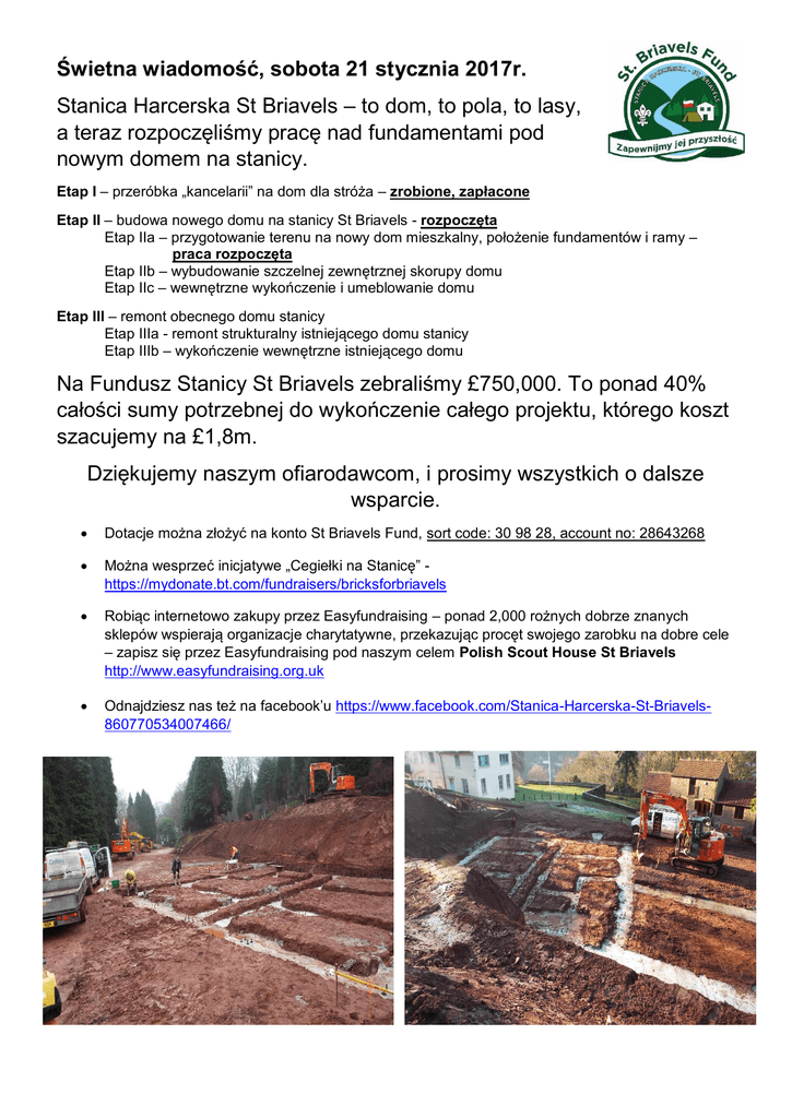 Świetna wiadomość, sobota 21 stycznia 2017r. Stanica Harcerska St Briavels – to dom, to pola, to lasy, a teraz rozpoczęliśmy pracę nad fundamentami pod nowym domem na stanicy. Etap I – przeróbka „kancelarii” na dom dla stróża – zrobione, zapłacone Etap II – budowa nowego domu na stanicy St Briavels - rozpoczęta Etap IIa – przygotowanie terenu na nowy dom mieszkalny, położenie fundamentów i ramy – praca rozpoczęta Etap IIb – wybudowanie szczelnej zewnętrznej skorupy domu Etap IIc – wewnętrzne wykończenie i umeblowanie domu Etap III – remont obecnego domu stanicy Etap IIIa - remont strukturalny istniejącego domu stanicy Etap IIIb – wykończenie wewnętrzne istniejącego domu Na Fundusz Stanicy St Briavels zebraliśmy £750,000. To ponad 40% całości sumy potrzebnej do wykończenie całego projektu, którego koszt szacujemy na £1,8m. Dziękujemy naszym ofiarodawcom, i prosimy wszystkich o dalsze wsparcie. Dotacje można złożyć na konto St Briavels Fund, sort code: 30 98 28, account no: 28643268 Można wesprzeć inicjatywe „Cegiełki na Stanicę” https://mydonate.bt.com/fundraisers/bricksforbriavels Robiąc internetowo zakupy przez Easyfundraising – ponad 2,000 rożnych dobrze znanych sklepów wspierają organizacje charytatywne, przekazując procęt swojego zarobku na dobre cele – zapisz się przez Easyfundraising pod naszym celem Polish Scout House St Briavels http://www.easyfundraising.org.uk Odnajdziesz nas też na facebook’u https://www.facebook.com/Stanica-Harcerska-St-Briavels860770534007466/
