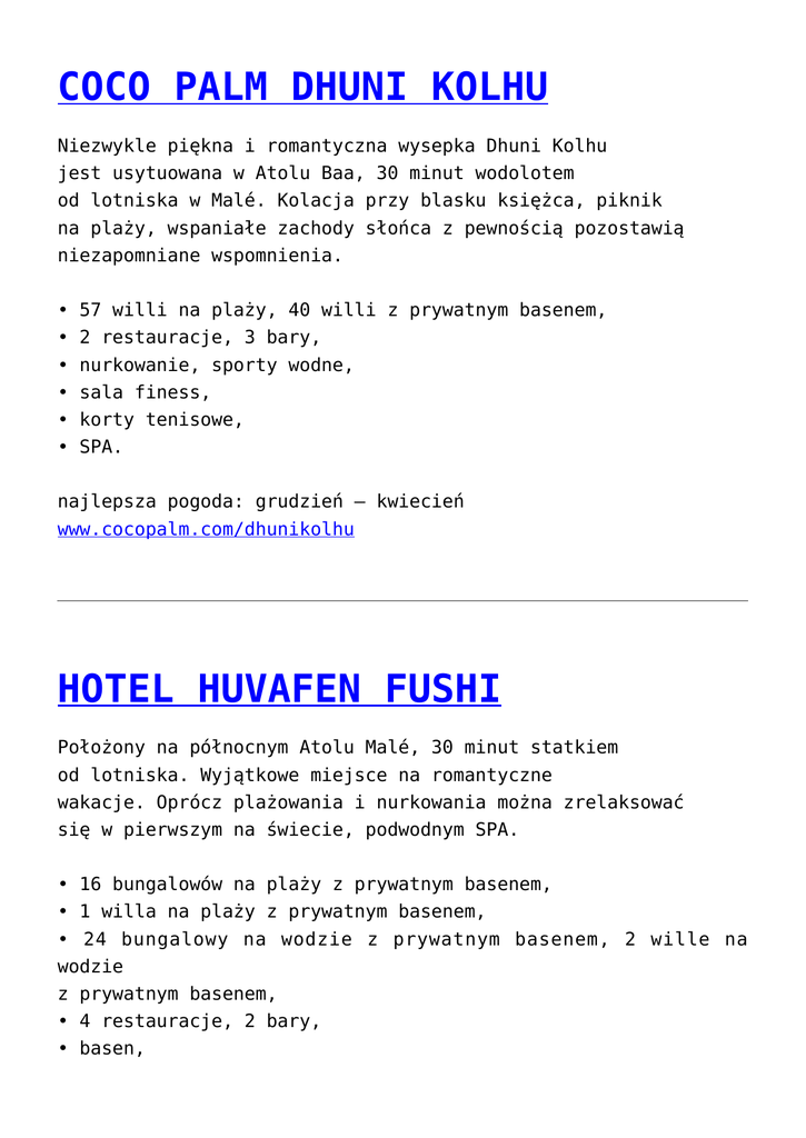 COCO PALM DHUNI KOLHU Niezwykle piękna i romantyczna wysepka Dhuni Kolhu jest usytuowana w Atolu Baa, 30 minut wodolotem od lotniska w Malé. Kolacja przy blasku księżca, piknik na plaży, wspaniałe zachody słońca z pewnością pozostawią niezapomniane wspomnienia. • 57 willi na plaży, 40 willi z prywatnym basenem, • 2 restauracje, 3 bary, • nurkowanie, sporty wodne, • sala finess, • korty tenisowe, • SPA. najlepsza pogoda: grudzień – kwiecień www.cocopalm.com/dhunikolhu HOTEL HUVAFEN FUSHI Położony na północnym Atolu Malé, 30 minut statkiem od lotniska. Wyjątkowe miejsce na romantyczne wakacje. Oprócz plażowania i nurkowania można zrelaksować się w pierwszym na świecie, podwodnym SPA. • 16 bungalowów na plaży z prywatnym basenem, • 1 willa na plaży z prywatnym basenem, • 24 bungalowy na wodzie z prywatnym basenem, 2 wille na wodzie z prywatnym basenem, • 4 restauracje, 2 bary, • basen, • • • • • joga, sala fitness, nurkowanie, sporty wodne, wycieczki na pobliskie wyspy, łowienie ryb, unikalne, podwodne SPA. najlepsza pogoda: grudzień – kwiecień www.huvafenfushi.com HOTEL BANYAN TREE VABBINFARU Leży na północnym Atolu Ari na wyspie Vabbinfaru, 20 minut statkiem od lotniska. Słynie ze znakomitej obsługi, pięknej plaży i turkusowej wody. • • • • • 48 eleganckich willi z jacuzzi, dużym tarasem, 2 restauracje, bar, nurkowanie, łowienie ryb, wycieczki na pobliskie wyspy, SPA. najlepsza pogoda: grudzień – kwiecień www.banyantree.com NALADHU MALDIVES Położony na Południowym Atolu na wyspie Veligandu Huraa, 30 minut wodolotem z Malé. Turkusowe laguny, piękne plaże, luksusowe wille, niezwykła dbałość o klienta gwarantują znakomity wypoczynek. • 19 willi z prywatnym basenem i ogrodem, • restauracja, bar, szkoła gotowania, • basen, sala fitness, joga, • nurkowanie, sporty wodne, pikniki na bezludnych wyspach, łowienie ryb, • SPA. najlepsza pogoda: grudzień – kwiecień www.naladhu.com ISLAND HIDEAWAY SPA RESORT & MARINA Prywatna wysepka Dhonakulhi jest położona w Północnym Atolu, 45 minut lotu z międzynarodowego lotniska w Malé. Przejrzyste, turkusowe wody oceanu kontrastują z bielą piasku i zielenią palm. Wokół urok natury, luksusu i prywatności. • 43 luksusowe, przestronne wille z jacuzzi lub basenem i prywatnà plażą, • restauracja, bar, • basen, sporty wodne, szkoła nurkowania, korty tenisowe, • przystań jachtowa, wyprawy łodzią na pobliskie wyspy, łowienie ryb, • SPA. najlepsza pogoda: grudzień – kwiecień www.island-hideaway.com ST. REGIS BALI RESORT Położony przy wspaniałej plaży Nusa Dua, w tropikalnym ogrodzie. Kąpiele w turkusowych, spokojnych wodach Oceanu Indyjskiego, leniwe spacery po białej plaży, ale również nurkowanie, kajaki, windsurfing lub wycieczki w interior, to naturale atrakcje tej niezwykle ciekawej wyspy. • 72 apartamenty z livingiem, 14 z prywatnym basenem, 20 przestronnych willi z prywatnym basenem, z 1 lub 2 sypialniami, • 2 restauracje, 2 bary, • basen, sporty wodne, • sala fitness, • pole golfowe 18 dołków/72 par, • SPA. najlepsza pogoda: kwiecień – październik www.stregis.com/bali BULGARI BALI RESORT & SPA Malowniczo położony na 150 m klifie, na południowo-zachodnim wybrzeżu, w pobliżu miasteczka Pekatu. Na prywatną, romantyczną, plażę zjeżdża się windą. Hotel wyróżnia się znakomitą architekturą, łącząc wyrafinowany styl włoski z tradycyjnym stylem balijskim. • 59 przestronnych willi z basenem, z 2 lub 3 sypialniami, livingiem i tarasem, • 2 restauracje, bar, • basen, joga, • wycieczki po wyspie, • SPA. najlepsza pogoda: kwiecień – październik www.bulgarihotels.com JIMBARAN PURI BALI Bezpretensjonalny, luksusowy hotel położony przy cudownej plaży Jimbaran, w dużym, tropikalnym ogrodzie. Spokojne i romantyczne miejsce. • • • • 32 bungalowy w ogrodzie, 8 bungalowów na plaży, 2 restauracje, bar, basen, sporty wodne, Hatta Joga, Tai Chi, SPA. najlepsza pogoda: kwiecień – październik www.jimbaranpuribali.com KARMA JIMBARAN RESORT Położony w pięknej Zatoce Jimbaran, w tropikalnym ogrodzie przy białej, piaszczystej plaży. Przestronne i luksusowe wille łączą nowoczesne wyposażenie z elementami tradycyjnego, balijskiego wystroju. • • • • • 38 willi z basenem z 1-4 sypialniami, restauracja, bar, basen, sporty wodne, wycieczki statkiem, joga, przejażdżki konne, wycieczki w góry, znakomite SPA. najlepsza pogoda: kwiecień – październik www.karmajimbaran.com TIKEHAU PEARL BEACH RESORT Uważany za jeden z najpiękniejszych atoli w Polinezji, w kształcie korony, atol Tikehau utworzony jest z wysepek, „zawieszonych” pomiędzy błękitem nieba i turkusem wody. Hotel znajduje się na wysepce Motu Tiano, wsród palm kokosowych i białych plaż. Szklana podłoga w bungalowach na wodzie umożliwia obserwację świata podwodnego. • • • • • • 13 bungalowów na plaży, 24 na wodzie, restauracja, bar, basen, nurkowanie, wycieczki łodzią, piknik na plaży, wycieczki rowerem do pobliskich wiosek, SPA. najlepsza pogoda: cały rok www.pearlresorts.com/tikehaupearlbeachresort/