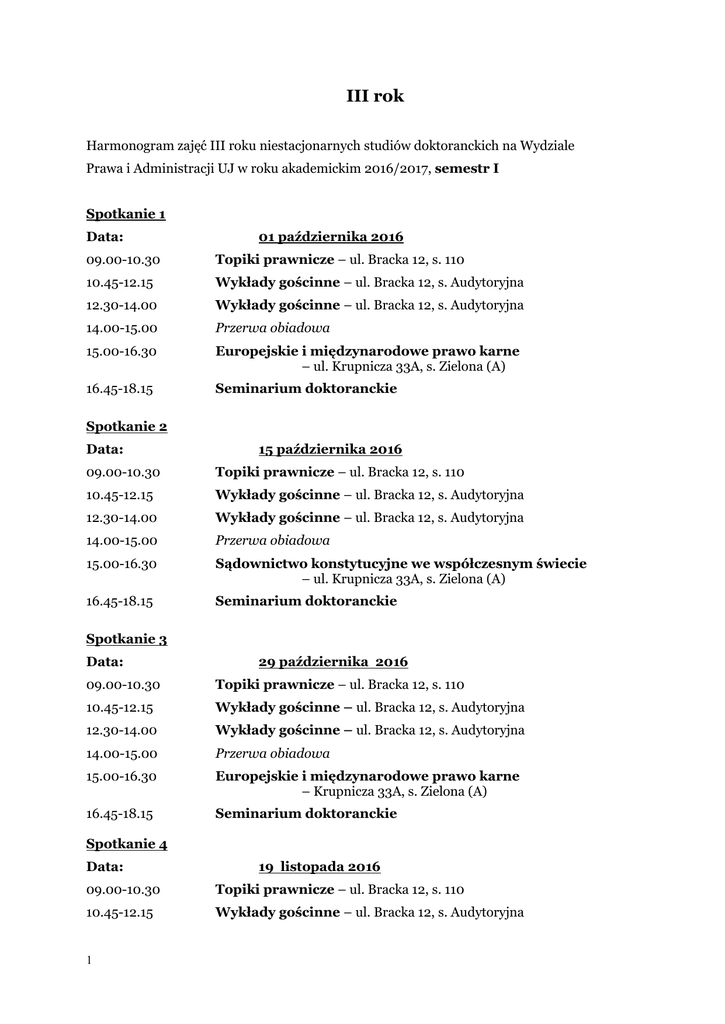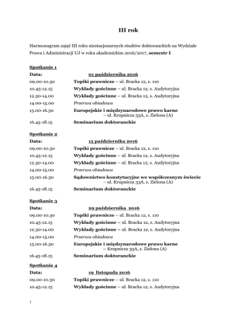 III rok Harmonogram zajęć III roku niestacjonarnych studiów doktoranckich na Wydziale Prawa i Administracji UJ w roku akademickim 2016/2017, semestr I Spotkanie 1 Data: 01 października 2016 09.00-10.30 Topiki prawnicze – ul. Bracka 12, s. 110 10.45-12.15 Wykłady gościnne – ul. Bracka 12, s. Audytoryjna 12.30-14.00 Wykłady gościnne – ul. Bracka 12, s. Audytoryjna 14.00-15.00 Przerwa obiadowa 15.00-16.30 Europejskie i międzynarodowe prawo karne – ul. Krupnicza 33A, s. Zielona (A) 16.45-18.15 Seminarium doktoranckie Spotkanie 2 Data: 15 października 2016 09.00-10.30 Topiki prawnicze – ul. Bracka 12, s. 110 10.45-12.15 Wykłady gościnne – ul. Bracka 12, s. Audytoryjna 12.30-14.00 Wykłady gościnne – ul. Bracka 12, s. Audytoryjna 14.00-15.00 Przerwa obiadowa 15.00-16.30 Sądownictwo konstytucyjne we współczesnym świecie – ul. Krupnicza 33A, s. Zielona (A) 16.45-18.15 Seminarium doktoranckie Spotkanie 3 Data: 29 października 2016 09.00-10.30 Topiki prawnicze – ul. Bracka 12, s. 110 10.45-12.15 Wykłady gościnne – ul. Bracka 12, s. Audytoryjna 12.30-14.00 Wykłady gościnne – ul. Bracka 12, s. Audytoryjna 14.00-15.00 Przerwa obiadowa 15.00-16.30 Europejskie i międzynarodowe prawo karne – Krupnicza 33A, s. Zielona (A) 16.45-18.15 Seminarium doktoranckie Spotkanie 4 Data: 19 listopada 2016 09.00-10.30 Topiki prawnicze – ul. Bracka 12, s. 110 10.45-12.15 Wykłady gościnne – ul. Bracka 12, s. Audytoryjna 1 12.30-14.00 Wykłady gościnne – ul. Bracka 12, s. Audytoryjna 14.00-15.00 Przerwa obiadowa 15.00-16.30 Sądownictwo konstytucyjne we współczesnym świecie - ul. Krupnicza 33A, s. Zielona (A) 16.45-18.15 Seminarium doktoranckie Spotkanie 5 Data: 03 grudnia 2016 09.00-10.30 Topiki prawnicze – ul. Bracka 12, s. 110 10.45-12.15 Podatki współczesnego państwa – ul. Bracka 12, s. Audytoryjna 12.30-14.00 Podatki współczesnego państwa – ul. Bracka 12, s. Audytoryjna 14.00-15.00 Przerwa obiadowa 15.00- 16.30 Europejskie i międzynarodowe prawo karne – ul. Krupnicza 33A, s. Zielona (A) 16.45-18.15 Seminarium doktoranckie Spotkanie 6 Data: 17 grudnia 2016 09.00-10.30 Topiki prawnicze – ul. Bracka 12, s. 110 10.45-12.15 Podatki współczesnego państwa – ul. Bracka 12, s. Audytoryjna 12.30-14.00 Podatki współczesnego państwa – ul. Bracka 12, s. Audytoryjna 14.00-15.00 Przerwa obiadowa 15.00-16.30 Sądownictwo konstytucyjne we współczesnym świecie - ul. Krupnicza 33A, s. Zielona (A) 16.45-18.15 Seminarium doktoranckie Spotkanie 7 Data: 21 stycznia 2017 09.00-10.30 Topiki prawnicze – ul. Bracka 12, s. 110 10.45-12.15 Podatki współczesnego państwa – ul. Bracka 12, s. Audytoryjna 12.30-14.00 Podatki współczesnego państwa – ul. Bracka 12, s. Audytoryjna 14.00-15.00 Przerwa obiadowa 15.00-16.30 Europejskie i międzynarodowe prawo karne – ul. Krupnicza 33A, s. Zielona (A) 16.45-18.15 Seminarium doktoranckie 2