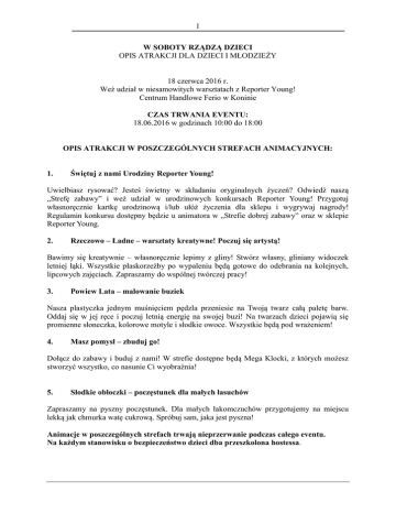 1 W SOBOTY RZĄDZĄ DZIECI OPIS ATRAKCJI DLA DZIECI I MŁODZIEŻY 18 czerwca 2016 r. Weź udział w niesamowitych warsztatach z Reporter Young! Centrum Handlowe Ferio w Koninie CZAS TRWANIA EVENTU: 18.06.2016 w godzinach 10:00 do 18:00 OPIS ATRAKCJI W POSZCZEGÓLNYCH STREFACH ANIMACYJNYCH: 1. Świętuj z nami Urodziny Reporter Young! Uwielbiasz rysować? Jesteś świetny w składaniu oryginalnych życzeń? Odwiedź naszą „Strefę zabawy” i weź udział w urodzinowych konkursach Reporter Young! Przygotuj własnoręcznie kartkę urodzinową i/lub ułóż życzenia dla sklepu i wygrywaj nagrody! Regulamin konkursu dostępny będzie u animatora w „Strefie dobrej zabawy” oraz w sklepie Reporter Young. 2. Rzeczowo – Ładne – warsztaty kreatywne! Poczuj się artystą! Bawimy się kreatywnie – własnoręcznie lepimy z gliny! Stwórz własny, gliniany widoczek letniej łąki. Wszystkie płaskorzeźby po wypaleniu będą gotowe do odebrania na kolejnych, lipcowych zajęciach. Zapraszamy do wspólnej twórczej pracy! 3. Powiew Lata – malowanie buziek Nasza plastyczka jednym muśnięciem pędzla przeniesie na Twoją twarz całą paletę barw. Oddaj się w jej ręce i poczuj letnią energię na swojej buzi! Na twarzach dzieci pojawią się promienne słoneczka, kolorowe motyle i słodkie owoce. Wszystkie będą pod wrażeniem! 4. Masz pomysł – zbuduj go! Dołącz do zabawy i buduj z nami! W strefie dostępne będą Mega Klocki, z których możesz stworzyć wszystko, co nasunie Ci wyobraźnia! 5. Słodkie obłoczki – poczęstunek dla małych łasuchów Zapraszamy na pyszny poczęstunek. Dla małych łakomczuchów przygotujemy na miejscu lekką jak chmurka watę cukrową. Spróbuj sam, jaka jest pyszna! Animacje w poszczególnych strefach trwają nieprzerwanie podczas całego eventu. Na każdym stanowisku o bezpieczeństwo dzieci dba przeszkolona hostessa.