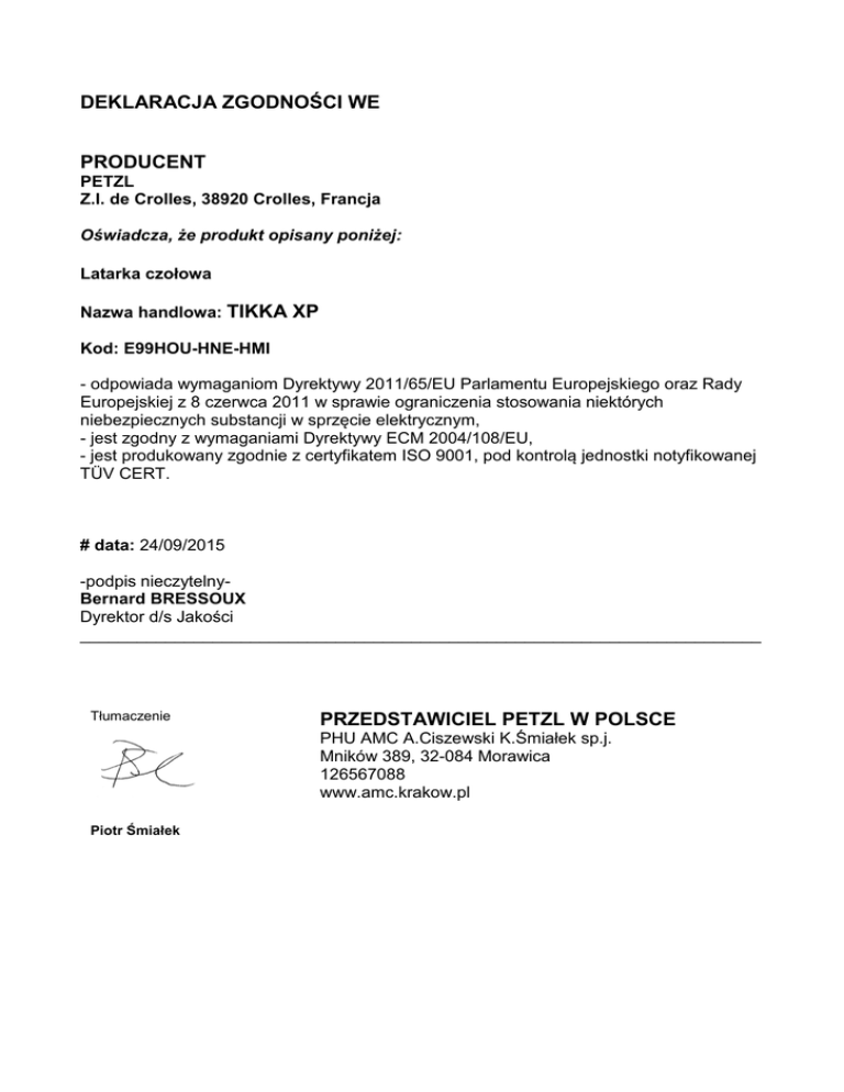 DEKLARACJA ZGODNOŚCI WE PRODUCENT PETZL Z.I. de Crolles, 38920 Crolles, Francja Oświadcza, że produkt opisany poniżej: Latarka czołowa Nazwa handlowa: TIKKA XP Kod: E99HOU-HNE-HMI - odpowiada wymaganiom Dyrektywy 2011/65/EU Parlamentu Europejskiego oraz Rady Europejskiej z 8 czerwca 2011 w sprawie ograniczenia stosowania niektórych niebezpiecznych substancji w sprzęcie elektrycznym, - jest zgodny z wymaganiami Dyrektywy ECM 2004/108/EU, - jest produkowany zgodnie z certyfikatem ISO 9001, pod kontrolą jednostki notyfikowanej TÜV CERT. # data: 24/09/2015 -podpis nieczytelnyBernard BRESSOUX Dyrektor d/s Jakości ________________________________________________________________________ Tłumaczenie PRZEDSTAWICIEL PETZL W POLSCE PHU AMC A.Ciszewski K.Śmiałek sp.j. Mników 389, 32-084 Morawica 126567088 www.amc.krakow.pl Piotr Śmiałek