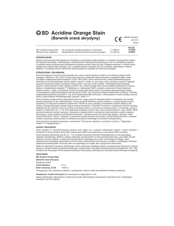 Acridine Orange Stain (Barwnik oranż akrydyny) BD Acridine Orange Stain (Barwnik oran akrydyny) Do wykrywania drobnoustrojów w rozmazach bezporednich metod barwienia fluorescencyjnego. 8820211JAA(01) 2013-10 Polski 1 x 250 mL 4 x 250 mL Nr kat. 212536 212537 PRZEZNACZENIE Barwnik oranż akrydyny jest zalecany do stosowania w wykrywaniu drobnoustrojów w rozmazach bezpośrednich próbek pochodzenia klinicznego i nieklinicznego z zastosowaniem mikroskopii fluorescencyjnej. Jest on szczególnie przydatny w szybkich testach przesiewowych fizjologicznie sterylnych próbek, takich jak płyn mózgowo-rdzeniowy, w których może występować niewiele drobnoustrojów, oraz w szybkim badaniu rozmazów krwi lub rozmazów zawierających materiał białkowy, w przypadku których odróżnienie drobnoustrojów od materiału tła może być trudniejsze. STRESZCZENIE I OBJAŚNIENIE Fluorochromatyczne barwienie drobnoustrojów przy użyciu oranżu akrydyny zostało po raz pierwszy opisane przez Struggera i Hilbricha w roku 1942. Od tego czasu jest ono powszechnie wykorzystywane w badaniach gleby i wody pod kątem występowania drobnoustrojów. W roku 1975 Jones i Simon dokonali oceny metod epifluorescencyjnych stosowanych do bezpośredniego liczenia bakterii wodnych i ustalili, że przy użyciu oranżu akrydyny uzyskano najlepszy szacunek liczebności bakterii w próbkach wody z jeziora, rzeki oraz wody morskiej.1 Metodologia bezpośredniego liczenia z wykorzystaniem oranżu akrydyny (AODC, ang. acridine orange direct count) znalazła zastosowanie w liczeniu bakterii w składowiskach odpadów.2,3 Heidelberg i in. zastosowali AODC w badaniu sezonowych zmian liczebności bakterii morskich i ustalili, że barwienie oranżem akrydyny dało lepsze wyniki niż procedury bezpośredniego liczenia z wykorzystaniem oligonukleotydów fluorescencyjnych (FODC, ang. fluorescent oligonucleotide direct counting).4 Technika bezpośredniej epifluorescencji (DEFT, ang. direct epifluoresent filter technique) z wykorzystaniem oranżu akrydyny stanowi jedną z metod badania mikrobiologicznego żywności i wody.5,6,7,8 Oranż akrydyny znalazł również zastosowanie kliniczne, a jego użycie do barwienia bakterii w hodowlach krwi zyskało szeroką akceptację. W roku 1980 McCarthy i Senne porównali barwienie oranżem akrydyny z metodą ślepych hodowli pochodnych w wykrywaniu dodatnich hodowli krwi.9 Wyniki ich pracy wykazały, że barwienie oranżem akrydyny jest szybką, niedrogą alternatywą metody ślepych hodowli pochodnych. Stwierdzili oni również, że barwienie oranżem akrydyny wydawało się być bardziej czułe niż barwienie metodą Grama w wykrywaniu drobnoustrojów i umożliwiało wykrycie bakterii w stężeniach ok. 1 x 104 CFU (jednostek tworzących kolonie, ang. colony-forming units)/mL. Lauer, Reller i Mirret porównali barwienie oranżem akrydyny z barwieniem metodą Grama w wykrywaniu drobnoustrojów w płynie mózgowordzeniowym i innych próbkach pochodzenia klinicznego.10 Uzyskane przez nich wyniki były zgodne z wynikami, które otrzymali McCarthy i Senne, i wykazały, że barwienie oranżem akrydyny jest prostą i szybką metodą barwienia o większej czułości wykrywania drobnoustrojów w próbkach pochodzenia klinicznego niż barwienie metodą Grama. Oranż akrydyny był również stosowany w wykrywaniu Trichomonas vaginalis w wymazach z pochwy,11 diagnostyce malarii12,13 i mykoplazmozy.14 ZASADY PROCEDURY Oranż akrydyny to fluorochromatyczny barwnik, który wiąże się z kwasami nukleinowymi bakterii i innych komórek.15 W świetle UV oranż akrydyny barwi RNA i jednoniciowy DNA na pomarańczowo, a dwuniciowy DNA na zielono. Oranż akrydyny buforowany przy pH 3,5 – 4,0 umożliwia barwienie różnicowe mikroorganizmów na tle pozostałego materiału komórkowego. Bakterie i grzyby wybarwiają się jednorodnie na kolor jasnopomarańczowy, zaś ludzkie komórki nabłonka i komórki zapalne, a także zanieczyszczenia tła wybarwiają się na kolor od zielonego do żółtego. Jądra aktywowanych leukocytów wybarwiają się na kolor żółty, pomarańczowy lub czerwony w związku z wynikającą z aktywacji zwiększoną produkcją RNA. Erytrocyty albo nie wybarwiają się w ogóle, albo zyskują kolor jasnozielony. Dzięki tej właściwości barwienia różnicowego można dokonywać szybkiego badania przesiewowego barwionych oranżem akrydyny rozmazów próbek pochodzenia klinicznego z zastosowaniem mikroskopii fluorescencyjnej przy powiększeniu 100 – 400x. W badaniu tym fluoryzujące na kolor jasnopomarańczowy drobnoustroje odróżniają się od czarnego lub jasnozielonego do żółtego tła. ODCZYNNIKI BD Acridine Orange Stain (Barwnik oranż akrydyny) Przybliżony skład* Oranż akrydyny 0,1 g Bufor octanowy, 0,5 M 1000 mL *Skorygowany i/lub uzupełniony zgodnie z wymaganiami, których celem jest spełnienie kryteriów wydajności. Ostrzeżenia i środki ostrożności: Do stosowania w diagnostyce in vitro. Należy przestrzegać odpowiednich, ustalonych procedur laboratoryjnych dotyczących obchodzenia się z materiałami zakaźnymi oraz ich utylizacji. Acridine Orange Stain (Barwnik oranż akrydyny): OSTRZEŻENIE H315 Działa drażniąco na skórę. H320 Działa drażniąco na oczy. H335 Może powodować podrażnienie dróg oddechowych. P261 Unikać wdychania pyłu/dymu/gazu/mgły/par/rozpylonej cieczy. P280 Stosować rękawice ochronne/odzież ochronną/ ochronę oczu/ochronę twarzy. P305/351/338 W PRZYPADKU DOSTANIA SIĘ DO OCZU: Ostrożnie płukać wodą przez kilka minut. Wyjąć soczewki kontaktowe, jeżeli są i można je łatwo usunąć. Nadal płukać. P405 Przechowywać pod zamknięciem. P501 Zawartość/pojemnik usuwać zgodnie z lokalnymi/regionalnymi/krajowymi/międzynarodowymi przepisami. Przechowywanie: Przechowywać w temperaturze 15 – 30°C. Data ważności dotyczy produktu w nienaruszonym pojemniku, przechowywanego zgodnie z instrukcją. Pogorszenie jakości produktu: Ni