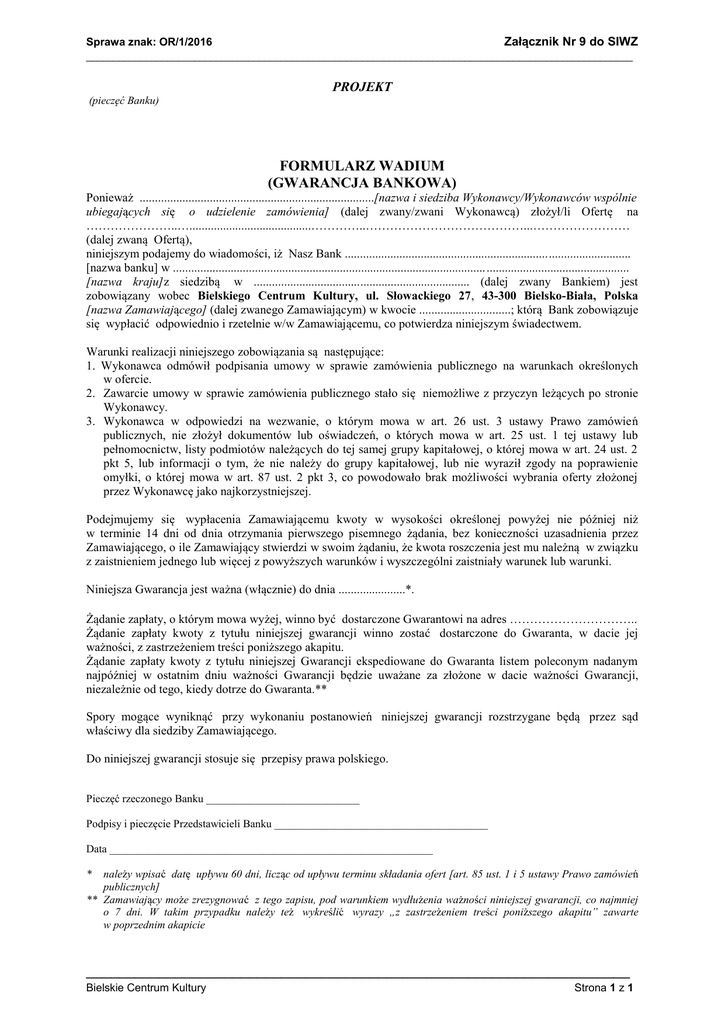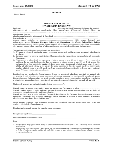 Załącznik Nr 9 do SIWZ Sprawa znak: OR/1/2016 _____________________________________________________________________________________________________ PROJEKT (pieczęć Banku) FORMULARZ WADIUM (GWARANCJA BANKOWA) Ponieważ .............................................................................[nazwa i siedziba Wykonawcy/Wykonawców wspólnie ubiegających się o udzielenie zamówienia] (dalej zwany/zwani Wykonawcą) złożył/li Ofertę na …………………..…........................................…………..…………………………………...…………………… (dalej zwaną Ofertą), niniejszym podajemy do wiadomości, iż Nasz Bank .............................................................................................. [nazwa banku] w ....................................................................................................... ............................................... [nazwa kraju]z siedzibą w ....................................................................... (dalej zwany Bankiem) jest zobowiązany wobec Bielskiego Centrum Kultury, ul. Słowackiego 27, 43-300 Bielsko-Biała, Polska [nazwa Zamawiającego] (dalej zwanego Zamawiającym) w kwocie ..............................; którą Bank zobowiązuje się wypłacić odpowiednio i rzetelnie w/w Zamawiającemu, co potwierdza niniejszym świadectwem. Warunki realizacji niniejszego zobowiązania są następujące: 1. Wykonawca odmówił podpisania umowy w sprawie zamówienia publicznego na warunkach określonych w ofercie. 2. Zawarcie umowy w sprawie zamówienia publicznego stało się niemożliwe z przyczyn leżących po stronie Wykonawcy. 3. Wykonawca w odpowiedzi na wezwanie, o którym mowa w art. 26 ust. 3 ustawy Prawo zamówień publicznych, nie złożył dokumentów lub oświadczeń, o których mowa w art. 25 ust. 1 tej ustawy lub pełnomocnictw, listy podmiotów należących do tej samej grupy kapitałowej, o której mowa w art. 24 ust. 2 pkt 5, lub informacji o tym, że nie należy do grupy kapitałowej, lub nie wyraził zgody na poprawienie omyłki, o której mowa w art. 87 ust. 2 pkt 3, co powodowało brak możliwości wybrania oferty złożonej przez Wykonawcę jako najkorzystniejszej. Podejmujemy się wypłacenia Zamawiającemu kwoty w wysokości określonej powyżej nie później niż w terminie 14 dni od dnia otrzymania pierwszego pisemnego żądania, bez konieczności uzasadnienia przez Zamawiającego, o ile Zamawiający stwierdzi w swoim żądaniu, że kwota roszczenia jest mu należną w związku z zaistnieniem jednego lub więcej z powyższych warunków i wyszczególni zaistniały warunek lub warunki. Niniejsza Gwarancja jest ważna (włącznie) do dnia ......................*. Żądanie zapłaty, o którym mowa wyżej, winno być dostarczone Gwarantowi na adres ………………………….. Żądanie zapłaty kwoty z tytułu niniejszej gwarancji winno zostać dostarczone do Gwaranta, w dacie jej ważności, z zastrzeżeniem treści poniższego akapitu. Żądanie zapłaty kwoty z tytułu niniejszej Gwarancji ekspediowane do Gwaranta listem poleconym nadanym najpóźniej w ostatnim dniu ważności Gwarancji będzie uważane za złożone w dacie ważności Gwarancji, niezależnie od tego, kiedy dotrze do Gwaranta.** Spory mogące wyniknąć przy wykonaniu postanowień niniejszej gwarancji rozstrzygane będą przez sąd właściwy dla siedziby Zamawiającego. Do niniejszej gwarancji stosuje się przepisy prawa polskiego. Pieczęć rzeczonego Banku ____________________________ Podpisy i pieczęcie Przedstawicieli Banku _______________________________________ Data ___________________________________________________________ należy wpisać datę upływu 60 dni, licząc od upływu terminu składania ofert [art. 85 ust. 1 i 5 ustawy Prawo zamówień publicznych] ** Zamawiający może zrezygnować z tego zapisu, pod warunkiem wydłużenia ważności niniejszej gwarancji, co najmniej o 7 dni. W takim przypadku należy też wykreślić wyrazy „z zastrzeżeniem treści poniższego akapitu” zawarte w poprzednim akapicie * ___________________________________________________________________ Bielskie Centrum Kultury Strona 1 z 1