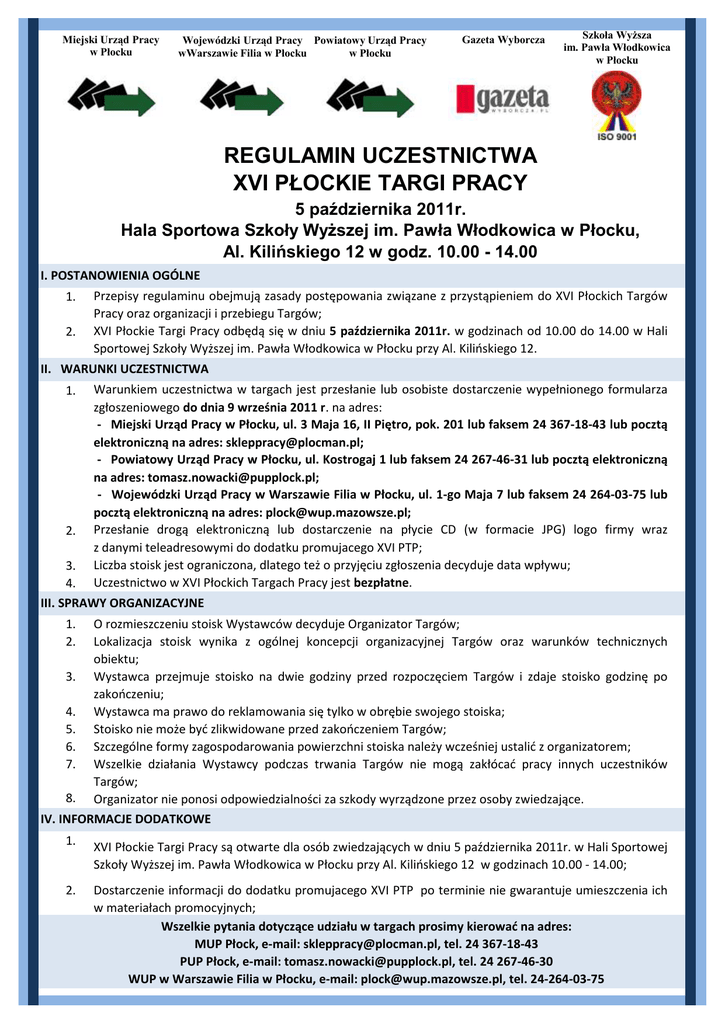 REGULAMIN UCZESTNICTWA XVI PŁOCKIE TARGI PRACY