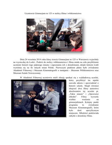 Uczniowie Gimnazjum nr 125 w stolicy filmu i włókiennictwa Dnia 24 września 2014 roku klasy trzecie Gimnazjum nr 125 w Warszawie wyjechały na wycieczkę do Łodzi.. Podróż do stolicy włókiennictwa i filmu miała na celu przybliżenie uczniom historii tego pięknego miasta i zapoznania ich z dziedzinami, dzięki którym Łódź wyróżnia się na tle innych miast Polski. Pierwszym punktem planu było zwiedzanie Akademii Filmowej i Muzeum Kinematografii a następnie - Muzeum Włókiennictwa oraz Muzeum Sztuki Nowoczesnej. W Akademii Filmowej uczniowie mieli okazję spotkać się z wykładowcą uczelni, który przybliżył im tajniki zawodu aktora i opowiedział o historii szkoły. Mogli również obejrzeć dwa filmy autorstwa absolwentów tej uczelni pt. „Takie miasto” i „Opowieści chłodni”. Filmy wywarły wielkie wrażenie na gimnazjalistach. Kolejny punkt programu to zwiedzanie Muzeum Kinematografii, które było dość specyficznym miejscem. Młodzież podziwiała zabytki z dziedziny filmu. W Muzeum Włókiennictwa przewodniczka przybliżyła zwiedzającym historię powstania włókna. Wrażenie na uczniach wywarł pobyt w sali, w której wirtualnie mogli pomóc przy zbieraniu jedwabiu. Z zainteresowaniem brali udział w rozwiązywaniu quizów i zagadek przygotowanych przez pracowników muzeum. Po atrakcjach w Muzeum Włókiennictwa uczniowie udali się na spacer Ulicą Piotrkowską – najstarszą i najbardziej znaną łódzką ulicą, na której znajduje się słynna Aleja Gwiazd. Podczas przejścia nią gimnazjaliści podziwiali pomnik Artura Rubinsteina oraz ławeczkę Juliana Tuwima. Natomiast w Muzeum Sztuki Nowoczesnej spędzili miło czas, przygotowując własne dzieła z kaszy. Przez chwilę mogli się znowu poczuć jak dzieci w piaskownicy. W swoich kompozycjach wykazali się kreatywnością i pomysłowością. Po wyczerpującym, jednak pełnym pozytywnych wrażeń dniu, uczniowie Gimnazjum nr 125 wyruszyli w drogę powrotną do Warszawy. Z planem, aby w przyszłości wyruszyć na kolejną wycieczkę do Łodzi. Karolina Lech kl.IIIB