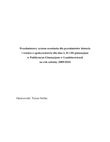 Przedmiotowy system oceniania dla przedmiotów historia i wiedza o społeczeństwie dla klas I, II i III gimnazjum w Publicznym Gimnazjum w Łambinowicach na rok szkolny 2009/2010 Opracowała: Teresa Stefan 1. Tryb informowania uczniów i rodziców (opiekunów prawnych) o wymaganiach edukacyjnych: - nauczyciel na początku każdego roku szkolnego informuje uczniów o szczegółowych kryteriach i formach oceniania, dyktuje do zeszytu notatkę zawierającą podstawowe zasady PSO; - rodzic (opiekun prawny) ma prawo dowiedzieć się indywidualnie od nauczyciela danego przedmiotu o szczegółowych kryteriach oceniania. 2. Metody i formy oceny osiągnięć edukacyjnych: - ocenie podlegają wiadomości i umiejętności oraz zaangażowanie i aktywność ucznia na zajęciach; - ocena dokonywana jest poprzez: * aktywność ucznia na lekcji (ocenianie ucznia poprzez plusy i minusy: 3 „-” – nast., 3 „+” – bdb; * wypowiedz ustna; * kartkówki obejmujące materiał z trzech ostatnich lekcji, są niezapowiedziane i trwają 10-15 min.; * sprawdziany obejmujące część działu, zapowiadane są tydzień wcześniej i trwają 30-45 min.; * zadania klasowe obejmujące jeden lub kilka działów, zapowiadane są tydzień wcześniej i trwają 45 min.; * zadania domowe. 3. Zasady bieżącego oceniania: - oceny są jawne dla uczniów i rodziców (prawnych opiekunów); - na prośbę ucznia lub rodziców nauczyciel udostępnia prace kontrolne, sprawdziany oraz uzasadnia wystawione oceny; - ocena z odpowiedzi ustnej powinna być uzasadniona przez nauczyciela w chwili wystawienia; - uczeń powinien być oceniany regularnie; - uczeń mający zajęcia raz w tygodniu powinien otrzymać minimum trzy oceny w ciągu semestru, jeśli uczeń ma zajęcia dwa razy w tygodniu powinien otrzymać minimum piec ocen w ciągu semestru; - uczeń ma prawo do zgłoszenia nieprzygotowania do lekcji raz w semestrze, jeśli zajęcia się odbywają raz w tygodniu; jeżeli zajęcia lekcyjne odbywają się dwa razy w tygodniu, wówczas uczeń ma prawo do dwóch nieprzygotowań (powinien je zgłosić na początku lekcji), nieprzygotowanie nie przysługuje na lekcji, na której wcześniej zapowiedziany został sprawdzian, klasówka lub inna pisemna forma kontroli wiedzy i umiejętności; - uczeń jest przygotowany do lekcji, jeśli posiada zeszyt, podręcznik, inne pomoce określone przez nauczyciela na początku roku szkolnego, wykonał prace domowa, powtórzył i utrwalił zagadnienia z poprzedniej lekcji. 4. Zasady pisania prac pisemnych: - prace pisemne są oceniane według wcześniej podanych kryteriów; - uczeń powinien napisać w czasie roku szkolnego wszystkie przewidziane klasówki, sprawdziany z danego przedmiotu. Nauczyciel ustala termin i sposób zaliczenia klasówki, sprawdzianu. Jeśli uczeń nie zaliczy klasówki, sprawdzianu, to wówczas otrzymuje ocenę niedostateczna; - uczeń korzystający w czasie odpowiedzi ustnej i pracy pisemnej z niedozwolonych form pomocy otrzymuje ocenę niedostateczna, rozmowa w czasie pisania pracy pisemnej również jest traktowana jako niedozwolona forma pomocy. 5. Zasady poprawiania ocen przez uczniów: - uczeń ma prawo poprawić ocenę z prac pisemnych w formie ustalonej przez nauczyciela w ciągu 3 tygodni od daty wystawienia oceny, kartkówki nie ulegają poprawie 6. Zasady wystawiania śródrocznych i rocznych ocen klasyfikacyjnych: - oceny semestralne są ustalane na podstawie ocen cząstkowych z uwzględnieniem ich ważności; - te same kryteria musza być stosowane dla wszystkich uczniów danej klasy; - ocena z zajęć nie może uwzględniać zachowania ucznia. 7. Tryb informowania uczniów oraz rodziców (opiekunów prawnych) o przewidywanej ocenie w klasyfikacji śródrocznej i rocznej: - rodzic (opiekun prawny) ma prawo dowiedzieć się indywidualnie od nauczyciela danego przedmiotu o szczegółowych kryteriach oceniania, jak również o postępach ucznia wraz z uzasadnieniem danych ocen; - dwa tygodnie przed śródrocznym o końcoworocznym posiedzeniem Rady Pedagogicznej należy poinformować ucznia na lekcji i jego rodziców o przewidywanej ocenie. 8. Zasady dokumentowania oceniania: - oceny są wpisywane do dziennika wraz z data ich wystawienia; - oceny za prace pisemne, sprawdziany, testy, zadania klasowe wpisywane są kolorem czerwonym; - nieprzygotowanie odnotowywane jest poprzez wpisanie do dziennika daty zgłoszenia; - prace pisemne są przechowywane przez nauczyciela do zakończenia roku szkolnego. 9. Przy ocenianiu proponuje się sześciostopniową skalę ocen. Ocenę dopuszczającą otrzymuje uczeń, który: • ma braki w podstawowych wiadomościach, lecz z pomocą nauczyciela potrafi je nadrobić, • rozwiązuje i wykonuje typowe zadania o niewielkim stopniu trudności, • przejawia gotowość i chęć do przyswajania nowych wiadomości i współpracy z nauczycielem. Ocenę dostateczną otrzymuje uczeń, który: • opanował treści przewidziane w programie nauczania na poziomie podstawowym, • rozwiązuje i wykonuje typowe zadania o średnim stopniu trudności i niewielkim stopniu złożoności, • próbuje porównywać, selekcjonować i klasyfikować fakty i informacje, • dostrzega podstawowe związki pomiędzy różnymi faktami historycznymi, • współpracuje z nauczycielem, • wykazuje aktywność na lekcji. Ocenę dobrą otrzymuje uczeń który: • potrafi samodzielnie pracować z podręcznikiem, materiałem źródłowym, • ustnie i pisemnie stosuje terminy i pojęcia historyczne, • rozwiązuje typowe problemy z wykorzystaniem informacji z różnych źródeł, • efektywnie współdziała w zespole i aktywnie pracuje w grupie, • bierze udział w dyskusjach, wymianie poglądów, potrafi argumentować i bronić swoich racji. Ocenę bardzo dobrą otrzymuje uczeń, który: • opanował pełny zakres wiedzy i umiejętności określony programem nauczania historii w danej klasie, • sprawnie posługuje się wiadomościami, • rozwiązuje 