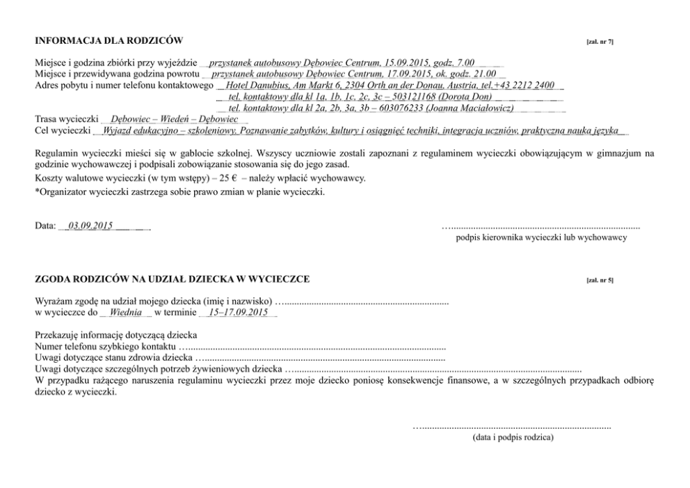INFORMACJA DLA RODZICÓW [zał. nr 7] Miejsce i godzina zbiórki przy wyjeździe przystanek autobusowy Dębowiec Centrum, 15.09.2015, godz. 7.00 Miejsce i przewidywana godzina powrotu przystanek autobusowy Dębowiec Centrum, 17.09.2015, ok. godz. 21.00 Adres pobytu i numer telefonu kontaktowego Hotel Danubius, Am Markt 6, 2304 Orth an der Donau, Austria, tel.+43 2212 2400 tel. kontaktowy dla kl 1a, 1b, 1c, 2c, 3c – 503121168 (Dorota Don) tel. kontaktowy dla kl 2a, 2b, 3a, 3b – 603076233 (Joanna Maciałowicz) Trasa wycieczki Dębowiec – Wiedeń – Dębowiec Cel wycieczki Wyjazd edukacyjno – szkoleniowy. Poznawanie zabytków, kultury i osiągnięć techniki, integracja uczniów, praktyczna nauka języka Regulamin wycieczki mieści się w gablocie szkolnej. Wszyscy uczniowie zostali zapoznani z regulaminem wycieczki obowiązującym w gimnazjum na godzinie wychowawczej i podpisali zobowiązanie stosowania się do jego zasad. Koszty walutowe wycieczki (w tym wstępy) – 25 € – należy wpłacić wychowawcy. *Organizator wycieczki zastrzega sobie prawo zmian w planie wycieczki. Data: 03.09.2015 …............................................................................. podpis kierownika wycieczki lub wychowawcy ZGODA RODZICÓW NA UDZIAŁ DZIECKA W WYCIECZCE [zał. nr 5] Wyrażam zgodę na udział mojego dziecka (imię i nazwisko) …................................................................... w wycieczce do Wiednia w terminie 15–17.09.2015 Przekazuję informację dotyczącą dziecka Numer telefonu szybkiego kontaktu …......................................................................................................... Uwagi dotyczące stanu zdrowia dziecka ….................................................................................................. Uwagi dotyczące szczególnych potrzeb żywieniowych dziecka …..................................................................................................................... W przypadku rażącego naruszenia regulaminu wycieczki przez moje dziecko poniosę konsekwencje finansowe, a w szczególnych przypadkach odbiorę dziecko z wycieczki. …............................................................................. (data i podpis rodzica)