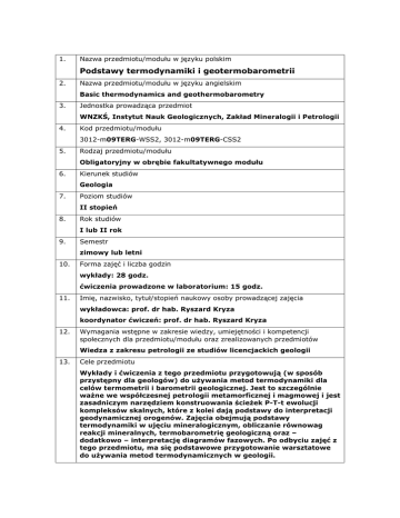 1. Nazwa przedmiotu/modułu w języku polskim Podstawy termodynamiki i geotermobarometrii 2. Nazwa przedmiotu/modułu w języku angielskim Basic thermodynamics and geothermobarometry 3. Jednostka prowadząca przedmiot WNZKŚ, Instytut Nauk Geologicznych, Zakład Mineralogii i Petrologii 4. Kod przedmiotu/modułu 3012-m09TERG-WSS2, 3012-m09TERG-CSS2 5. Rodzaj przedmiotu/modułu Obligatoryjny w obrębie fakultatywnego modułu 6. Kierunek studiów Geologia 7. Poziom studiów II stopień 8. Rok studiów I lub II rok 9. Semestr zimowy lub letni 10. Forma zajęć i liczba godzin wykłady: 28 godz. ćwiczenia prowadzone w laboratorium: 15 godz. 11. Imię, nazwisko, tytuł/stopień naukowy osoby prowadzącej zajęcia wykładowca: prof. dr hab. Ryszard Kryza koordynator ćwiczeń: prof. dr hab. Ryszard Kryza 12. Wymagania wstępne w zakresie wiedzy, umiejętności i kompetencji społecznych dla przedmiotu/modułu oraz zrealizowanych przedmiotów Wiedza z zakresu petrologii ze studiów licencjackich geologii 13. Cele przedmiotu Wykłady i ćwiczenia z tego przedmiotu przygotowują (w sposób przystępny dla geologów) do używania metod termodynamiki dla celów termometrii i barometrii geologicznej. Jest to szczególnie ważne we współczesnej petrologii metamorficznej i magmowej i jest zasadniczym narzędziem konstruowania ścieżek P-T-t ewolucji kompleksów skalnych, które z kolei dają podstawy do interpretacji geodynamicznej orogenów. Zajęcia obejmują podstawy termodynamiki w ujęciu mineralogicznym, obliczanie równowag reakcji mineralnych, termobarometrię geologiczną oraz – dodatkowo – interpretację diagramów fazowych. Po odbyciu zajęć z tego przedmiotu, ma się podstawowe przygotowanie warsztatowe do używania metod termodynamicznych w geologii. 14. Zakładane efekty kształcenia (W_1) Ma pogłębioną wiedzę nt. zjawisk i procesów geologicznych w skorupie Ziemi i ich termodynamicznych uwarunkowań. (W_2) Ma wiedzę z zakresu nauk ścisłych powiązanych z wybranymi aspektami nauk geologicznych, w szczególności z chemii fizycznej i termodynamiki. (W_3) Ma wiedzę w zakresie aktualnych problemów nauk o Ziemi oraz stosowanych w nich współczesnych metod badawczych, takich jak geotermobarometria. (W_4) Konsekwentnie stosuje zasadę ścisłego, opartego na danych empirycznych interpretowania zjawisk i procesów przyrodniczych w pracy badawczej. (W_5) Posiada pogłębioną wiedzę z wybranych dyscyplin nauk geologicznych (w szczególności – zastosowań geotermobarometrii w mineralogii i petrologii). (U_1) Potrafi zastosować zaawansowane techniki i narzędzia badawcze w zakresie wybranych dyscyplin nauk geologicznych (komputerowe modelowanie termodynamiczne). (U_2) Wykorzystuje literaturę naukową z zakresu nauk geologicznych w języku polskim i angielskim. (K_1) Rozumie potrzebę ciągłego uczenia się i podnoszenia kompetencji zawodowych, a także inspirowania i organizowania procesu uczenia się innych osób. 15. Symbole kierunkowych efektów kształcenia K2_W01 K2_W02 K2_W03 K2_W04 K2_W08 K2_U01 K2_U02 K2_K01 Treści programowe Wykłady: 1. Elementy chemii fizycznej w ujęciu mineralogicznym (pojęcia podstawowe, układy i ich opis; I zasada termodynamiki: energia wew., entalpia; II zasada termodynamiki, entropia). 2. Analiza termodynamiczna układów mineralnych (standardowe wielkości termodynamiczne: Vm, Cp, So, ∆ H0, ∆ G0; ocena kierunku reakcji mineralnej w warunkach standardowych; ocena kierunku reakcji w różnych warunkach T, P; obliczanie diagramów P-T stabilności minerałów o stałym składzie; reakcje z udziałem minerałów o zmiennym składzie). 3. Geotermobarometria: zasady konstrukcji geotermometrów i geobarometrów. Typy i przykłady geotermometrów i geobarometrów: proste reakcje mineralne (odmiany polimorficzne Al2SiO5); termometria solvus (termometr skaleniowy, Cal-Dol); termometria wymiany (Grt-Bt); reakcje z powstaniem/zanikiem faz (GASP: Grt-Pl-Al2SiO5-Qtz); termometria izotopowa; inne geotermobarometry (inkluzje, krystaliczność illitu i in.). 4. Komputerowe metody geotermobarometrii i modelowania termodynamicznego w geologii. 5. Diagramy fazowe i ich interpretacja (typy diagramów fazowych, określanie stanu układu w określonych warunkach, opis toru krystalizacji i topienia na wybranych diagramach fazowych: Di-An, Ne-SiO2, Fo-SiO2, LcSiO2, Ab-An, Ab-Or). Ćwiczenia: Ćwiczenia mają na celu praktyczne opanowanie metod stosowania podstaw termodynamiki do analizy układów mineralnych: obliczania warunków równowagi reakcji mineralnych i określania warunków temperatury i ciśnienia powstawania skał. Odrębną częścią ćwiczeń jest interpretacja diagramów fazowych użytecznych w petrologii metamorficznej i magmowej. Po zaliczeniu Podstaw termodynamiki i geotermobarometrii student ma przygotowanie do używania metod termodynamicznych (zwłaszcza termometrów i barometrów geologicznych) w swoich badaniach, co znajduje zastosowanie w petrologii i wielu innych dziedzinach geologii. 16. Zalecana literatura (podręczniki) Literatura podstawowa: Anderson, Crerar, 1993. Thermodynamics in geochemistry. The equilibrium model. Oxford. Bulakh, Krivovichev, Zolotariov, 1995. Formuly mineralov. Termodinamicheskiy analiz v mineralogii i geochimii. St.Petersburg. Fletcher, 1993. Chemical thermodynamics for Earth scientists. Longman. Smyth, 1993. Basic chemical thermodynamics. Oxford. Ufnalski W., 2004. Wprowadzenie do termodynamiki chemicznej. Oficyna Wydawnicza Politechniki Warszawskiej. Literatura uzupełniająca: Ehlers, 1972. The interpretation of geological phase diagrams. San Francisco. Spear, 1993. Metamorphic phase equilibria and pressure-temperature-time paths. Min. Soc. Amer., Washington. Ufnalski W., 2008. Równowagi i diagramy fazowe. Oficyna Wydawnicza Politechniki Warszawskiej. 17. Forma zaliczenia poszczególnych komponentów przedmiotu/modułu, sposób sprawdzenia osiągnięcia zamierzonych efektów kształcenia: Wykłady: