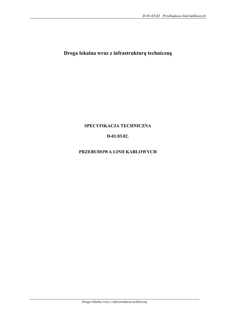 D-01.03.02 Przebudowa linii kablowych Droga lokalna wraz z infrastrukturą techniczną SPECYFIKACJA TECHNICZNA D-01.03.02. PRZEBUDOWA LINII KABLOWYCH Droga lokalna wraz z infrastrukturą techniczną D-01.03.02 Przebudowa linii kablowych D-01.03.02 1. PRZEBUDOWA LINII KABLOWYCH WSTĘP 1.1. Przedmiot Specyfikacji Technicznej Przedmiotem niniejszej Specyfikacji Technicznej są wymagania dotyczące wykonania i odbioru robót związanych z przedsięwzięciem: „Droga lokalna wraz z infrastrukturą techniczną” w miejscowości Gniew przy ulicy Witosa. 1.2. Zakres stosowania Specyfikacji Technicznej Specyfikacje Techniczne są stosowane jako dokument przetargowy i kontraktowy przy zlecaniu i realizacji Robót wymienionych w pkt. 1.1. 1.3. Zakres robót objętych Specyfikacją Techniczną Zakres robót objętych Specyfikacją Techniczną obejmuje prowadzenie robót kablowych w obszarze budowy ul. Witosa w zakresie przebudowy linii kablowych nn-0,4kV oraz SN– 15kV, których właścicielem jest ENERGA - OPERATOR S.A. Rejon Dystrybucji w Starogardzie Gdańskim, ul. Pelplińska 24, 83-200 Starogard oraz zabezpieczenie linii telekomunikacyjnych, których właścicielem jest TPSA, Dział Zarządzania Sieciami w Gdańsku, ul. Czerwony Dwór, 80-376 Gdańsk. • Zakres montażu linii nn-0,4kV: budowa linii kablowej nn-0,4kV typu YAKXS 4x120mm2 budowa linii kablowej nn-0,4kV typu YAKXS 4x35mm2 • Zakres montażu linii SN-15kV: zabezpieczenie linii kablowej SN-15kV typu 3xXRUHAKXS 1x120mm2 • Zakres demontażu linii kablowej nn-0,4kV: demontaż linii nn-0,4kV typu YAKY 4x35mm2 demontaż linii nn-0,4kV typu YAKY120mm2 • Zakres montażu linii telekomunikacyjnej: zabezpieczenie linii telekomunikcyjnej 1.4. Określenia podstawowe sieć elektroenergetyczna – zespół połączonych wzajemnie linii i stacji elektroenergetycznych przeznaczonych do przesyłania i rozdzielnia energii elektrycznej, linia elektroenergetyczna napowietrzna – linia elektroenergetyczna, której przewody są zawieszone nad ziemia za pomocą izolatorów i odpowiednich konstrukcji wsporczych, linia elektroenergetyczna kablowa – linia elektroenergetyczna o przewodach izolowanych, ułożonych bezpośrednio w ziemi lub też w odpowiednim tunelu, kanale, galerii, rurociągu itp, której przewody są przewód – element służący do przekazywania energii lub informacji względnie do ochrony innych elementów linii napięcie – napięcie międzyprzewodowe na które zbudowana jest linia, Droga lokalna wraz z infrastrukturą techniczną D-01.03.02 Przebudowa linii kablowych trasa kabla - linia łamana pokrywająca z dokładnością do 0,5m (w miejscu ułożenia zapasu szerokość pasa zajętego przez kabel jest większa i może wynosić do kilku metrów) rzeczywiste położenie kabla. długość trasowa - odległość mierzona między dwoma punktami po trasie kabla. długość elektryczna - rzeczywista długość odcinka kabla zawarta między dwoma punktami na kablu mierzona wzdłuż osi kabla. Długość elektryczna jest równa długości trasowej powiększonej o dodatek długości na układanie kabla wzdłuż linii falistej (sfalowanie), uskoki pionowe, zapasy i wyprowadzenia na słupy, lub ściany, pomniejszona o skróty na silnych załomach trasy. długość fabrykacyjna - długość odcinka kabla w momencie zakupu. zapas kabla - dodatek długości kabla uzyskany przez ułożenie kabla w kształcie pętli lub zwojów. wstawka - nowy odcinek linii wbudowany w linię istniejącą bez obejścia równoległego (rokadowego). osprzęt elektryczny linii kablowej - zbiór elementów przeznaczonych do łączenia rozgałęziania lub zakańczania kabli np. mufy, głowice skrzyżowanie - takie miejsce na trasie linii kablowej, w którym jakakolwiek część rzutu poziomego linii kablowej przecina lub pokrywa jakąkolwiek część rzutu poziomego innej linii kablowej lub innego urządzenia podziemnego albo naziemnego osłona kabla - konstrukcja przeznaczona do ochrony kabli przed uszkodzeniem mechanicznym, chemicznym i działaniem łuku elektrycznego uziemienie ochronne – uziemienie spełniające przypisaną mu funkcję w ochronie przeciwporażeniowej, uziemienie punktu neutralnego N, przewodu PEN (P) lub zacisku ochronnego, ochrona przeciwporażeniowa przed dotykiem bezpośrednim – zespół środków technicznych chroniących przed zetknięciem się człowieka z częściami czynnymi stwarzającymi zagrożenie porażeniowe prądem elektrycznym, przewód PEN – uziemiony przewód spełniający równocześnie funkcję przewodu ochronnego PE i przewodu neutralnego N, przewód N – przewód czynny wyprowadzony z punktu neutralnego układu prądu przemiennego, uczestniczący w przesyłaniu energii elektrycznej, przewód ochronny PE – uziemiony przewód nie podlegający obciążeniu prądami roboczymi, z którymi łączy się części przewodzące dostępne i który stanowi element ochrony przez samoczynne wyłączenie zasilania, uziemienie – połączenie elektryczne z ziemią; również instalacja uziemiająca; w skład której może wchodzić: uziom, przewód uziemiający, zacisk probierczy lub szyna uziemiająca, a także przewód ochronny łączący zacisk lub szynę z częścią uziemioną. uziemienie ochronne – uziemienie spełniające przypisaną mu funkcję w ochronie przeciw porażeniowej; uziemienie punktu neutralnego N, przewodu PEN lub zacisku ochronnego; uziemienie ochronno-robocze – uziemienie spełniające funkcję uziemienia ochronnego i roboczego, rezystancja uziemienia – rezystancja między zaciskiem uziemiającym lub zaciskiem probierczym a ziemią odniesienia, Pozostałe określenia są zgodne z normą PN-76/E-05125 i definicjami podanymi w ST D-M00.00.00. "Wymagania ogólne". Droga lokalna wraz z infrastrukturą techniczną D-01.03.02 Przebudowa linii kablowych 1.5. Ogólne wymagania dotyczące robót Ogólne wymagania dotyczące robót podano w Specyfikacji Technicznej D-00.00.00 "Wymagania Ogólne", pkt. 1.
