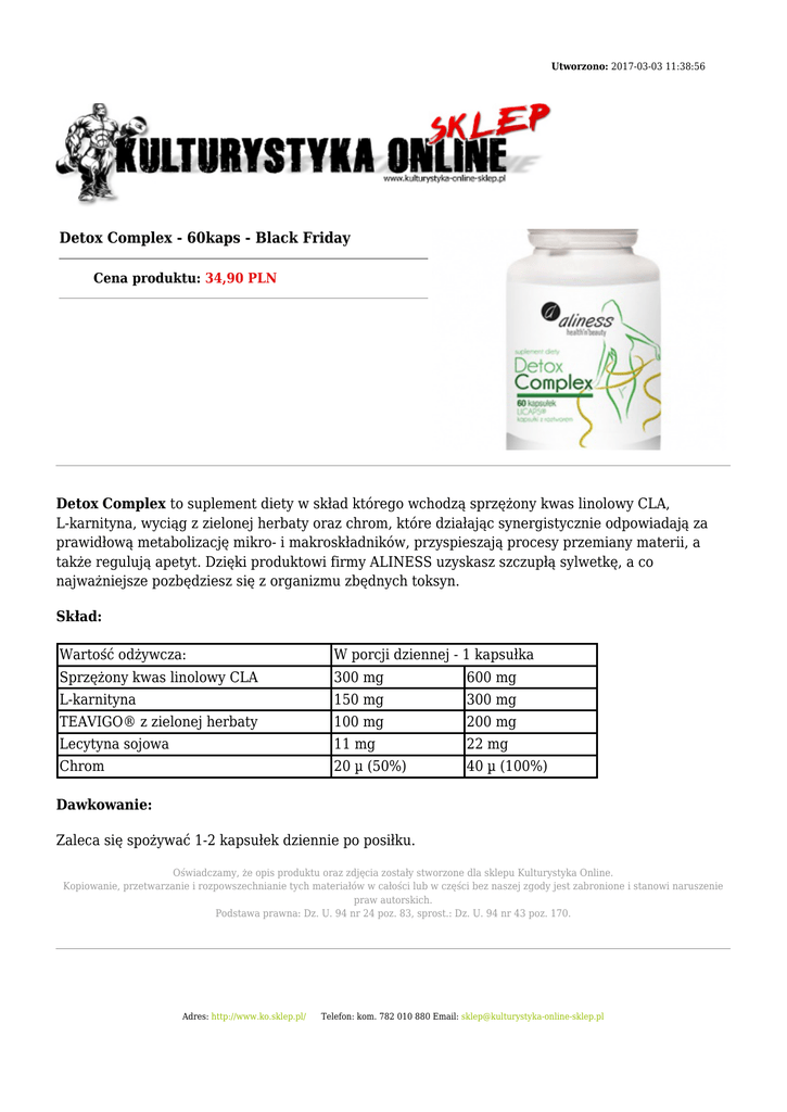 Utworzono: 2017-03-03 11:38:56 Detox Complex - 60kaps - Black Friday Cena produktu: 34,90 PLN Detox Complex to suplement diety w skład którego wchodzą sprzężony kwas linolowy CLA, L-karnityna, wyciąg z zielonej herbaty oraz chrom, które działając synergistycznie odpowiadają za prawidłową metabolizację mikro- i makroskładników, przyspieszają procesy przemiany materii, a także regulują apetyt. Dzięki produktowi firmy ALINESS uzyskasz szczupłą sylwetkę, a co najważniejsze pozbędziesz się z organizmu zbędnych toksyn. Skład: Wartość odżywcza: W porcji dziennej - 1 kapsułka Sprzężony kwas linolowy CLA 300 mg 600 mg L-karnityna 150 mg 300 mg TEAVIGO® z zielonej herbaty 100 mg 200 mg Lecytyna sojowa 11 mg 22 mg Chrom 20 µ (50%) 40 µ (100%) Dawkowanie: Zaleca się spożywać 1-2 kapsułek dziennie po posiłku. Oświadczamy, że opis produktu oraz zdjęcia zostały stworzone dla sklepu Kulturystyka Online. Kopiowanie, przetwarzanie i rozpowszechnianie tych materiałów w całości lub w części bez naszej zgody jest zabronione i stanowi naruszenie praw autorskich. Podstawa prawna: Dz. U. 94 nr 24 poz. 83, sprost.: Dz. U. 94 nr 43 poz. 170. Adres: http://www.ko.sklep.pl/ Telefon: kom. 782 010 880 Email: [email protected]