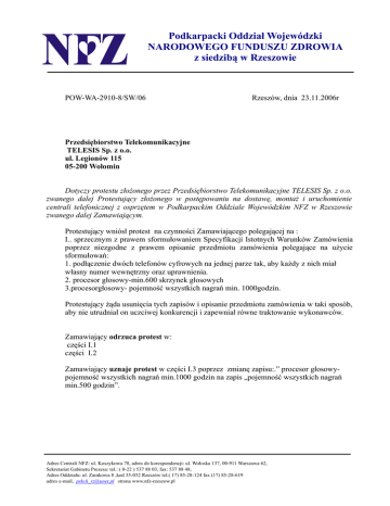 Podkarpacki Oddział Wojewódzki NARODOWEGO FUNDUSZU ZDROWIA z siedzibą w Rzeszowie POW-WA-2910-8/SW/06 Rzeszów, dnia 23.11.2006r Przedsiębiorstwo Telekomunikacyjne TELESIS Sp. z o.o. ul. Legionów 115 05-200 Wołomin Dotyczy protestu złożonego przez Przedsiębiorstwo Telekomunikacyjne TELESIS Sp. z o.o. zwanego dalej Protestujący złożonego w postępowaniu na dostawę, montaż i uruchomienie centrali telefonicznej z osprzętem w Podkarpackim Oddziale Wojewódzkim NFZ w Rzeszowie zwanego dalej Zamawiającym. Protestujący wniósł protest na czynności Zamawiającego polegającej na : I.. sprzecznym z prawem sformułowaniem Specyfikacji Istotnych Warunków Zamówienia poprzez niezgodne z prawem opisanie przedmiotu zamówienia polegające na użycie sformułowań: 1. podłączenie dwóch telefonów cyfrowych na jednej parze tak, aby każdy z nich miał własny numer wewnętrzny oraz uprawnienia. 2. procesor głosowy-min.600 skrzynek głosowych 3.procesorgłosowy- pojemność wszystkich nagrań min. 1000godzin. Protestujący żąda usunięcia tych zapisów i opisanie przedmiotu zamówienia w taki sposób, aby nie utrudniał on uczciwej konkurencji i zapewniał równe traktowanie wykonawców. Zamawiający odrzuca protest w: części I.1 części I.2 Zamawiający uznaje protest w części I.3 poprzez zmianę zapisu:.” procesor głosowypojemność wszystkich nagrań min.1000 godzin na zapis „pojemność wszystkich nagrań min.500 godzin”. Adres Centrali NFZ: ul. Koszykowa 78, adres do korespondencji: ul. Wołoska 137, 00-911 Warszawa 62, Sekretariat Gabinetu Prezesa: tel.: ( 0-22 ) 537 88 03, fax: 537 88 48, Adres Oddziału: ul. Zamkowa 8 ,kod 35-032 Rzeszów tel.( 17) 85-28-124 fax (17) 85-28-619 adres e-mail, [email protected] strona www.nfz-rzeszow.pl Uzasadnienie Ad.I 1 Sformułowanie „podłączenie dwóch telefonów cyfrowych na jednej parze tak, aby każdy z nich miał własny numer wewnętrzny oraz uprawnienia” nie ogranicza konkurencji. Taką funkcjonalność nie oferuje jedynie firma Panasonic . Możliwości takie oferują centrale telefoniczne m.in. ASCOM Office, czy Siemens HiPath serii 3000. Ad. I.2 Sformułowanie „procesor głosowy-min.600 skrzynek głosowych” jest zgodne z potrzebami Zamawiającego. Inwestycja w centralę telefoniczną jest inwestycją długoterminową , a wybór 600 skrzynek głosowych stanowi zabezpieczenie potrzeb Podkarpackiego Oddziału Wojewódzkiego NFZ w Rzeszowie. AdI.3. Zamawiający po analizie urządzeń innych producentów (np.Alcatel OmniMessage 4635H-30 000skrzynek głosowych pojemność 500 godzin) stwierdzić można że proponowana wartość 500 godzin nie spowoduje co zarzucał Protestujący zawężenia kręgu potencjalnych wykonawców do tych oferujących produkty firmy Panasonic i jednocześnie oddali zarzut faworyzacji konkretnych rozwiązań technicznych.