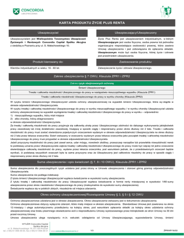 KARTA PRODUKTU ŻYCIE PLUS RENTA Ubezpieczyciel Ubezpieczający/Ubezpieczony Ubezpieczycielem jest Wielkopolskie Towarzystwo Ubezpieczeń Życiowych i Rentowych Concordia Capital Spółka Akcyjna z siedzibą w Poznaniu przy ul. S. Małachowskiego 10. Życie Plus Renta jest ubezpieczeniem indywidualnym, w którym Ubezpieczającym jest osoba fizyczna, osoba prawna lub jednostka organizacyjna nieposiadająca osobowości prawnej, która zawiera Umowę ubezpieczenia i jest zobowiązana do opłacania składek. Ubezpieczonym może być osoba fizyczna, której życie i zdrowie jest przedmiotem ubezpieczenia. Produkt kierowany do: Zastosowanie produktu: Klientów indywidualnych w wieku: 16 - 60 lat. Zabezpieczenie życia i zdrowia Ubezpieczonego. Zakres ubezpieczenia § 7 OWU, Klauzula ZPR1 i ZPR2 Zakres ryzyk obejmowanych ochroną Śmierć Ubezpieczonego Trwała i całkowita niezdolność Ubezpieczonego do pracy w następstwie nieszczęśliwego wypadku (Klauzula ZPR1) Trwała i całkowita niezdolność Ubezpieczonego do pracy w wyniku choroby (Klauzula ZPR2) W ryzyku śmierci Ubezpieczonego Ubezpieczyciel udziela ochrony ubezpieczeniowej na wypadek śmierci Ubezpieczonego, która wy-stąpiła w okresie odpowiedzialności Ubezpieczyciela. W ryzyku trwałej i całkowitej niezdolności Ubezpieczonego do pracy w wyniku nieszczęśliwego wypadku / w wyniku choroby Ubezpieczyciel udziela ochrony ubezpieczeniowej na wypadek wystąpienia trwałej i całkowitej niezdolności Ubezpieczonego do pracy w wyniku – odpowiednio: 1) nieszczęśliwego wypadku, który miał miejsce 2) albo choroby, którą zdiagnozowano w okresie odpowiedzialności Ubezpieczyciela. Za trwałą i całkowitą niezdolność do pracy przyjmuje się całkowitą utratę przez Ubezpieczonego zdolności do dalszego wykonywania jakiejkolwiek pracy zawodowej lub innej działalności zawodowej, trwającą w sposób ciągły i nieprzerwany przez okres dłuższy niż 2 lata. Trwała i całkowita niezdolność do pracy musi zostać stwierdzona pojedynczym orzeczeniem wydanym w okresie odpowiedzialności Ubezpieczyciela na okres dłuższy niż 2 lata przez lekarza orzecznika. Dzień wskazany w orzeczeniu wydanym przez lekarza orzecznika jako początek trwałej i całkowitej niezdolności Ubezpieczonego do pracy musi przypadać w okresie odpowiedzialności Ubezpieczyciela. Jeżeli przyczyną niezdolności do pracy jest zawał serca, udar mózgu, nowotwór złośliwy, przeszczep narządów lub przewlekła niewydolność nerek to podstawą uznania przez Ubezpieczyciela zajścia trwałej i całkowitej niezdolności Ubezpieczonego do pracy może być więcej niż jedno orzeczenie stwierdzające całkowitą niezdolność do pracy, wydane przez lekarza orzecznika, pod warunkiem jednak, że z przedstawionych orzeczeń będzie wynikać, iż podstawą wszystkich orzeczeń była ta sama przyczyna oraz że Ubezpieczony jest całkowicie niezdolny do pracy w sposób ciągły i nieprzerwany przez okres dłuższy niż 2 lata. Suma ubezpieczenia i opis świadczeń (§ 7, 8 i 10 OWU), Klauzula ZPR1 i ZPR2 Suma ubezpieczenia dla poszczególnych ryzyk ustalana jest przez strony w Umowie ubezpieczenia i stanowi górną granicę odpowiedzialności Ubezpieczyciela. Suma ubezpieczenia nie podlega indeksacji. Z tytułu śmierci Ubezpieczonego Ubezpieczyciel wypłaca świadczenie w wysokości sumy ubezpieczenia. Z tytułu trwałej i całkowitej niezdolności do pracy Ubezpieczyciel wypłaca świadczenie w formie renty miesięcznej w wysokości 1/60 sumy ubezpieczenia przez okres niezdolności Ubezpieczonego do pracy (maksymalnie do wysokości sumy ubezpieczenia). Świadczenie wypłaca się w polskich złotych, niezależnie od miejsca zdarzenia. Okres ochrony ubezpieczeniowej/Rozwiązanie Umowy § 3, § 5 i § 12 OWU Ochrona ubezpieczeniowa udzielana jest w okresie ubezpieczenia. Okres ubezpieczenia wskazany jest w dokumencie ubezpieczenia. Ochrona ubezpieczeniowa dotyczy wyłącznie zdarzeń, które miały miejsce w okresie ubezpieczenia. Standardowo Umowa jest zawierana na okres 12 miesięcy i ulega automatycznemu przedłużeniu na kolejny okres, pod warunkiem opłacenia składki za kolejny okres udzielania ochrony ubezpieczeniowej oraz braku pisemnego oświadczenia woli o nieprzedłużeniu Umowy wystosowanego przez którąkolwiek ze stron Umowy na 30 dni przed rocznicą Umowy. Umowa ubezpieczenia ulega rozwiązaniu m.in. wskutek: odstąpienia od Umowy Ubezpieczającego, wypowiedzenia Umowy, śmierci WTUŻiR Concordia Capital Spółka Akcyjna ul. S. Małachowskiego 10, 61-129 Poznań tel. (+48) 61 858 48 00, fax (+48) 61 858 48 01 www.concordiaubezpieczenia.pl 1/3 ŻPR/KP/16/03 KARTA PRODUKTU ŻYCIE PLUS RENTA Ubezpieczonego, nieopłacenia przez Ubezpieczającego składki - w dniu wskazanym na wezwaniu do zapłaty, zgodnie z § 9 ust. 13. Ubezpieczający może wypowiedzieć Umowę w każdym czasie z zachowaniem miesięcznego okresu wypowiedzenia. W przypadku gdy Umowa ubezpieczenia została zawarta na okres powyżej 6 miesięcy, Ubezpieczający może również odstąpić od Umowy ze skutkiem natychmiastowym w ciągu 30 dni od zawarcia Umowy ubezpieczenia lub w ciągu 7 dni jeżeli Ubezpieczający jest przedsiębiorcą. Pełen katalog sposobów zakończenia Umowy i szczegóły zawarto w § 5 OWU. Rozwiązanie Umowy przed upływem okresu ubezpieczenia nie wiąże się dla Ubezpieczającego z żadnymi kosztami. Ubezpieczający jest uprawniony do zwrotu składki za okres niewykorzystanej ochrony ubezpieczeniowej. Zgłaszanie szkód i odwołań § 17 i 18 OWU 1. Po otrzymaniu zawiadomienia o zajściu zdarzenia objętego ochroną ubezpieczeniową, w terminie 7 dni od dnia otrzymania tego zawiadomienia, Ubezpieczyciel informuje o tym Ubezpieczającego i Ubezpieczonego, a także pisemnie lub drogą elektroniczną informuje Ubezpieczającego, Ubezpieczonego lub Uprawnionego z Umowy ubezpieczenia, jakie dokumenty są potrzebne do ustalenia świadczenia. 2. Jeżeli w terminach o