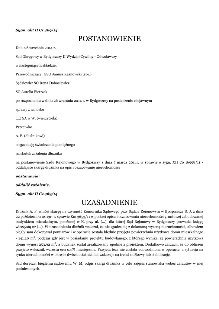 Sygn. akt II Cz 469/14 POSTANOWIENIE Dnia 26 września 2014 r. Sąd Okręgowy w Bydgoszczy II Wydział Cywilny - Odwoławczy w następującym składzie: Przewodniczący : SSO Janusz Kasnowski (spr.) Sędziowie: SO Irena Dobosiewicz SO Aurelia Pietrzak po rozpoznaniu w dniu 26 września 2014 r. w Bydgoszczy na posiedzeniu niejawnym sprawy z wniosku (...) SA w W. (wierzyciela) Przeciwko A. P. (dłużnikowi) o egzekucję świadczenia pieniężnego na skutek zażalenia dłużnika na postanowienie Sądu Rejonowego w Bydgoszczy z dnia 7 marca 2014r. w sprawie o sygn. XII Co 16998/11 oddalające skargę dłużnika na opis i oszacowanie nieruchomości postanawia: oddalić zażalenie. Sygn. akt II Cz 469/14 UZASADNIENIE Dłużnik A. P. wniósł skargę na czynność Komornika Sądowego przy Sądzie Rejonowym w Bydgoszczy S. J. z dnia 22 października 2013r. w sprawie Km 3653/11 w postaci opisu i oszacowania nieruchomości gruntowej zabudowanej budynkiem mieszkalnym, położonej w K. przy ul. (...), dla której Sąd Rejonowy w Bydgoszczy prowadzi księgę wieczystą nr (...). W uzasadnieniu dłużnik wskazał, że nie zgadza się z dokonaną wyceną nieruchomości, albowiem biegły sam dokonywał pomiarów i w operacie została błędnie przyjęta powierzchnia użytkowa domu mieszkalnego - 141,20 m2, podczas gdy jest w posiadaniu projektu budowlanego, z którego wynika, że powierzchnia użytkowa domu wynosi 253,92 m2, a budynek został zrealizowany zgodnie z projektem. Dodatkowo zarzucił, że do obliczeń przyjęto wskaźnik wzrostu cen 0,5% miesięcznie. Przyjęta teza nie została udowodniona w operacie, a sytuacja na rynku nieruchomości w okresie dwóch ostatnich lat wskazuje na trend zniżkowy lub stabilizację. Sąd doręczył biegłemu sądowemu W. M. odpis skargi dłużnika w celu zajęcia stanowiska wobec zarzutów w niej podniesionych. Biegły wyjaśnił, że na wyznaczony termin oględzin nieruchomości dłużnik nie przybył, a obecnym w zastępstwie członkom rodziny nie przekazał do okazania projektu budynku, zatem biegły sam musiał wykonać pomiary inwentaryzacyjne wraz z odręcznymi szkicami budynku. Częścią składową operatu szacunkowego nie jest inwentaryzacja budowlana składników nieruchomości, zatem takowej odrębnie nie sporządzono. Biegły wskazał, że w części aktów prawnych, które regulują sposób obliczania powierzchni użytkowej budynków i mieszkań obowiązują zasady z nieobowiązującej już normy (...), które przywołano w operacie. Po wejściu do UE ujednolicono zasady ustalania powierzchni użytkowej w nowych projektach i wprowadzono w miejsce przytoczonej wyżej normy normę (...). W projektach nadbudowy i rozbudowy obowiązują dotychczasowe zasady, w nowych projektach nowe. Do celów wynikających z potrzeb wykonania operatu biegły zastosował zasadę w/g badań statystycznych z uwzględnieniem powierzchni na poddaszu w/g wymagań(...). Skoro zaś budynek wzniesiono około 2006 r. to projekt budowlany ma obliczoną powierzchnię użytkową najprawdopodobniej w/g zasad (...)(np. są to odmienne zasady wliczania powierzchni poddaszy ze skośnymi sufitami, wlicza się też piwnice. W tej sytuacji powierzchnie te nie mogą być porównywalne. Biegły wskazał, że przyjęta w operacie forma obliczenia powierzchni uznana została jako najbardziej przystająca do tych powierzchni, które podane były informacyjnie przy transakcjach nieruchomościami porównywalnymi - starsza zabudowa już zbywana. Ustosunkowując się do wskaźnika wzrostu cen biegły stwierdził, że nie został on ustalony matematycznie. Wskazał, że lokalnie wielkość jego zależna jest od zbyt wielu zmiennych czynników, aby można było każdorazowo go określić. W zależności od lokalizacji ceny spadają, lub w przypadku lokalizacji uznanej za dobrą, jak ma to miejsce przy nieruchomości wycenianej (funkcja mieszkalna połączona z rekreacją z racji bardzo blisko położonego Z. K.) nieruchomość powinna cieszyć się większym popytem niż przeciętne dla aktualnej sytuacji rynkowej. Dodał, iż w praktyce, mimo upublicznienia wyników badań wskazujących na stagnację w ruchu cen na rynku nieruchomości na przestrzeni ostatniego okresu definitywnego spadku cen nie zauważa się. Dodał, że operat szacunkowy przedstawia wartość rynkową nieruchomości w/g przeciętnych cen sprzedaży podobnych nieruchomości w tej samie okolicy. Jednocześnie wskazał, że po dostarczeniu projektu budynku i po jego konfrontacji z wynikami pomiarów może wykonać ponowną wycenę wg zasad obliczenia powierzchni użytkowej (...), aktualizując jednocześnie wycenę na nową datę. W świetle powyższych wyjaśnień biegłego Sąd wezwał dłużnika do przedłożenia w zakreślonym terminie projektu budowlanego domu mieszkalnego objętego egzekucją, czego dłużnik nie uczynił. Zaskarżonym postanowieniem z dnia 7 marca 2014r. wydanym w sprawie XII Co 16998/11 Sąd Rejonowy w Bydgoszczy oddalił skargę dłużnika. W uzasadnieniu Sąd wskazał, że nie dopatrzył się uchybień w powołaniu biegłego oraz w wykonanym przez niego oszacowaniu. Skarżący nie przedstawił zaś żadnych dowodów na poparcie skargi, z których wynikałaby nierzetelność, czy też nieprawidłowość sporządzonego operatu szacunkowego. Nie przedłożył projektu budynku i nie wykazał, iż do wyceny została przyjęta nieprawidłowa powierzchnia użytkowa, co skutkuje zaniżoną wyceną nieruchomości. W świetle wyjaśnień biegłego, odnośnie przyjętego wskaźnika wzrostu cen, Sąd nie uwzględnił także twierdzeń dłużnika, że ten wskaźnik jest nieuzasadniony. Poza tym uznał, że wartość zajętej nieruchomości przyjęta w operacie jest pozycją jedynie wyjściową natomiast cena, którą gotowi będą zapłacić za nią potencjalni nabywcy, ukształtowana zostanie dopiero w wyniku przetargu (zaskarżone postanowienie wraz z uzasadnieniem – k.34 i 35). W zażaleniu na postanowienie dłu