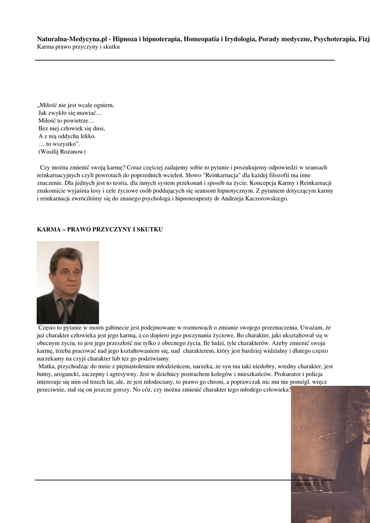 Naturalna-Medycyna.pl - Hipnoza i hipnoterapia, Homeopatia i Irydologia, Porady medyczne, Psychoterapia, Fizj Karma prawo przyczyny i skutku „Miłość nie jest wcale ogniem, Jak zwykło się mawiać… Miłość to powietrze… Bez niej człowiek się dusi, A z nią oddycha lekko. … to wszystko”. (Wasilij Rozanow) Czy można zmienić swoją karmę? Coraz częściej zadajemy sobie to pytanie i poszukujemy odpowiedzi w seansach reinkarnacyjnych czyli powrotach do poprzednich wcieleń. Słowo "Reinkarnacja" dla każdej filozofii ma inne znaczenie. Dla jednych jest to teoria, dla innych system przekonań i sposób na życie. Koncepcja Karmy i Reinkarnacji znakomicie wyjaśnia losy i cele życiowe osób poddających się seansom hipnotycznym. Z pytaniem dotyczącym karmy i reinkarnacji zwróciliśmy się do znanego psychologa i hipnoterapeuty dr Andrzeja Kaczorowskiego. KARMA – PRAWO PRZYCZYNY I SKUTKU Często to pytanie w moim gabinecie jest podejmowane w rozmowach o zmianie swojego przeznaczenia. Uważam, że już charakter człowieka jest jego karmą, a co dopiero jego poczynania życiowe. Bo charakter, jaki ukształtował się w obecnym życiu, to jest jego przeszłość nie tylko z obecnego życia. Ile ludzi, tyle charakterów. Ażeby zmienić swoja karmę, trzeba pracować nad jego kształtowaniem się, nad charakterem, który jest bardziej widzialny i dlatego często narzekamy na czyjś charakter lub tez go podziwiamy. Matka, przychodząc do mnie z piętnastoletnim młodzieńcem, narzeka, że syn ma taki niedobry, wredny charakter, jest butny, arogancki, zaczepny i agresywny. Jest w dzielnicy postrachem kolegów i mieszkańców. Prokurator i policja interesuje się nim od trzech lat, ale, że jest młodociany, to prawo go chroni, a poprawczak nic mu nie pomógł, wręcz przeciwnie, stał się on jeszcze gorszy. No cóż, czy można zmienić charakter tego młodego człowieka? strona 1 / 7 Naturalna-Medycyna.pl - Hipnoza i hipnoterapia, Homeopatia i Irydologia, Porady medyczne, Psychoterapia, Fizj Karma prawo przyczyny i skutku Tak, tylko należy ukierunkować jego agresję na sport, ring, boks, tam, gdzie istnieje potrzeba takiego charakteru i może stanąć na ringu równy z równym. I tak się stało. Ukierunkowałem go na boks i programowałem go na walkę z przeciwnikiem. Już po kilku seansach Artur zapisał się na boks i zaczął trenować. Kiedy spotkałem się z nim po kilku latach, Artur uzyskiwał świetne wyniki w boksie, także na arenie walk europejskich, został świetnym bokserem. I to jest zmiana programu życia człowieka poprzez zmianę jego charakteru. Na pewno z dotychczasowym charakterem prokurator miał przygotowane kilka artykułów dla chłopaka, ale czekał tylko na jego pełnoletniość i wiadomo, jak potoczyłyby się losy Artura. Przychodzi do mnie psycholog, Adam, lat 56, z problemem, jak sam powiada, zauroczenia. Twierdzi, że nie wierzył w miłość. Ma rodzinę, dorosłe dzieci, żonę, z którą jest ok. 30 lat w związku małżeńskim. W ubiegłym roku spotkał kobietę, Jolantę, o 10 lat młodszą od siebie. Już w czasie spotkania, po spojrzeniu w jej oczy zrozumiał, że skądś się znają, że jest ona jemu znana i odczuł coś takiego jak porażenie prądem i pojawiła się myśl: O Boże, dopadła mnie. Ale skąd, przecież jej nie znał w tym życiu, pierwszy raz się spotkali. Próbował sobie coś przypomnieć, ale nic z tego, nie mogli się spotkać, nie było takiej możliwości wcześniej. Przy każdym spotkaniu bał się jej patrzeć w oczy, w jej oczach widział głębię jej duszy, duszy ciemnych oczu, choć tak naprawdę miała niebieskie oczy. I co z tego, pytam, co ja mogę pomóc? Pan Adam relacjonuje: No właśnie, my się kochamy, ale mamy swoje rodziny, myślę ciągle o niej, jestem o nią zazdrosny, że ona może być z kimś innym. Spotykamy się, ale nie wiem, co dalej. Obawiam się, że jest to coś głębokiego, na co nie mam wpływu. Chciałbym, ażeby pan przez hipnozę zastosował regresję reinkarnacyjną. Czy można uświadomić sobie problem związku karmicznego, ponieważ czuje podświadomie, że cos powinniśmy zrealizować z poprzedniego wcielenia.” Nie mogę poradzić sobie z samym sobą, nigdy nie miałem takich uczuć do kobiety, to jest szalone, zachowuję się jak zakochany młodzieniec. Chcę o niej zapomnieć, ale nie mogę. Im bardziej odcinam się od niej, tym bardziej myślę, przeżywam, tęsknię i śnię w nocy o niej. I muszę cos z tym zrobić, bo nie poradzę sobie żyć tak dalej.” Następnie w rozmowie pan Adam prosi o regresję reinkarnacyjną i pomoc w zapomnieniu o tej kobiecie. No cóż, regresja reinkarnacyjna uświadamia, że ich związek karmiczny ciągnie się od Egiptu, od piramid. On był kapłanem, a ona ważną księżniczką z zamożnej rodziny. Spotykali się potajemnie i ich związek nigdy nie mógł być zrealizowany. On był o 20 lat starszy od niej, ona zamężna. Następne wcielenie – Włochy, Rzym, jakaś wyspa. Są również razem. On ponownie kapłanem, ona bogata arystokratka mająca wpływy w rządzie na wyspie podbitej przez Rzymian, czasy ok. X wieku. Polityka ich dzieli i łączy, ona doradza w sprawach rządowych. strona 2 / 7 Naturalna-Medycyna.pl - Hipnoza i hipnoterapia, Homeopatia i Irydologia, Porady medyczne, Psychoterapia, Fizj Karma prawo przyczyny i skutku Są dalej kochankami, ona umiera przed 30 rokiem życia. Następne wcielenie - Francja, ona ponownie wpływowa kobieta, żona wpływowego oficera wojsk napoleońskich XVIII stulecie. Ona umiera ok. 45 roku życia. On również jest kapłanem. Jest przy jej łożu śmierci, przyrzeka, że spotkają się jeszcze. A jej męża nie ma w tym czasie, jest na wojnie. Ostatnie wcielenie - Rosja, Sankt Petersburg XX stulecie, widzą siebie razem, pracują w Instytucie badawczo naukowym . On jest szefem, ona pracownik naukowy - laborant, choruje na gruźlicę. Są kochankami, ona samotna, on ma rodzin